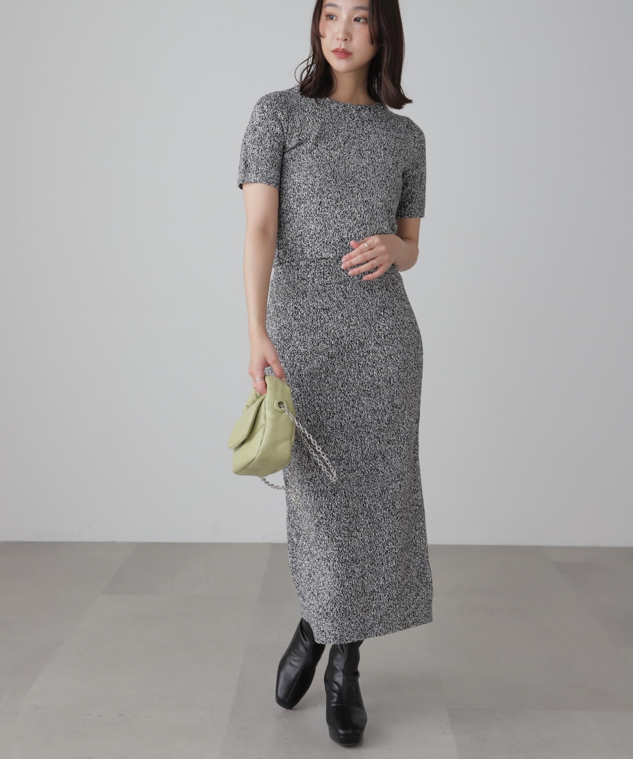 小さなカールが入ったブークレニット素材のセットアップ。ブラックは2色使いで豊かに仕上げました。トップスは、トレンドライクコンパクトなクロップド丈でスタイルアップもするサイジング。スカートはタイトなシルエットながらも程よい肉感の素材でラインを拾いすぎません。ウエストはゴム仕様で優しい着心地もうれしい。セットでワンピのように着るのはもちろん、それぞれ単品使いが可能で、スタイリングの幅を広げてくれるのもうれしいポイント。