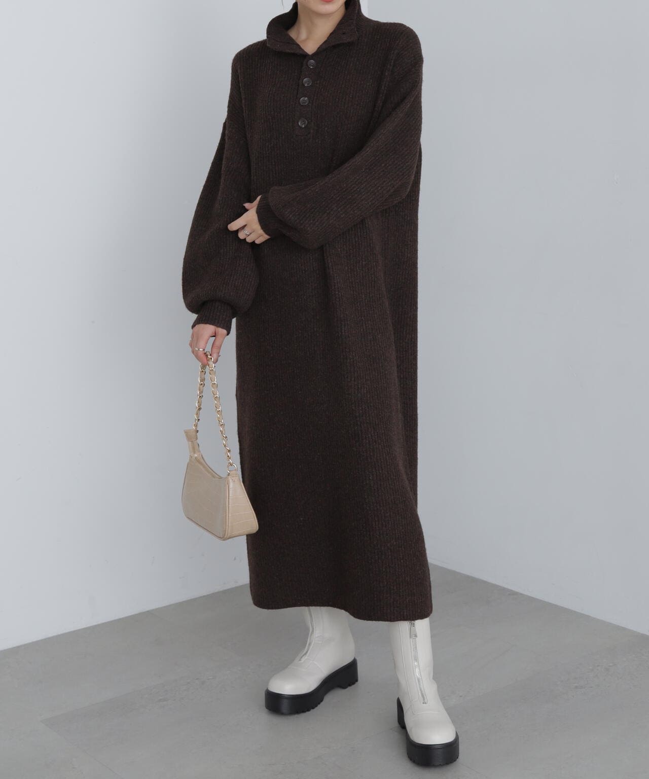 スタンドヘンリーネックに、ゆとりのある身幅がかわいいロングニットワンピース。リブ編みでスッキリとした印象ですが、体のラインを拾わないシルエットです。バックスリットで足さばきもよく、カジュアルなこなれ感のあるフロントボタンがポイント。柔らかい濃淡のメランジ感で重くなりすぎず、雰囲気ある大人かわい1枚です。ハイネックからボタンを開けてオープンカラーとしてや、シアーハイネックやシャツをレイヤードさせて楽しむのもオススメ。足元はブーツを合わせるだけでスタイリングが決まり、ラフに着ていただけます。