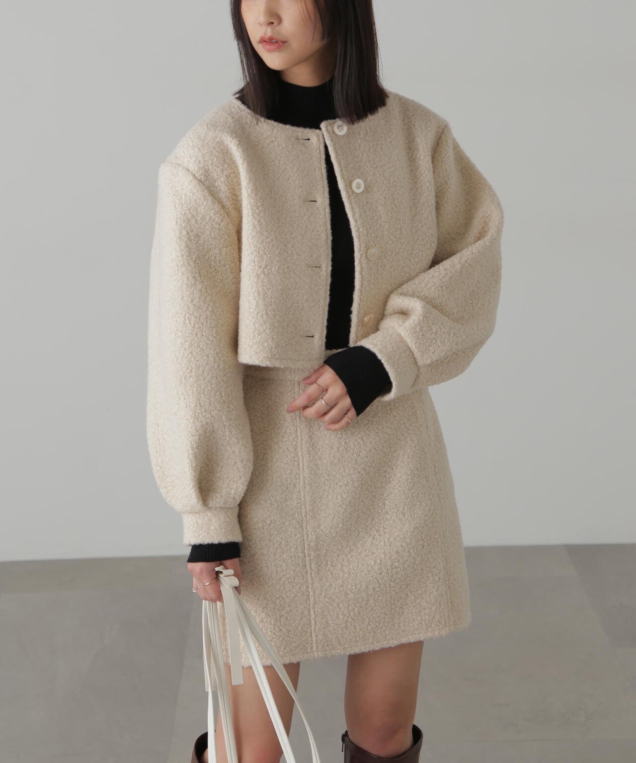 ミニブークレ素材を使用したカーディガンとミニスカートのセットアップ。カーディガンは布帛の縫製仕様にしているので、ブルゾン感覚で着ていただけます。肉感はありつつ、柔らかさもあるので、真冬はコートインとしても。単品使いもしやすく、幅広いスタイリングを楽しんでいただけます。セットアップで着る時はロングブーツ合わせがおススメ。カーディガンはクロップド丈なので、単品でハイウエストのワイドパンツと合わせるとスタイルアップを叶えてくれます。