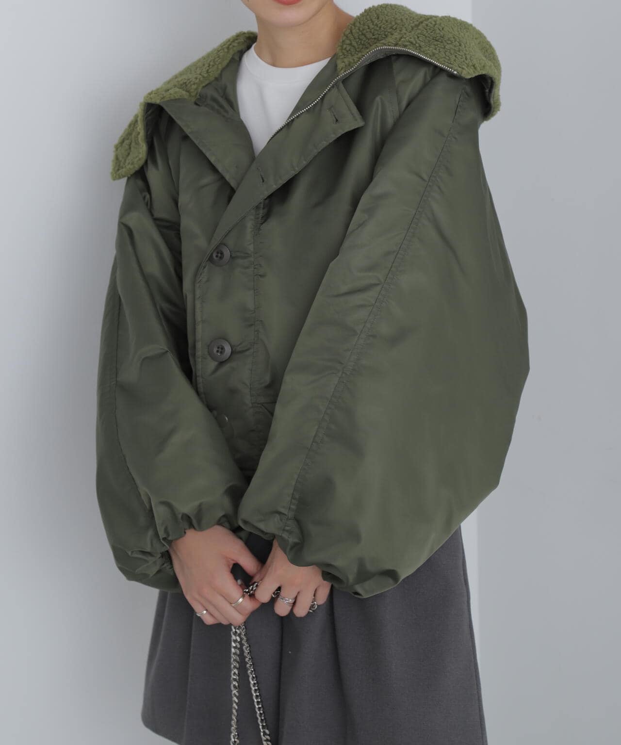 ミリタリーな「N2-B」フライトジャケットを現代らしいフォルムでアレンジした防寒ブルゾン。襟の後ろにZIPをあしらい、閉めるとフードに、オープンにすると二分割され、ボア面が出るデザインです。裏地には中綿入りで軽量ながら防寒にも優れています。きゅっとギャザーを寄せた裾リブで、パフっとしたフォルムがポイント。バルーンスリーブの内側はリブなので、袖口をたくし上げた時のたまり具合が可愛く出るようにしています。アームホールはゆったりめの作りなので、インナーに厚手ニットも着られます。ローゲージのニットやスウェットなどのルーズなトップスに、ミニスカートやワイドパンツを合わせ、カジュアルスタイルやY2Kスタイルがおススメです。