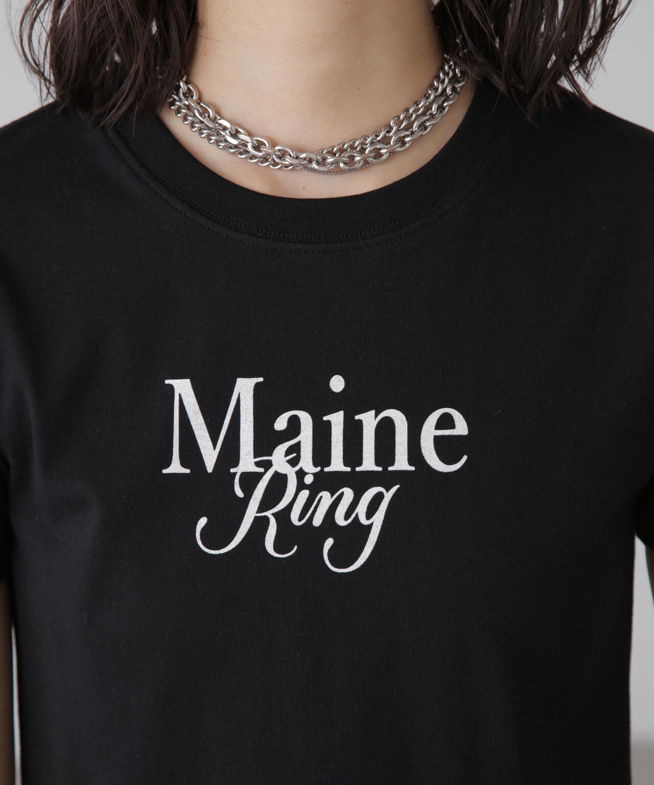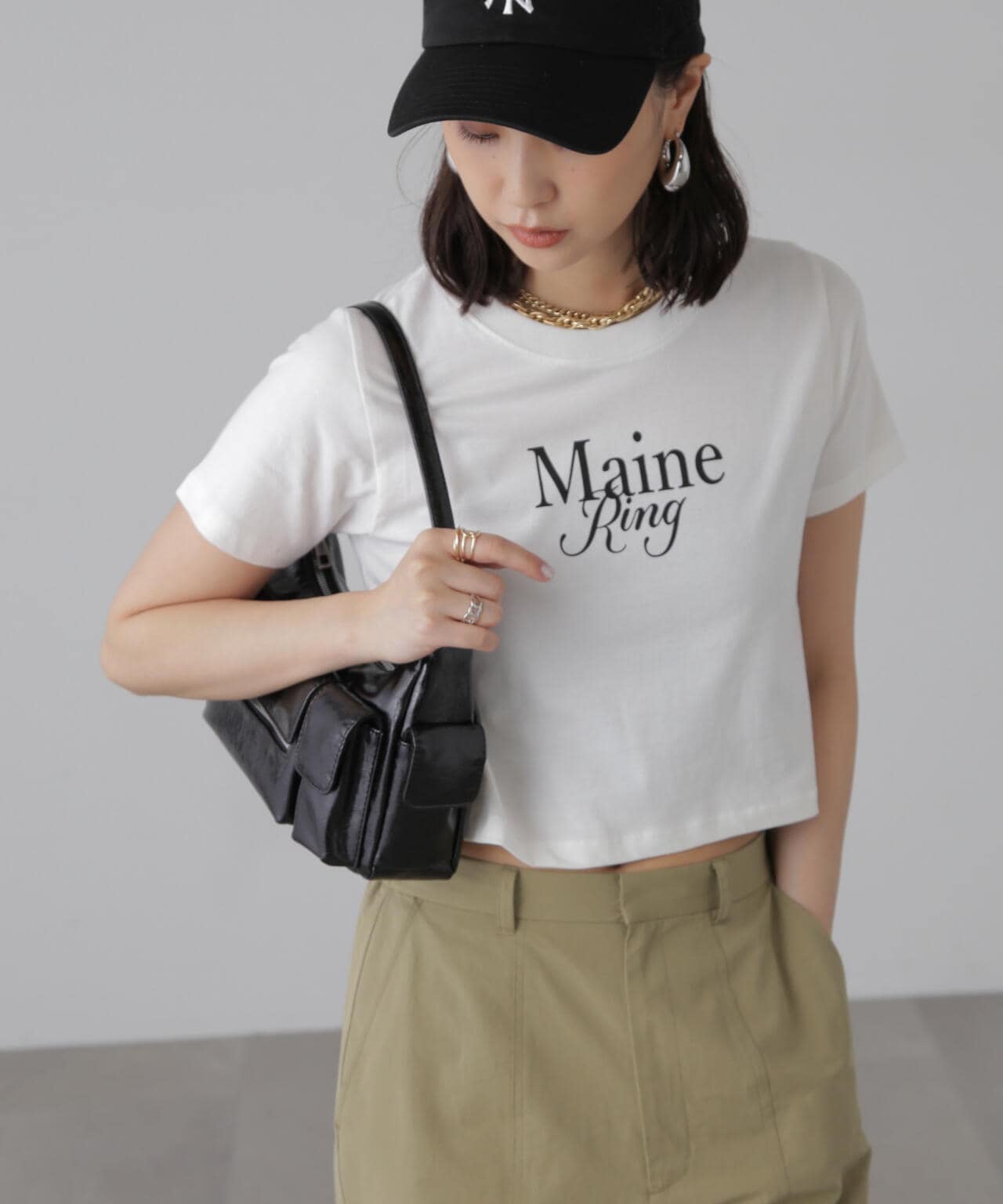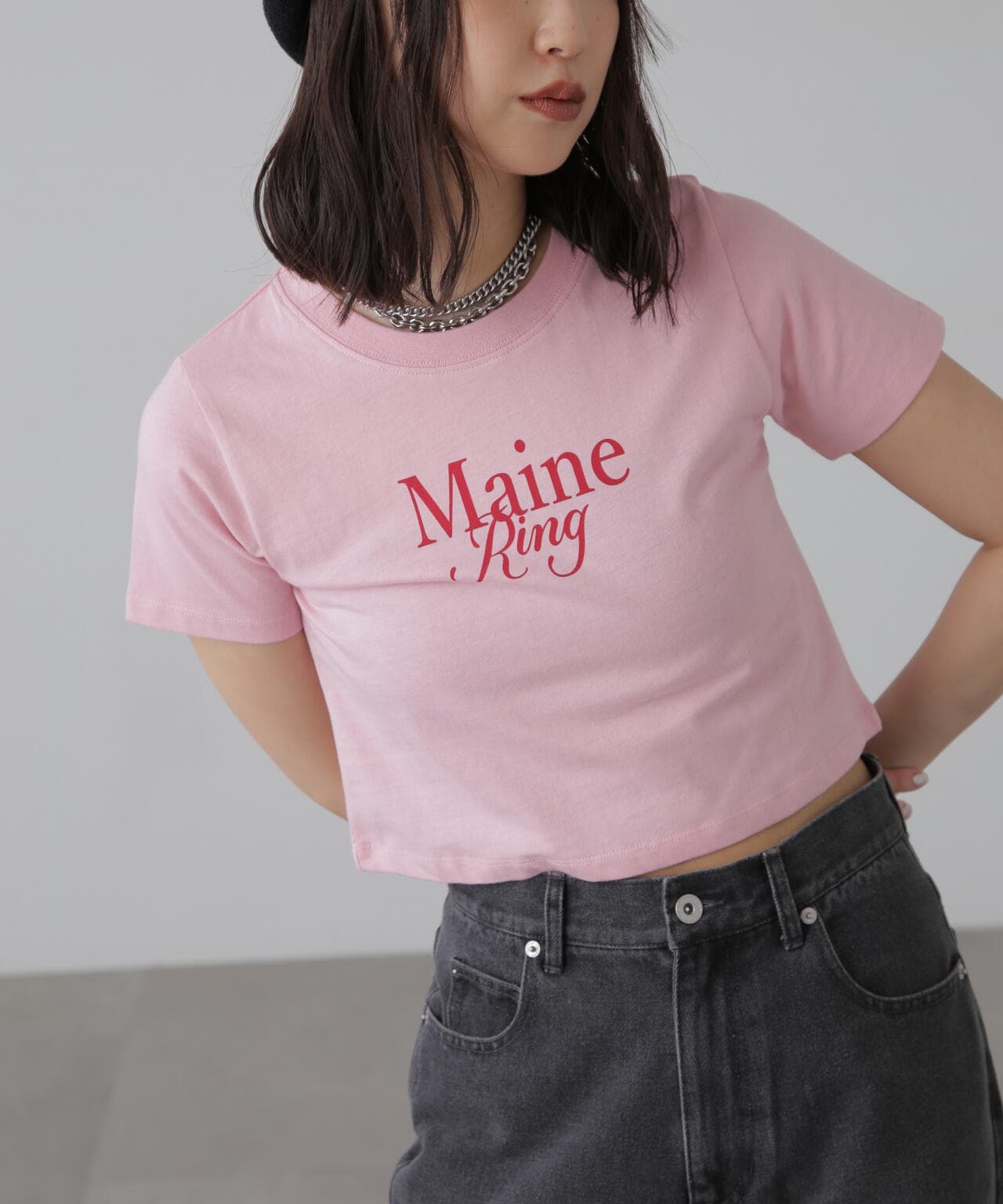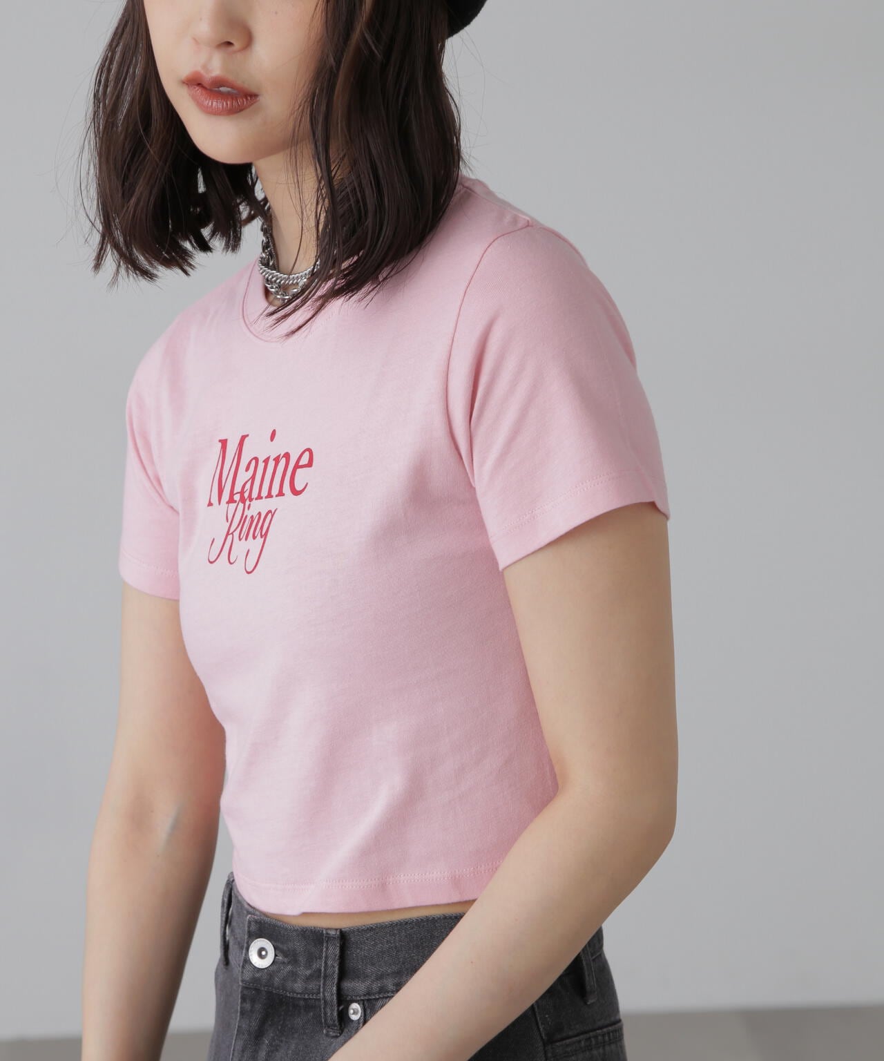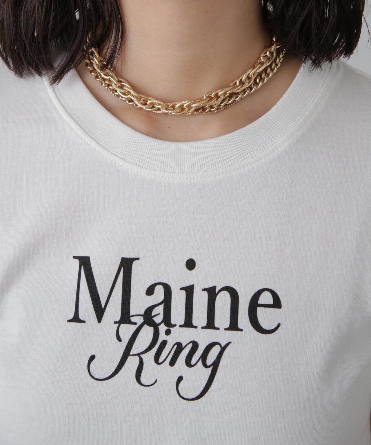 コンパクトなサイズ感が可愛いショート丈のロゴTシャツ。一枚でもキャミワンピやジャケットのインナーでも着やすいサイズ感で、万能に使えるアイテム。インしなくてもバランスの良い丈感なので、ネックレスのみプラスするだけで可愛らしく決まります。ロゴはどんなコーデにも合わせやすいようにシンプルですが、セリフ体とブロック体を合わせたおしゃれ見えするデザインです。※ロゴの意味「Main Ring 主役のリング」着心地がいい綿天竺生地を使用。