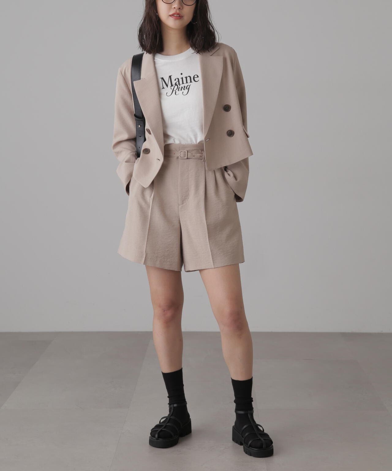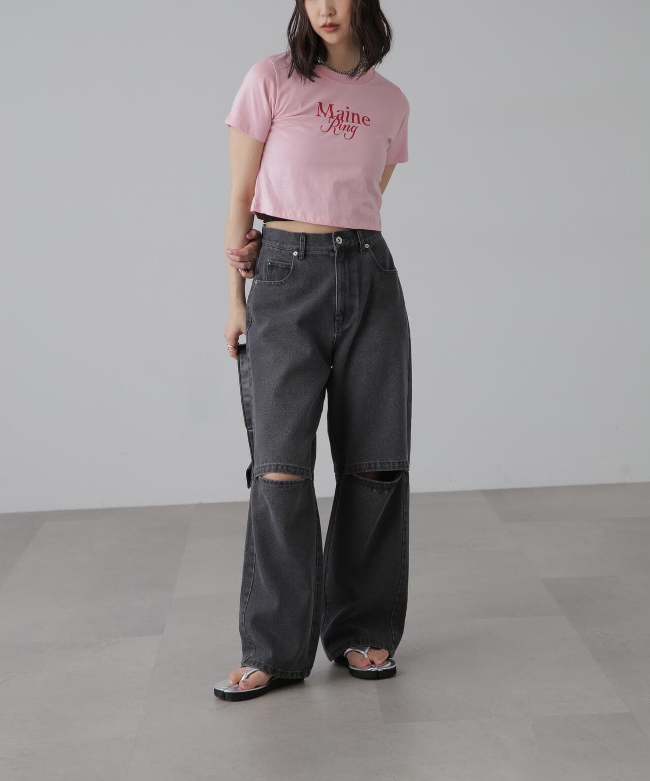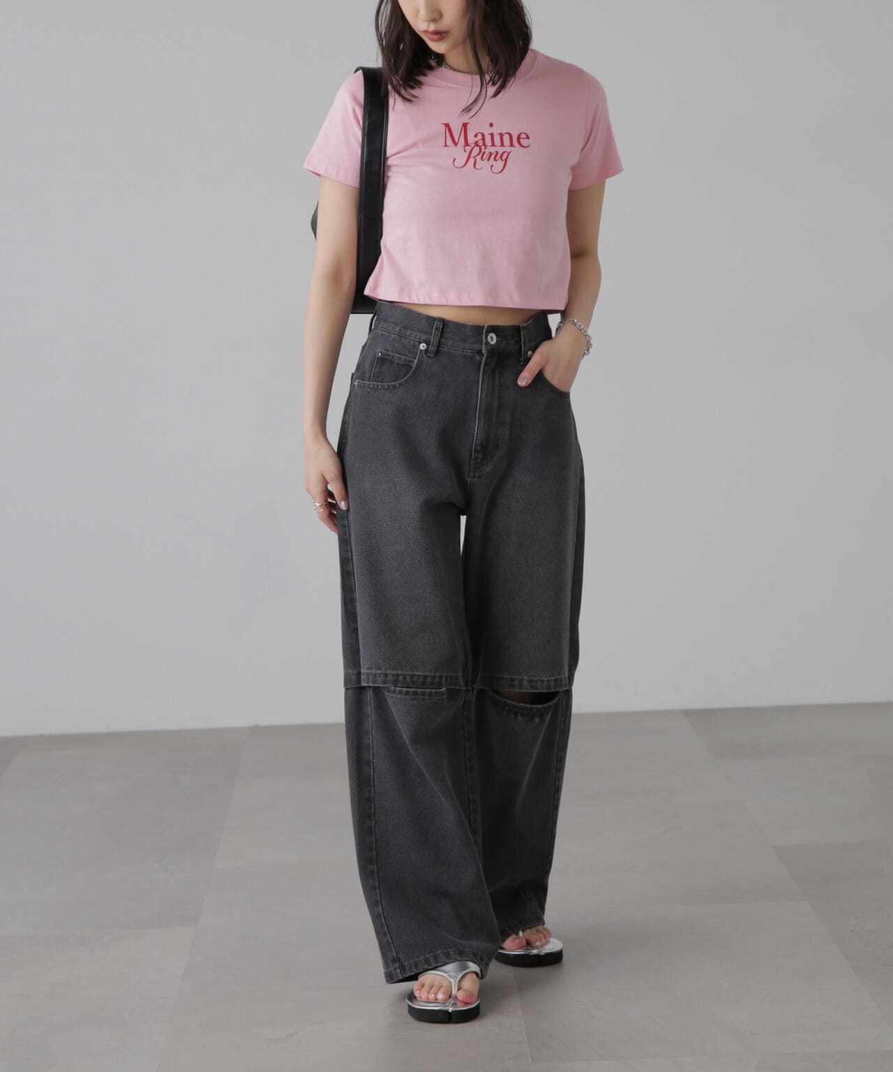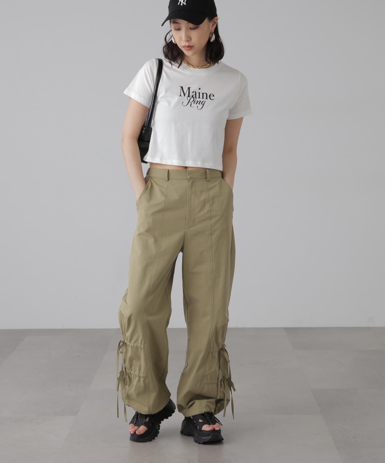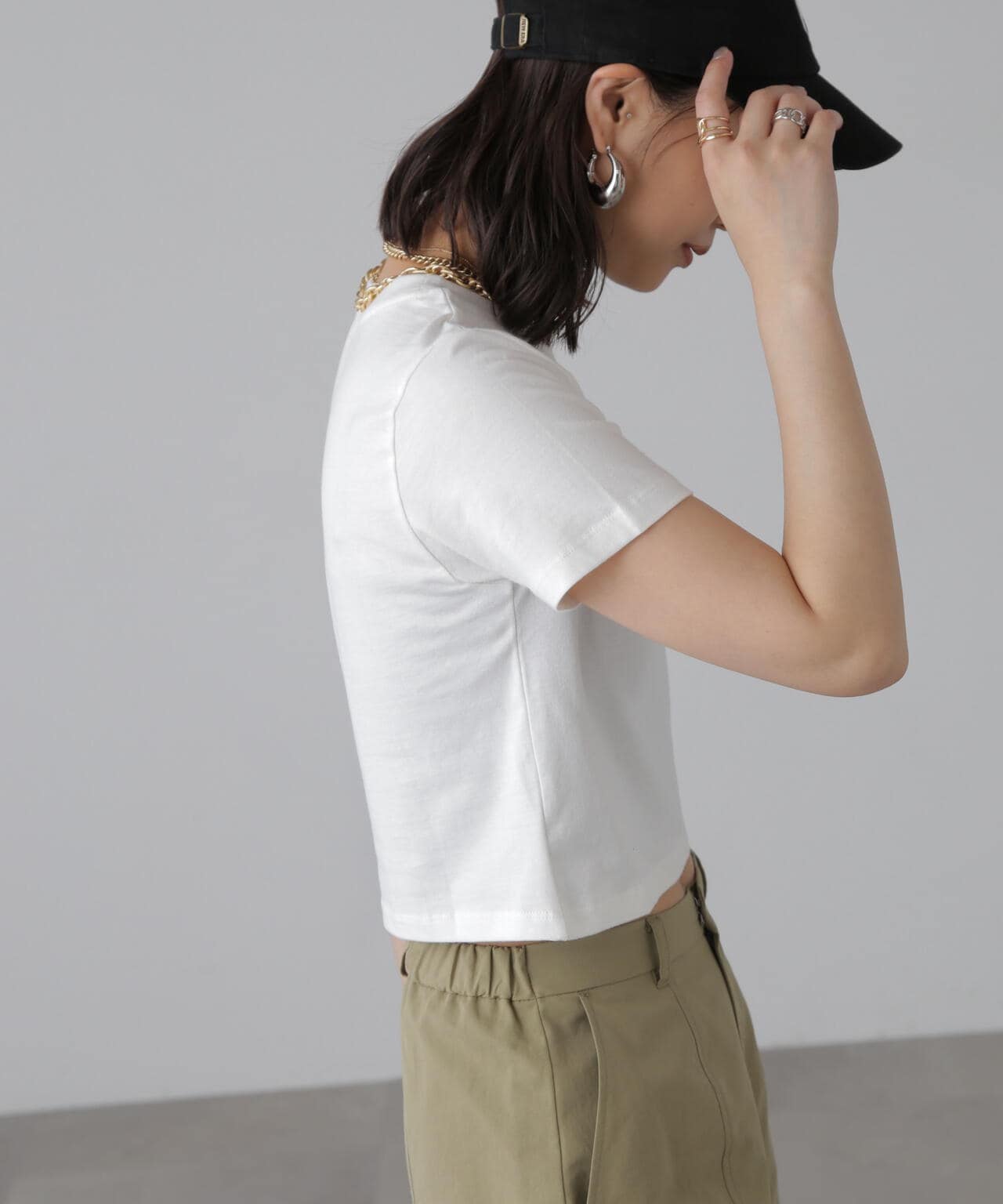 コンパクトなサイズ感が可愛いショート丈のロゴTシャツ。一枚でもキャミワンピやジャケットのインナーでも着やすいサイズ感で、万能に使えるアイテム。インしなくてもバランスの良い丈感なので、ネックレスのみプラスするだけで可愛らしく決まります。ロゴはどんなコーデにも合わせやすいようにシンプルですが、セリフ体とブロック体を合わせたおしゃれ見えするデザインです。※ロゴの意味「Main Ring 主役のリング」着心地がいい綿天竺生地を使用。
