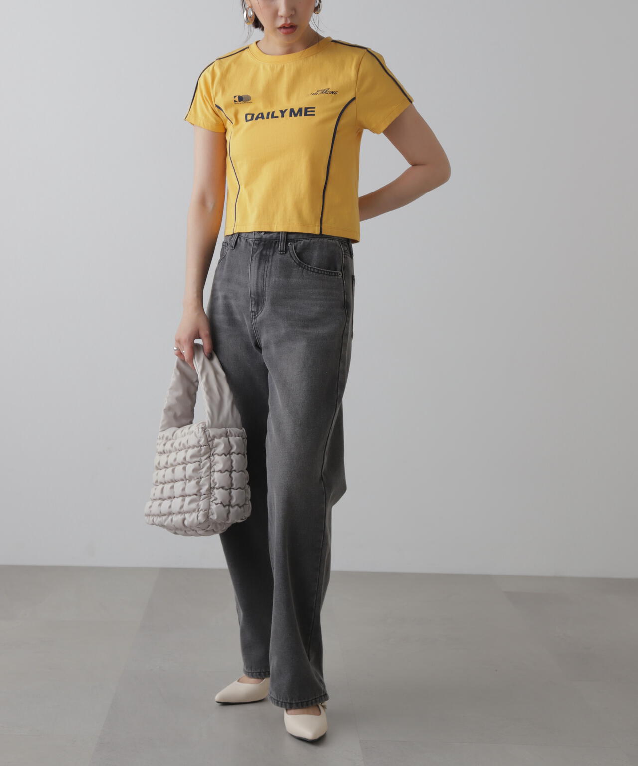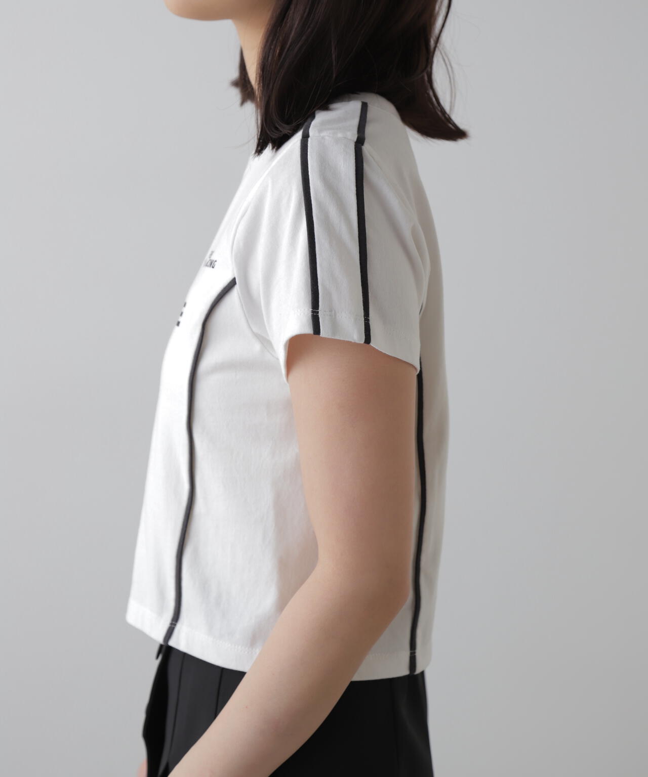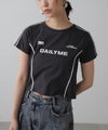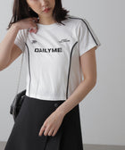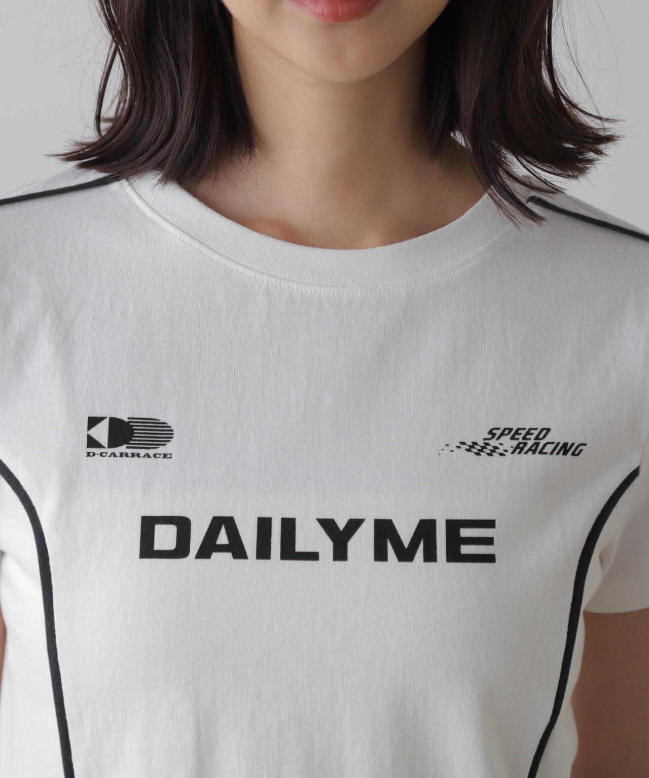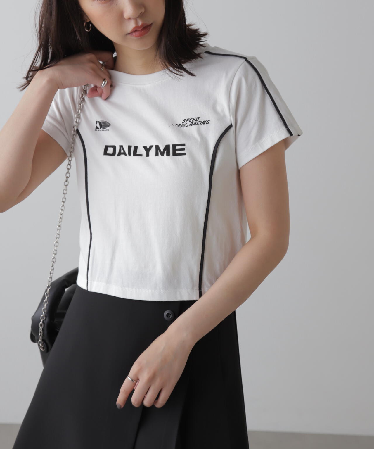 コンパクトなサイズ感のチビTにスポーツロゴを取り入れた一枚。細い配色パイピングラインを身頃と肩線に入れてアクセントに。サイズ感がとてもコンパクトなので、ダボっとしたボトムスがおすすめです。カジュアルな雰囲気のため、あえてフェミニンアイテムと合わせると今っぽく見せてくれます。※ロゴの意味、DAILYME 毎日の私