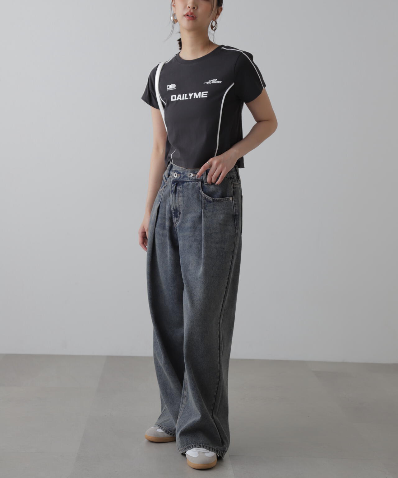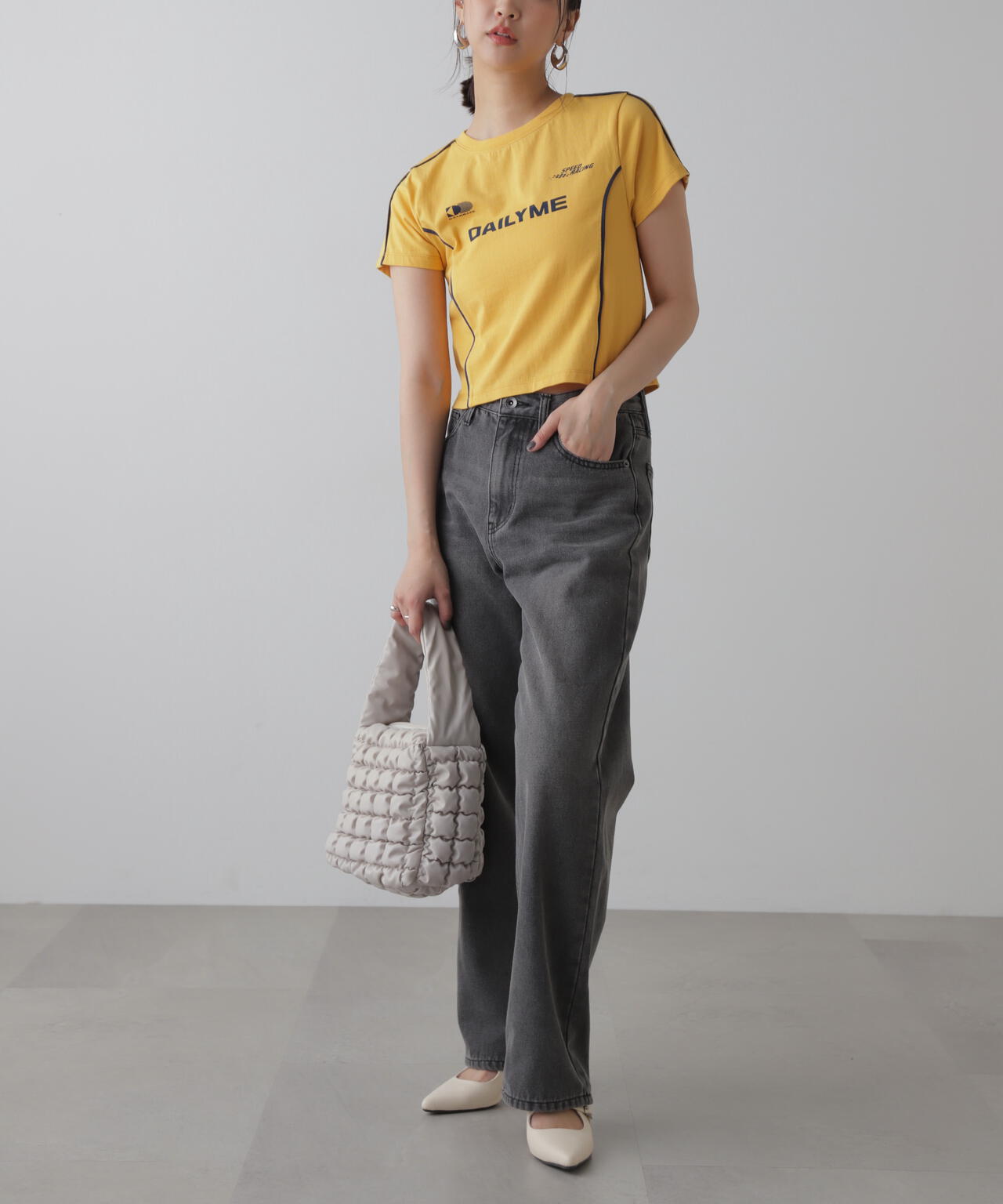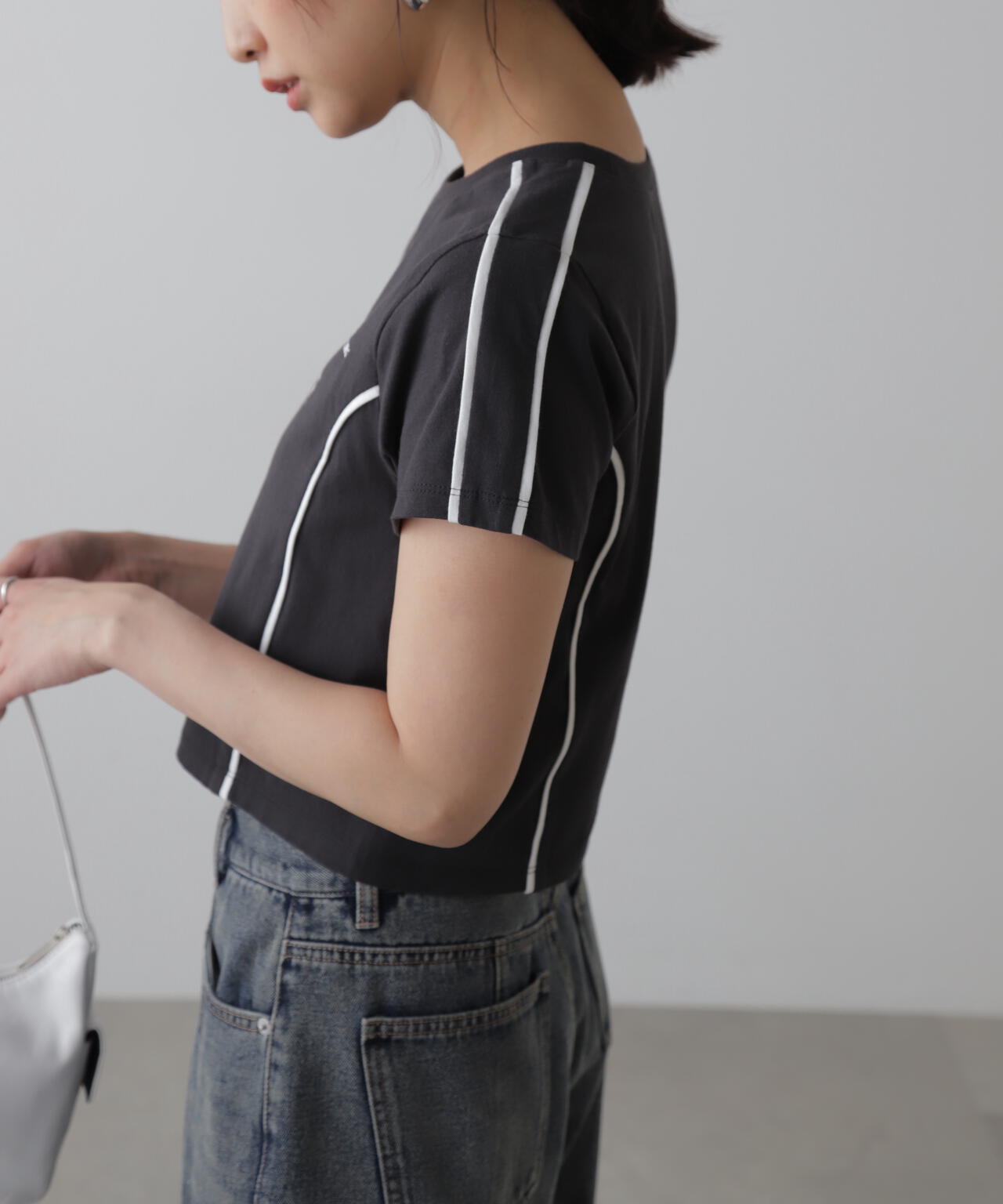コンパクトなサイズ感のチビTにスポーツロゴを取り入れた一枚。細い配色パイピングラインを身頃と肩線に入れてアクセントに。サイズ感がとてもコンパクトなので、ダボっとしたボトムスがおすすめです。カジュアルな雰囲気のため、あえてフェミニンアイテムと合わせると今っぽく見せてくれます。※ロゴの意味、DAILYME 毎日の私