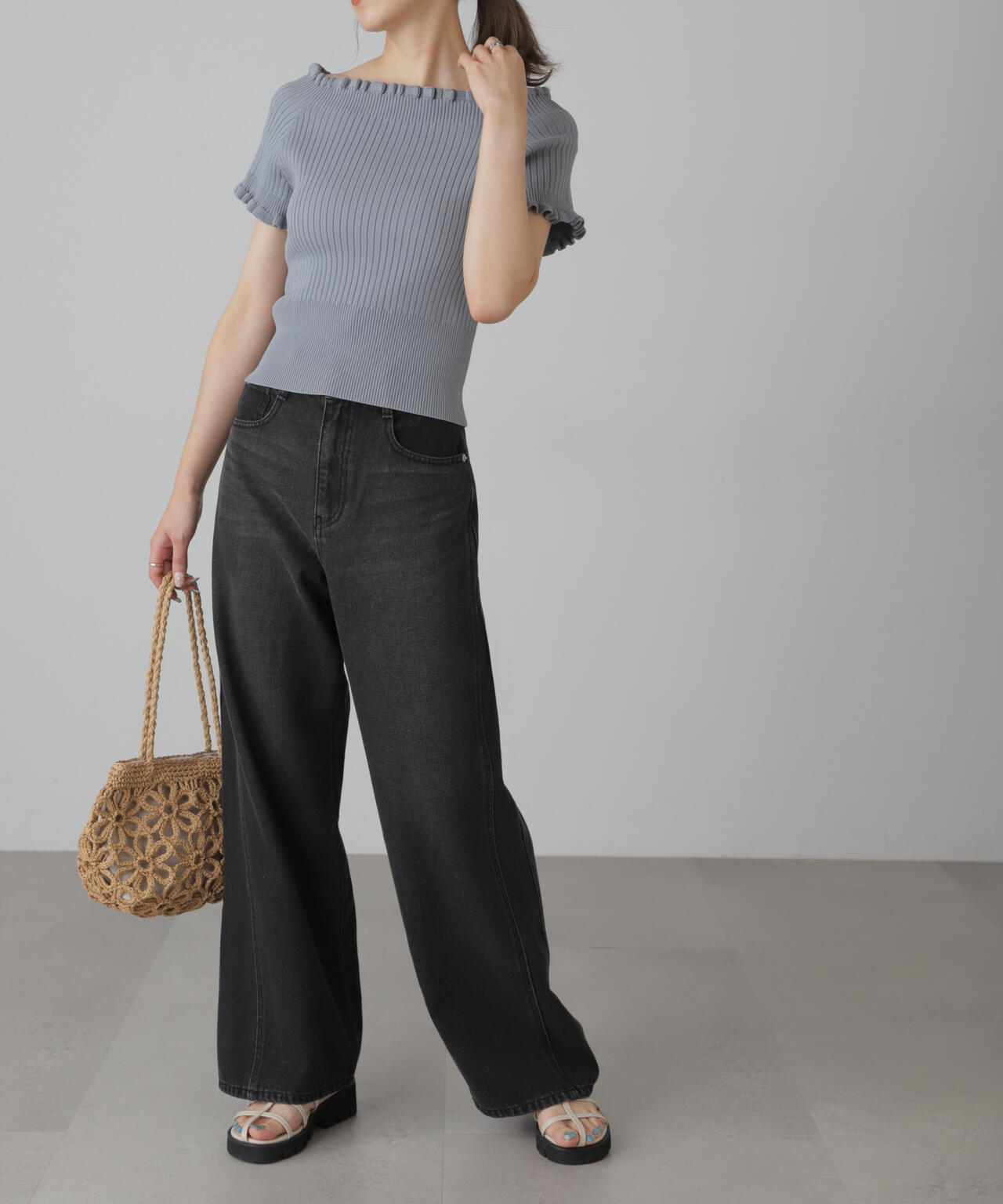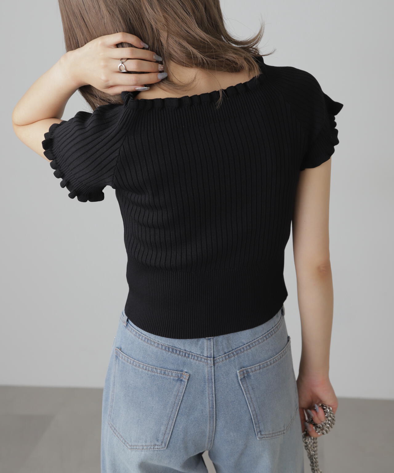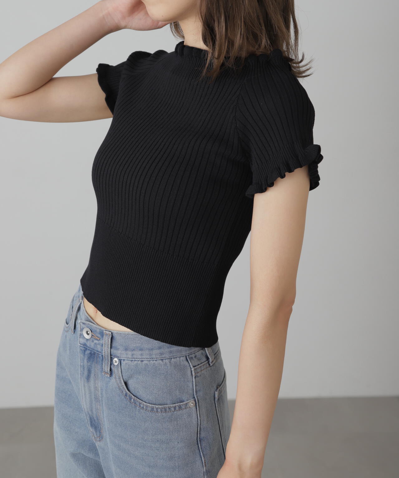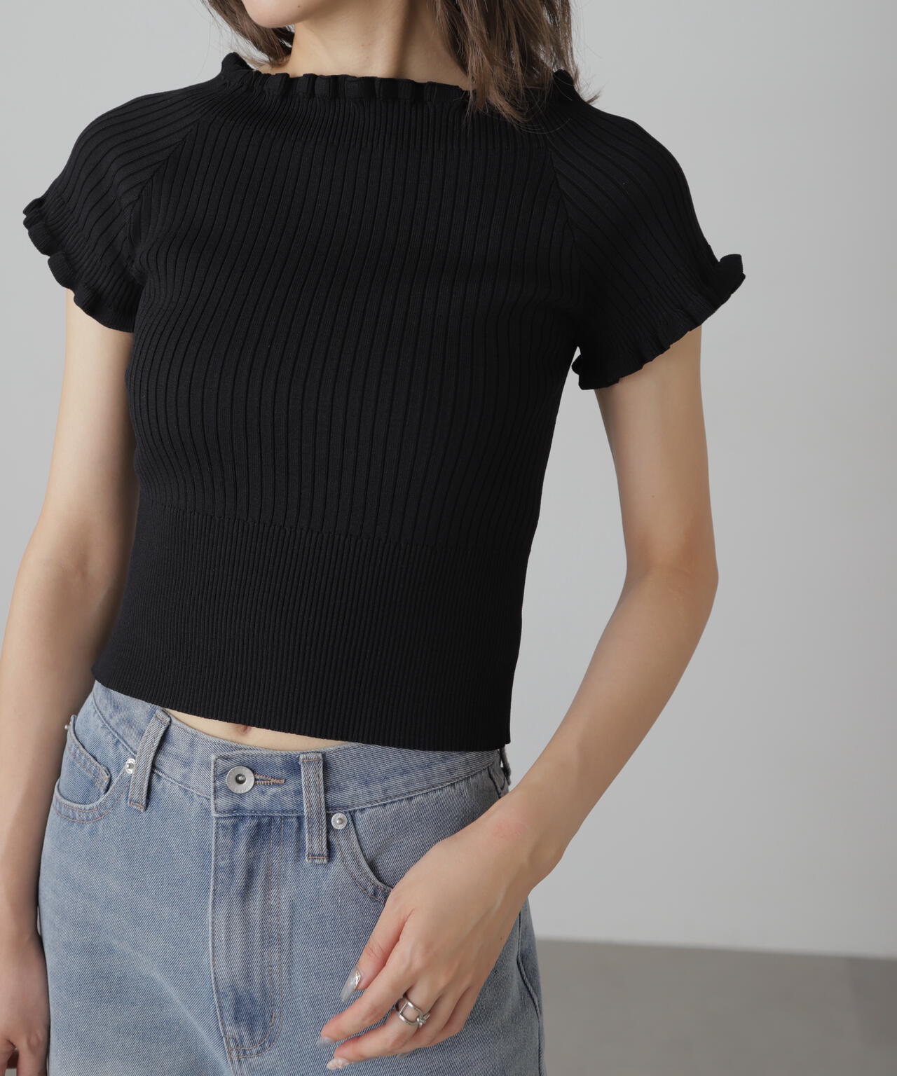 2wayオフショルフリルリブ半袖ニット