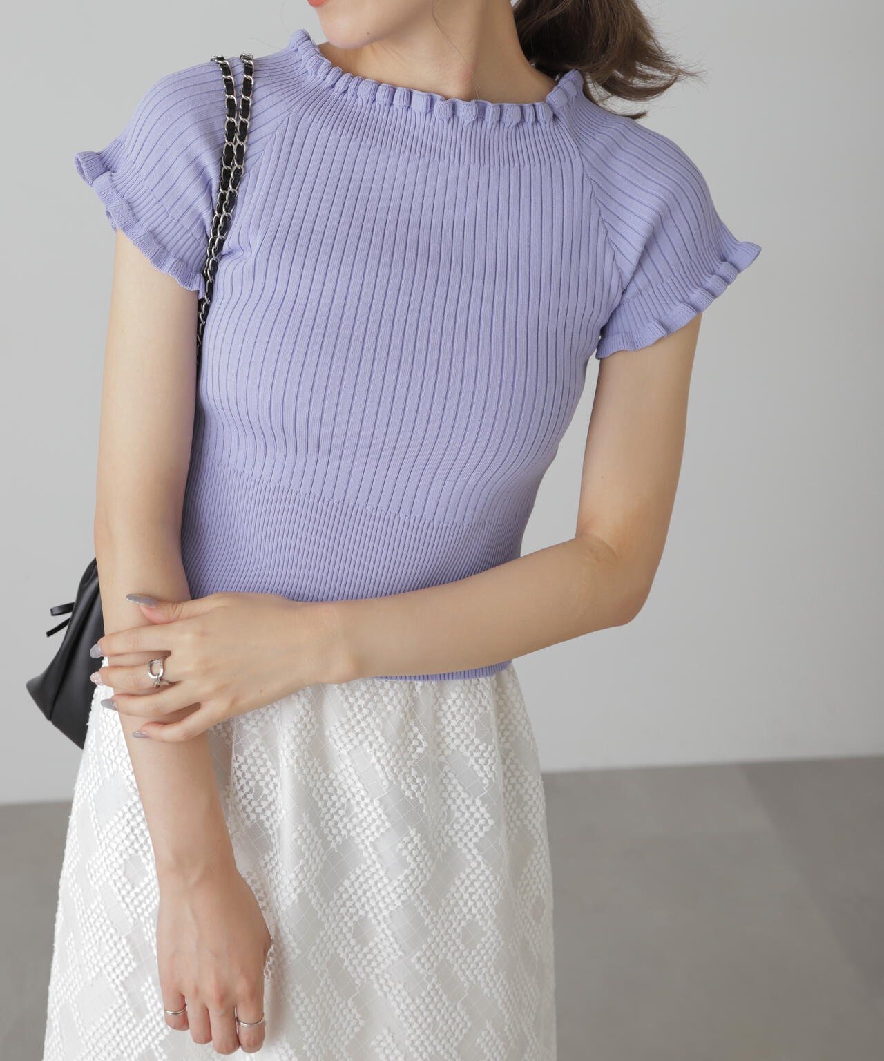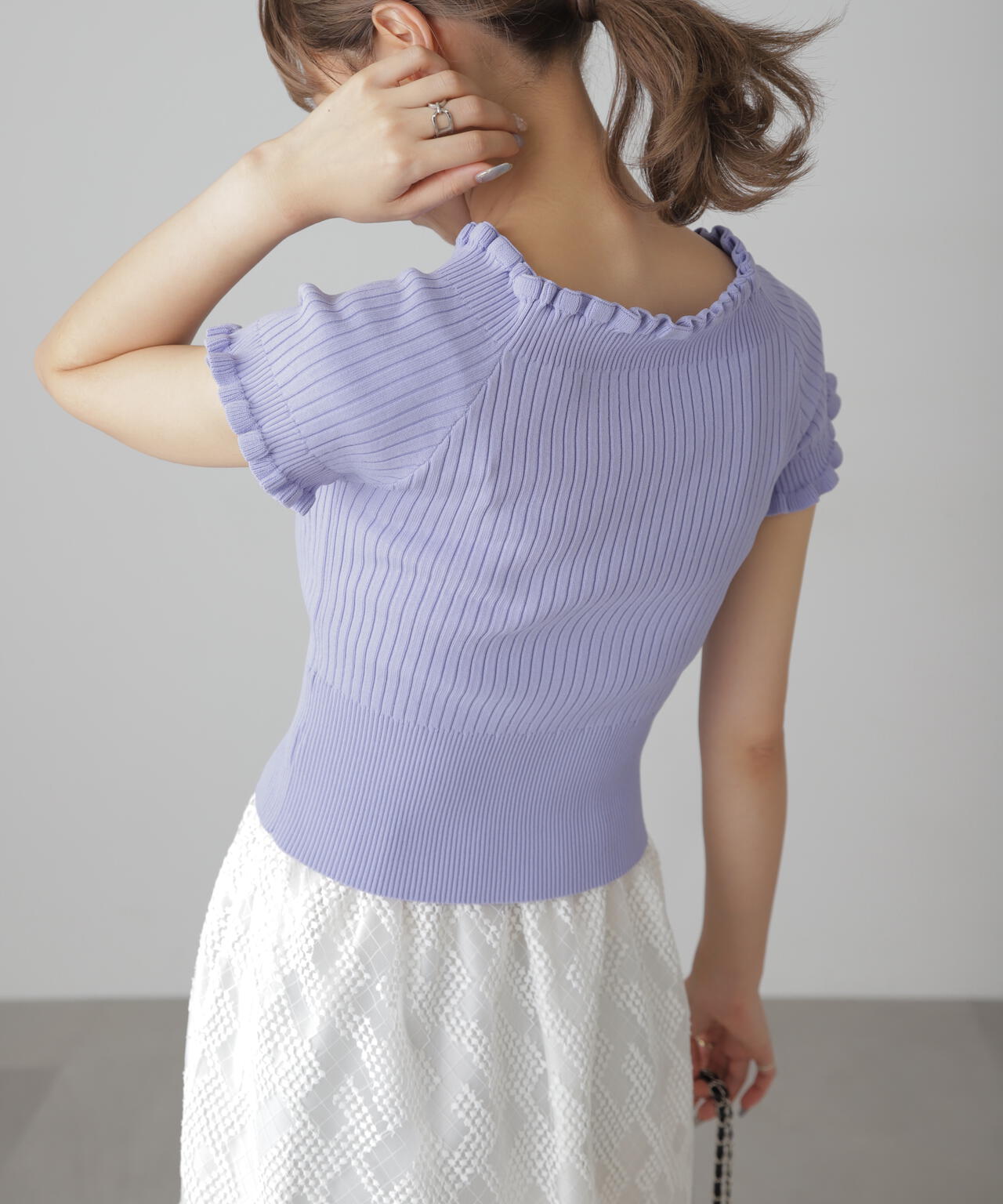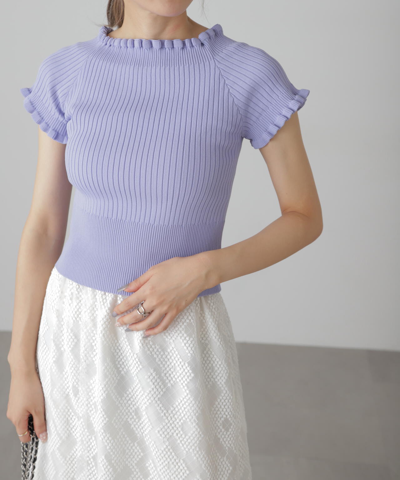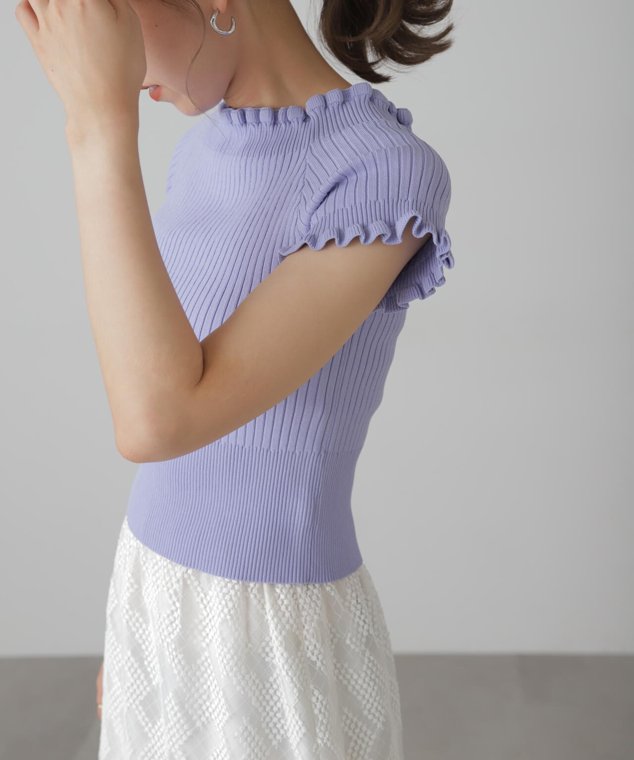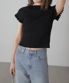 女っぽさをひと盛りできる2way半袖リブニット。浅めのスクエアネックと、肩を落とせばオフショルダーとしても違う雰囲気で着られるデザインです。ストレッチ性のある細リブ素材を使用しているので、フィット感もあり着心地も抜群です。ハイウエストボトムにインすると襟ぐりと袖口の可愛いフリルがより際立ちポイントにできます。
