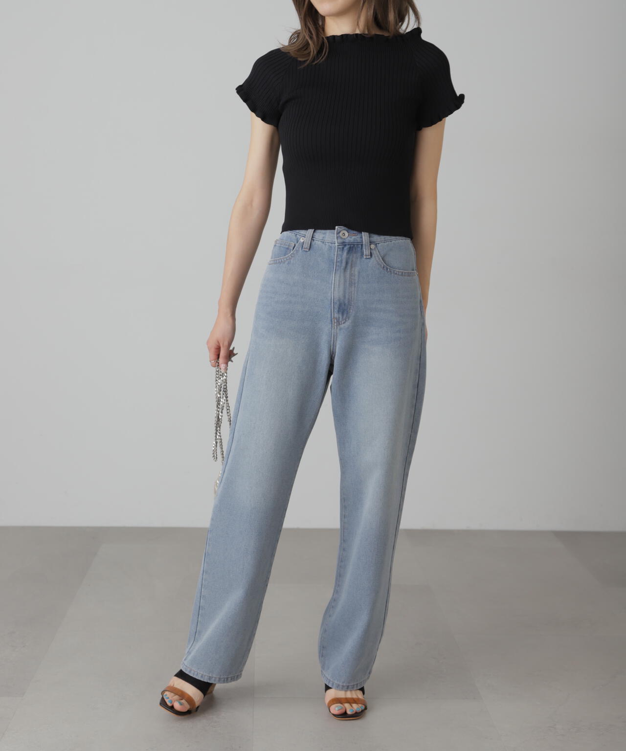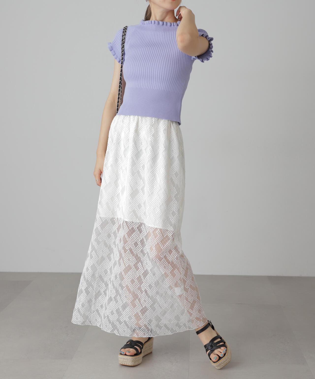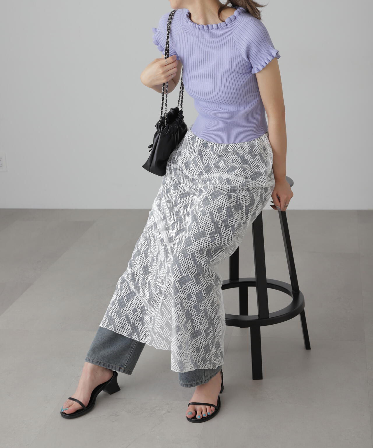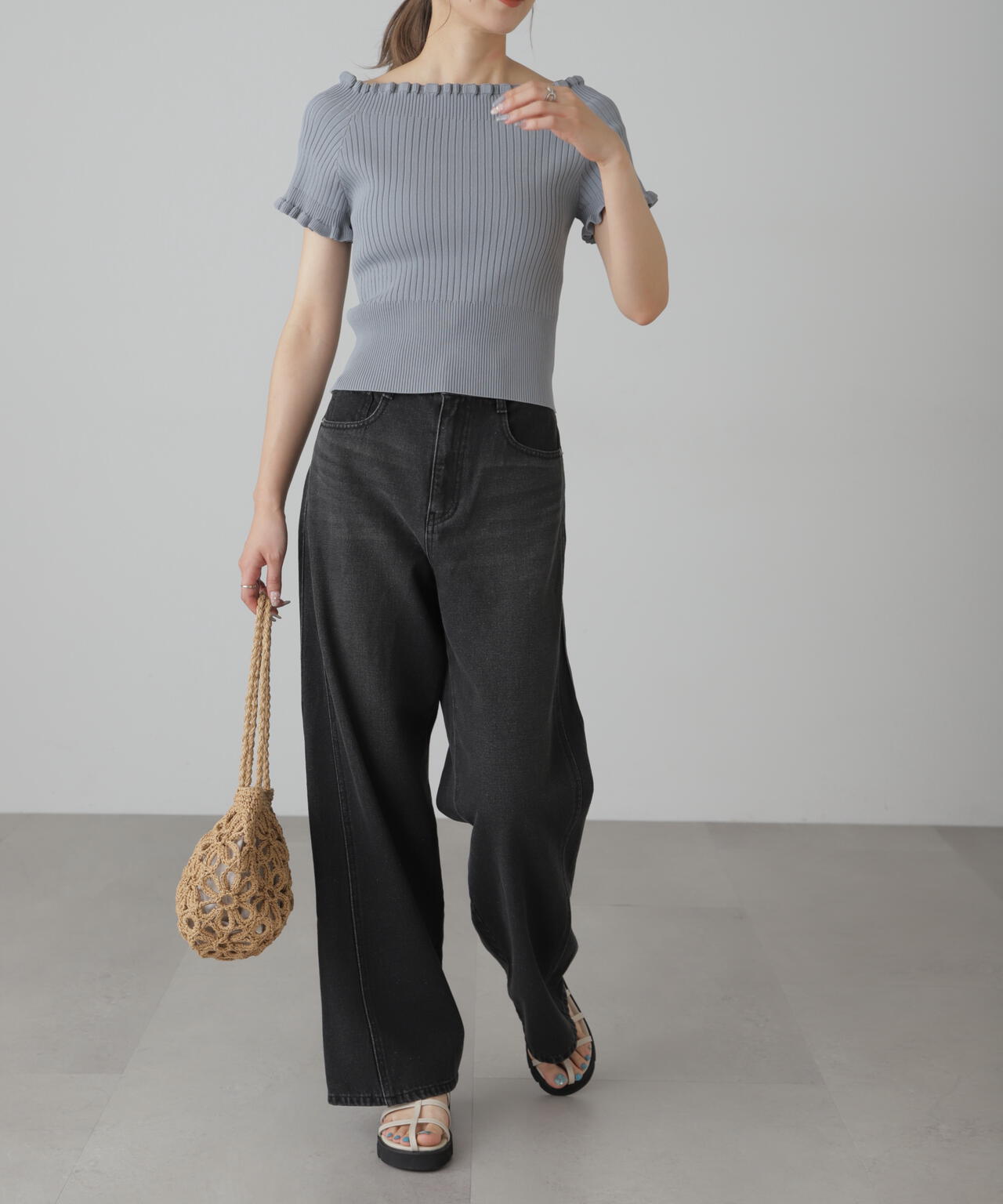 女っぽさをひと盛りできる2way半袖リブニット。浅めのスクエアネックと、肩を落とせばオフショルダーとしても違う雰囲気で着られるデザインです。ストレッチ性のある細リブ素材を使用しているので、フィット感もあり着心地も抜群です。ハイウエストボトムにインすると襟ぐりと袖口の可愛いフリルがより際立ちポイントにできます。