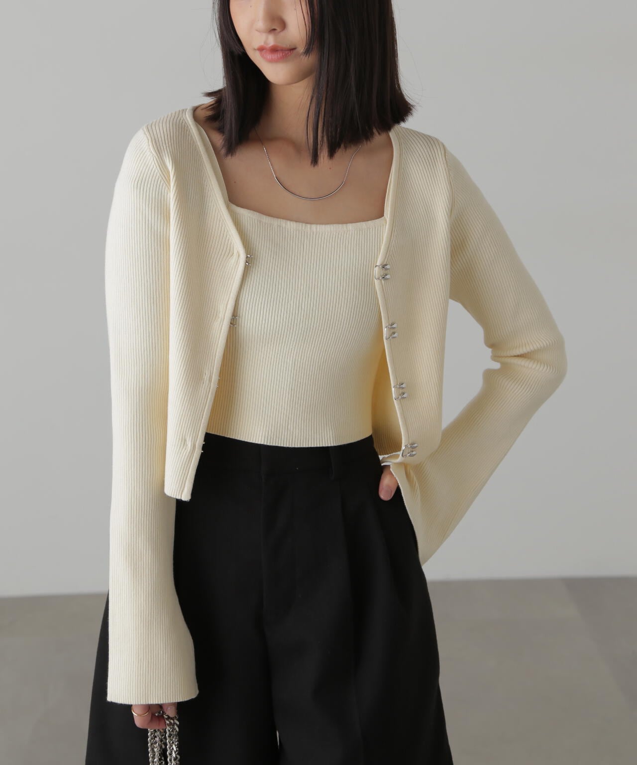 ニットカーディガンの中にキャミソールをドッキングした、2wayで着方を楽しめるレイヤードアイテム。カーディガン、インナーどちらもリブ編みにし、タイトめのシルエットで体をきれいに見せてくれます。フレア袖にはスリットを入れ、フロントボタンはエッジの効いたメタルのフックでポイントをプラス。キャミ部分は前身頃のみに内蔵されているので、キャミ部分を背面にして体を通すとカーディガンとして着られます。またキャミ部分を前身頃にして体を通すと、カーディガンの中にキャミを着た、アンサンブルのようなレイヤード風の見え方も楽しめます。