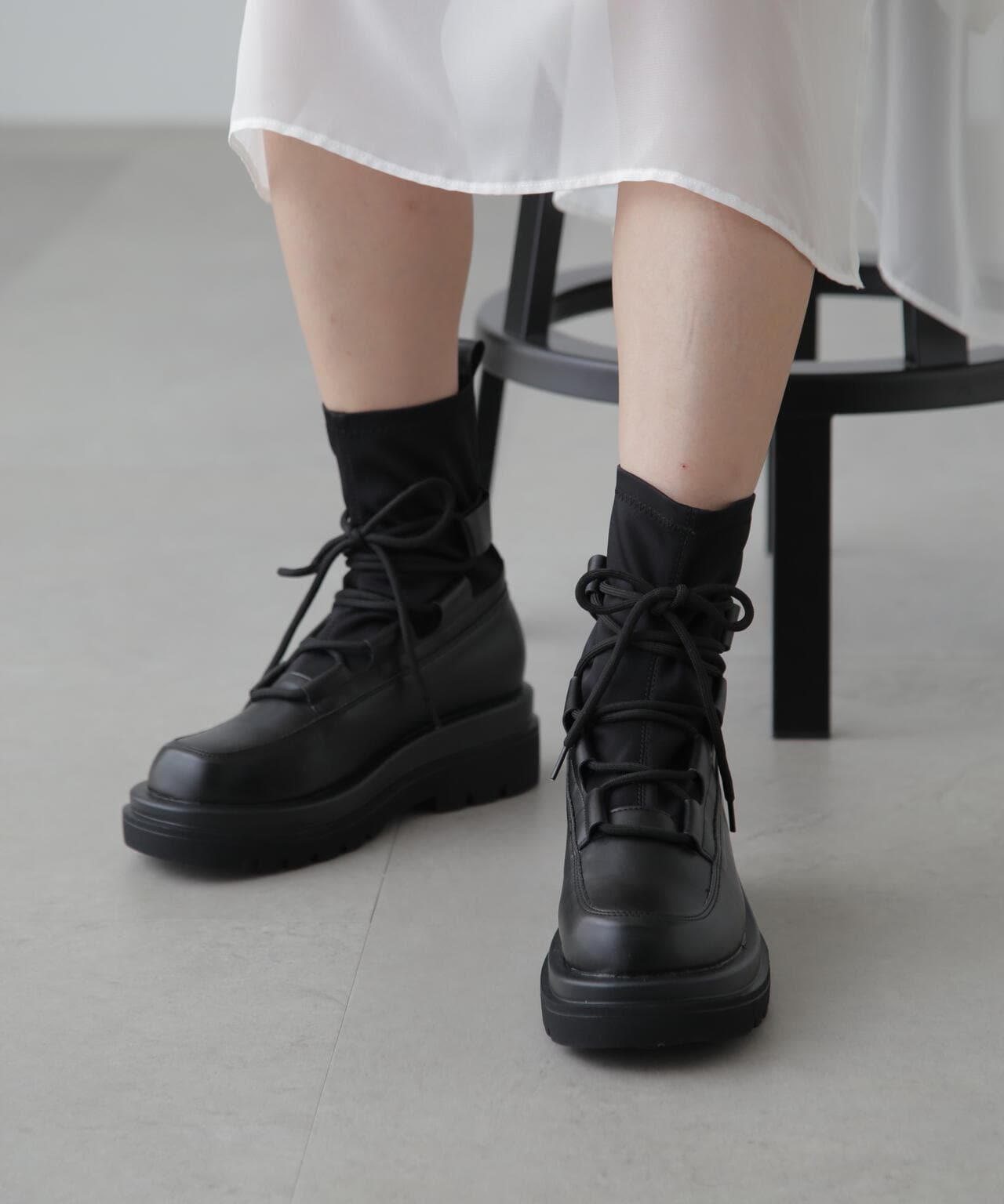 シンプルながらもトレンドをおさえたレースアップブーツ。ストレッチ素材なのでラクに着脱できます。ソールは程よい厚みがあるトラックソールを使用。前後差を付けていないので安定感があり歩きやすいのがポイントです。ショートパンツやミニスカート合わせは勿論、ロングスカートに合わせていただくのもおすすめです。