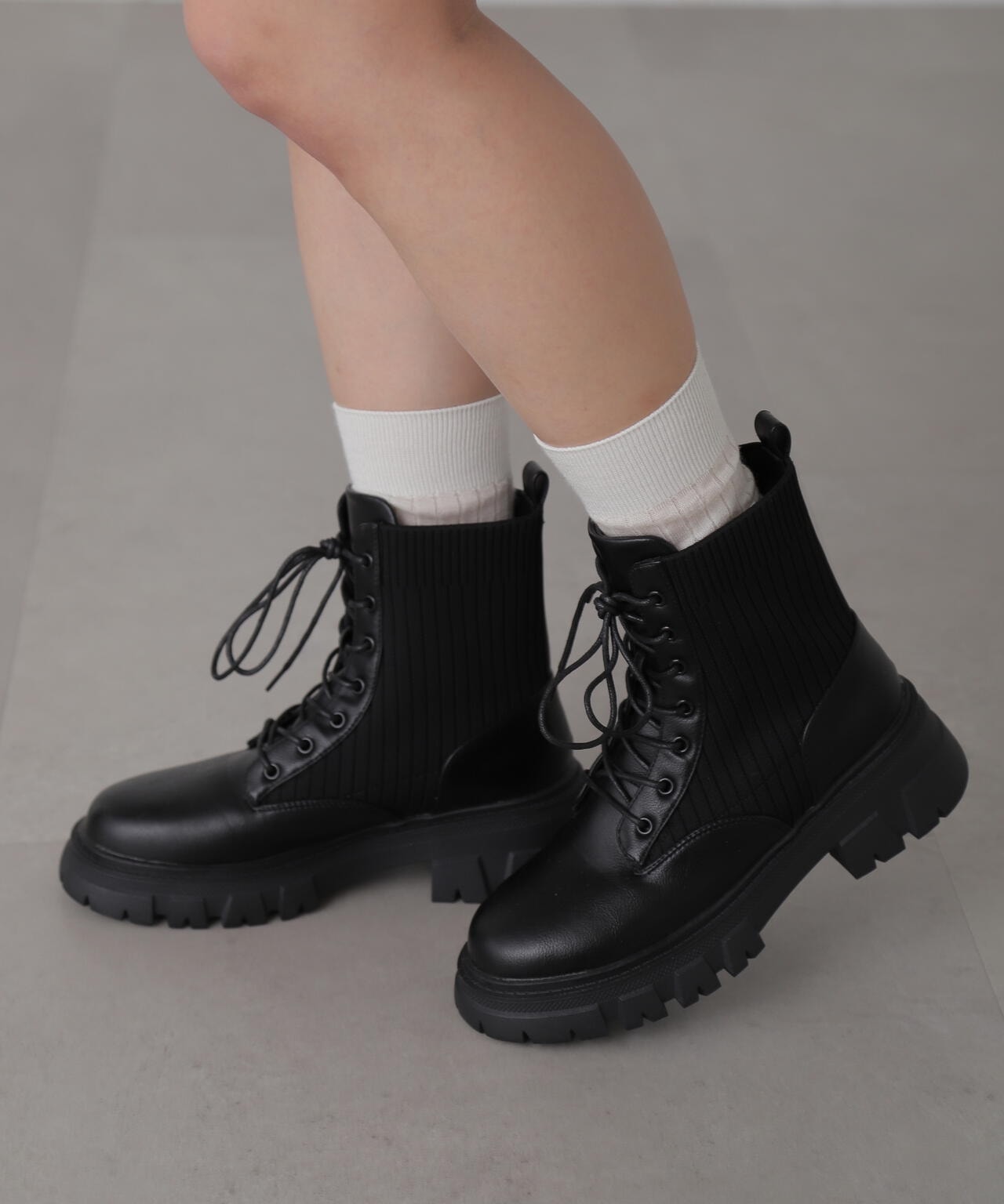 リブニット合わせのレースアップブーツは程よく足にフィットしスッキリした印象に見せてくれます。伸縮性があるので着脱がノーストレスです。グリップ力のあるトラックソールは見た目よりも軽いので履き心地は抜群。カジュアルコーデはもちろん、フェミニンなスカートやワンピースに合わせてこなれ感のあるMIXコーデもオススメです。
