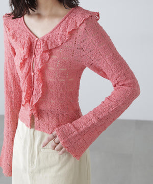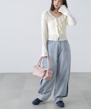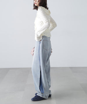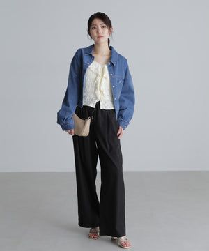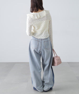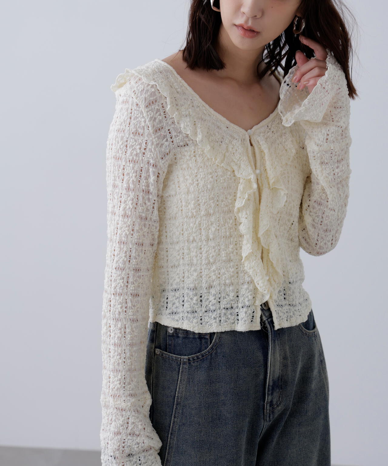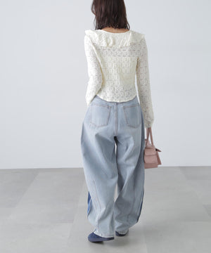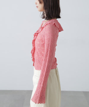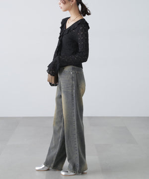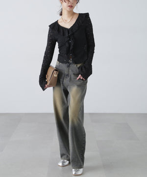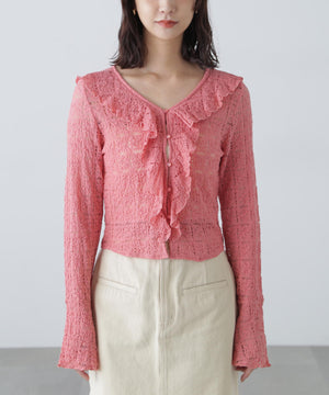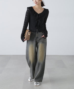 凸凹とした表情のあるヴィンテージライクなシボ感が可愛いカットレース生地のブラウス。1枚で着るのはもちろん、カーディガンやジャケットにインしても映えるデザイン。テンションがあるので着用感も良いです。スッキリと程よくフィットするシルエットに、前は小粒ボタンで開き、大ぶりのラッフルフリルで華やかな印象です。ブラストオーバーダイワイドストレートデニムパンツ(店舗商品番号)131-5130006)などの、カジュアルなボトムと合わせるのがおススメです。