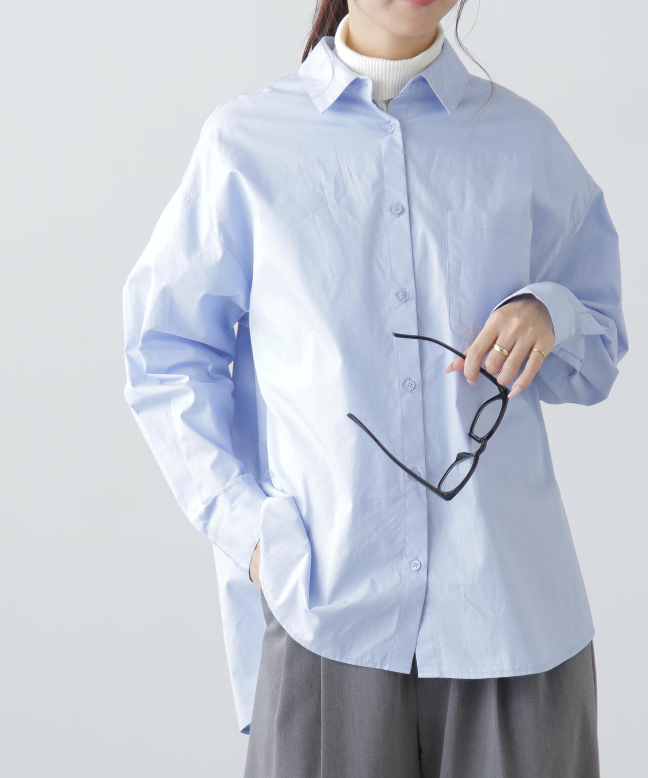 シワが気になりにくいつるっとしたタイプライター素材のビッグシャツ。シンプルながらも、左胸のみポケットを付けたデザインです。シルエットはヒップが隠れるくらいのオーバーサイズなので、暖かくなってきたら羽織りとしても使えます。カーディガンやスウェットのインナーレイヤードやビスチェのインナーとしても着回せます。