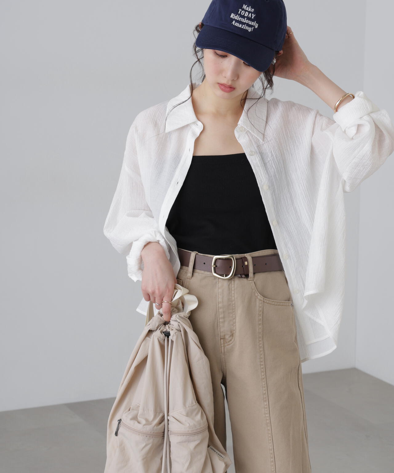 ほどよく透け感のある楊柳生地のシアーシャツ。凸凹が立体的で、コットンではなく合繊生地なので都会的な印象です。オーバーサイズですが、大きすぎず程よい丈感と身幅なので、パンツスタイルとバランスが取りやすく◎。楊柳なのでシワが目立たず、バッグインなどでも持ち運びしやすいです。ワイドなシルエットのスラックスパンツやデニムパンツとのスタイリングがおススメ。