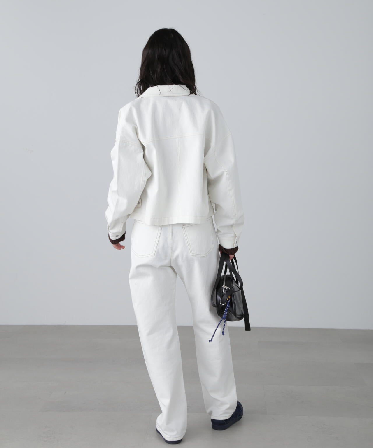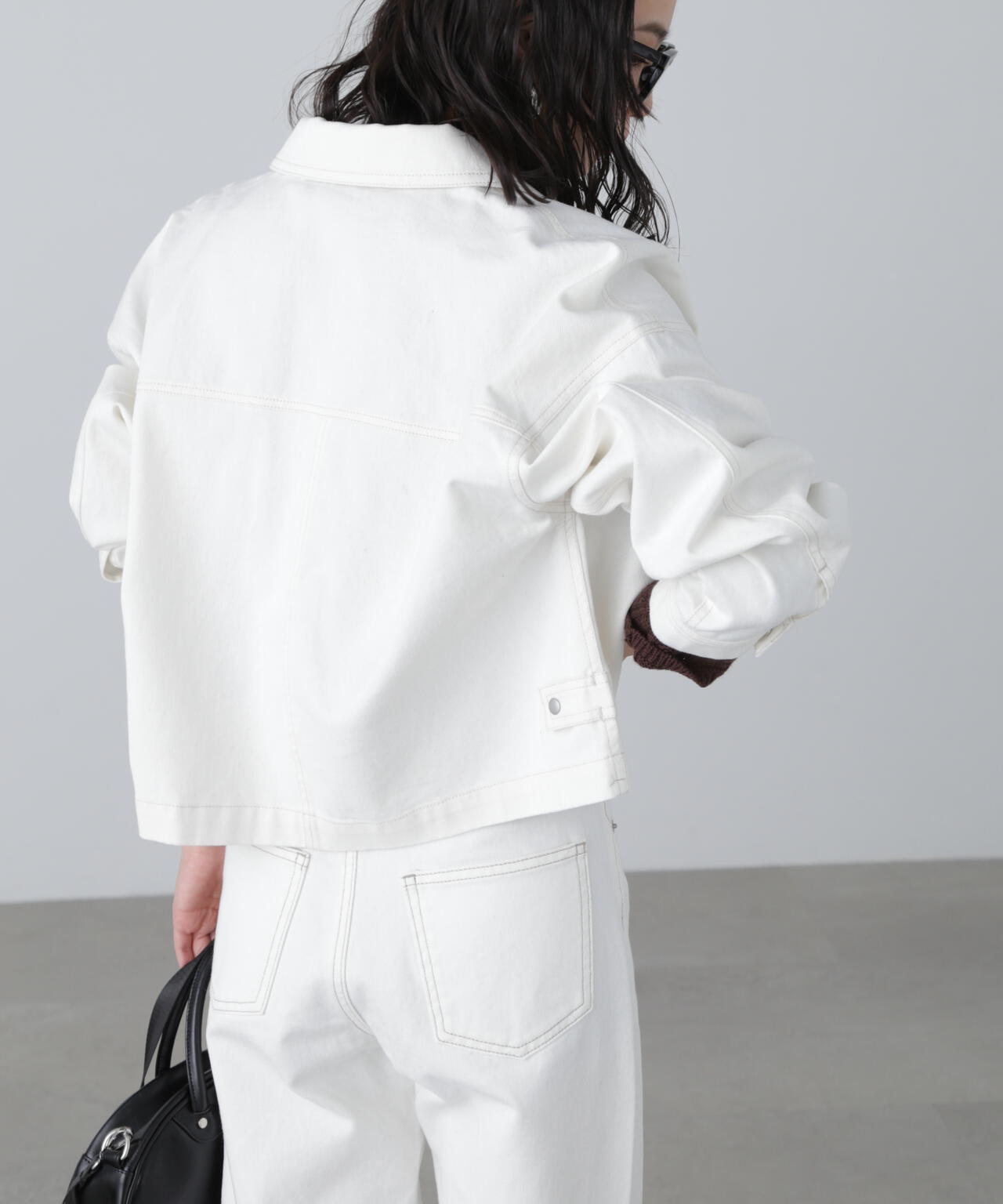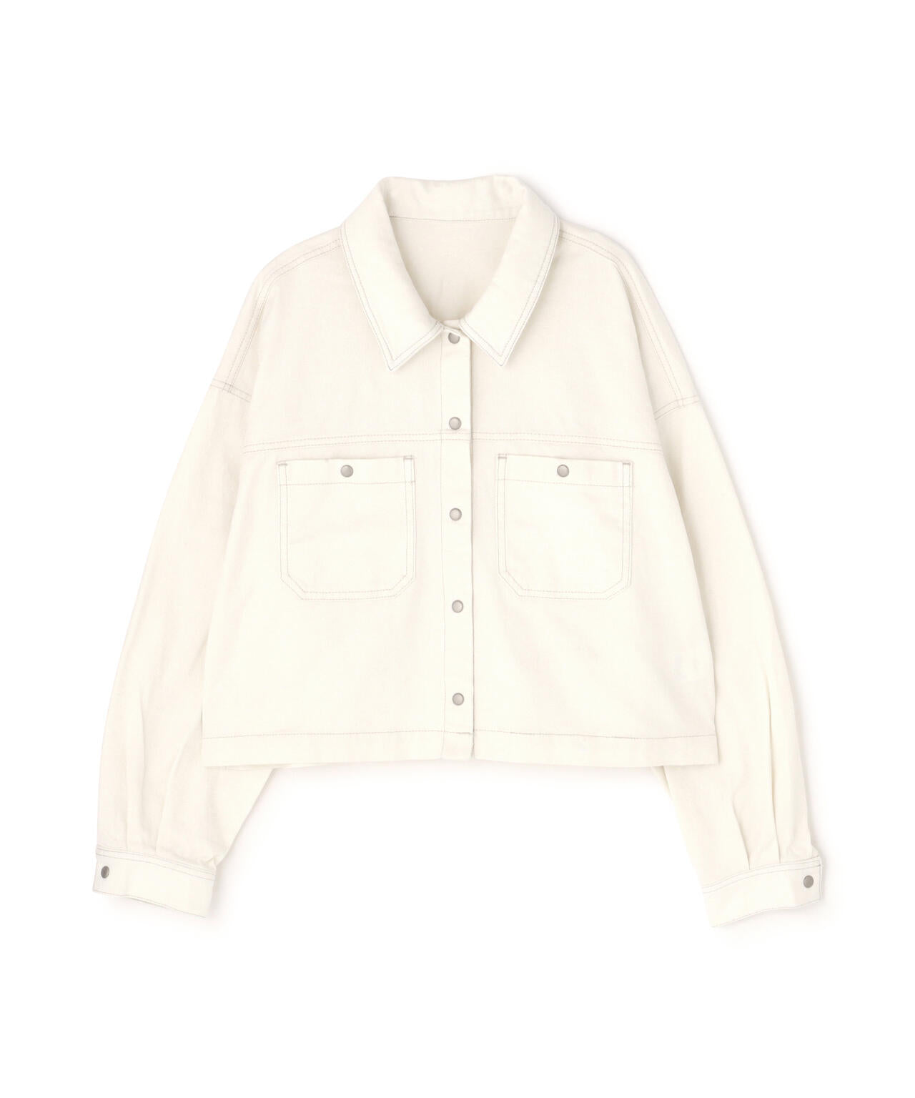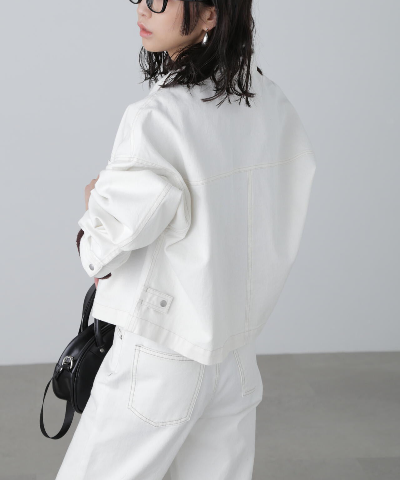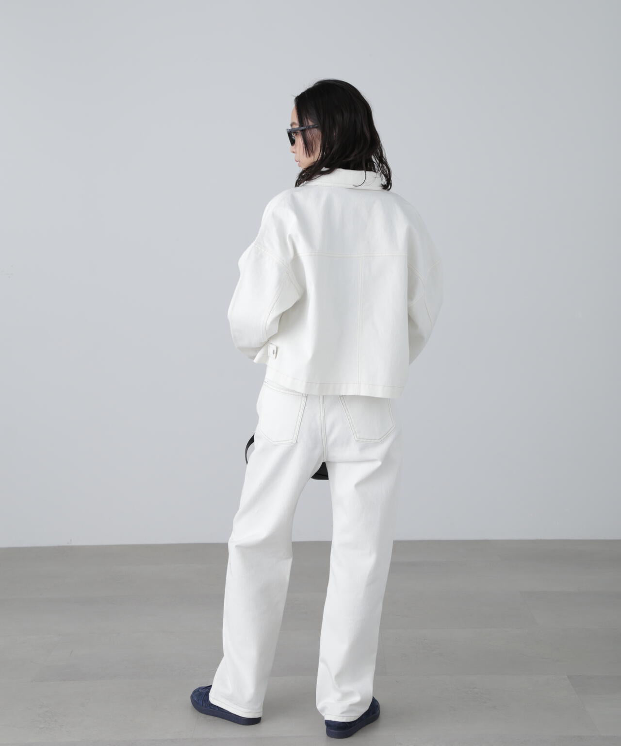 ワークテイストを盛り込んだスッキリとした印象のデニムブルゾン。リラックス感のあるワイドボディのショート丈で、合わせやすいバランスに仕上げています。キャミワンピースなどに羽織ったり、ボタンを全て留めてシャツのようにも着こなせます。スラックスと合わせたコーディネートもおすすめ。微配色ステッチがポイントのオフホワイト、FREE'S MART定番の「ストレートデニムパンツ オフホワイトカラー・店舗商品番131-4930005」とは同色糸なのでセットアップコーデもおススメです。