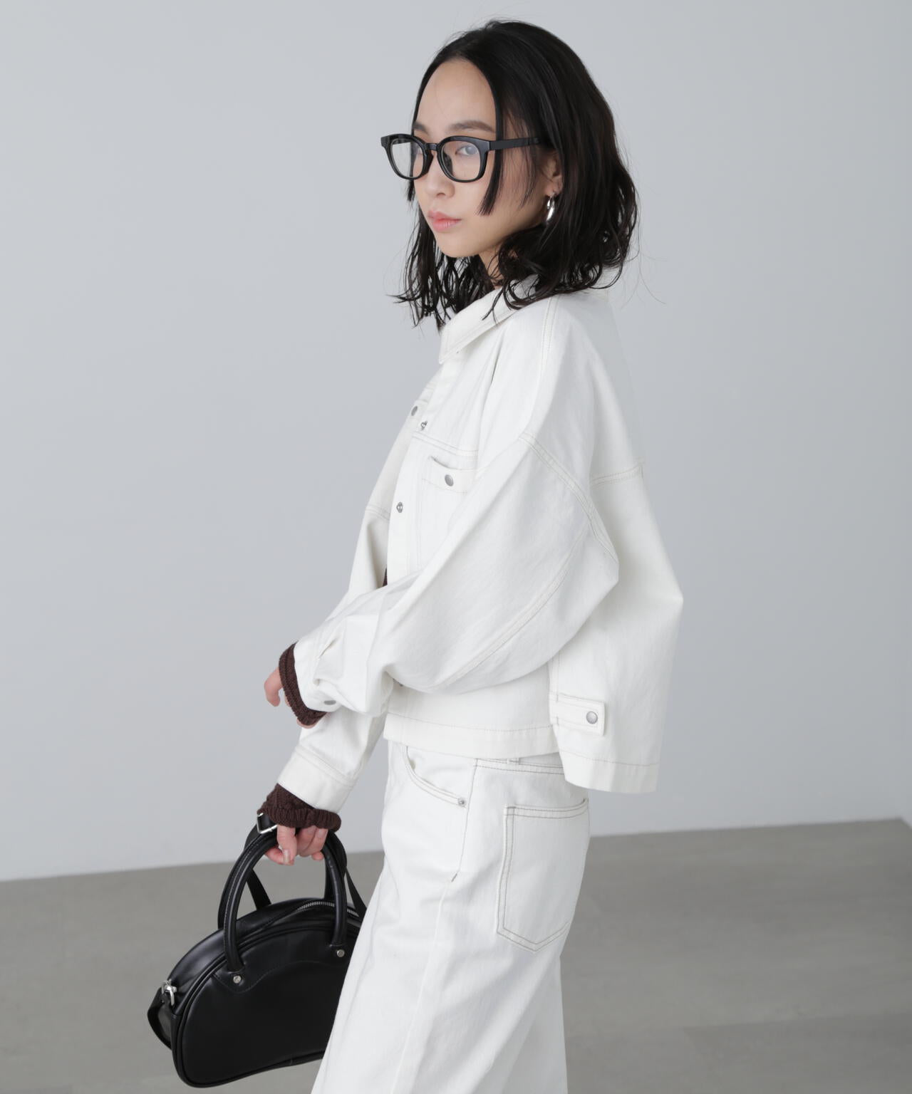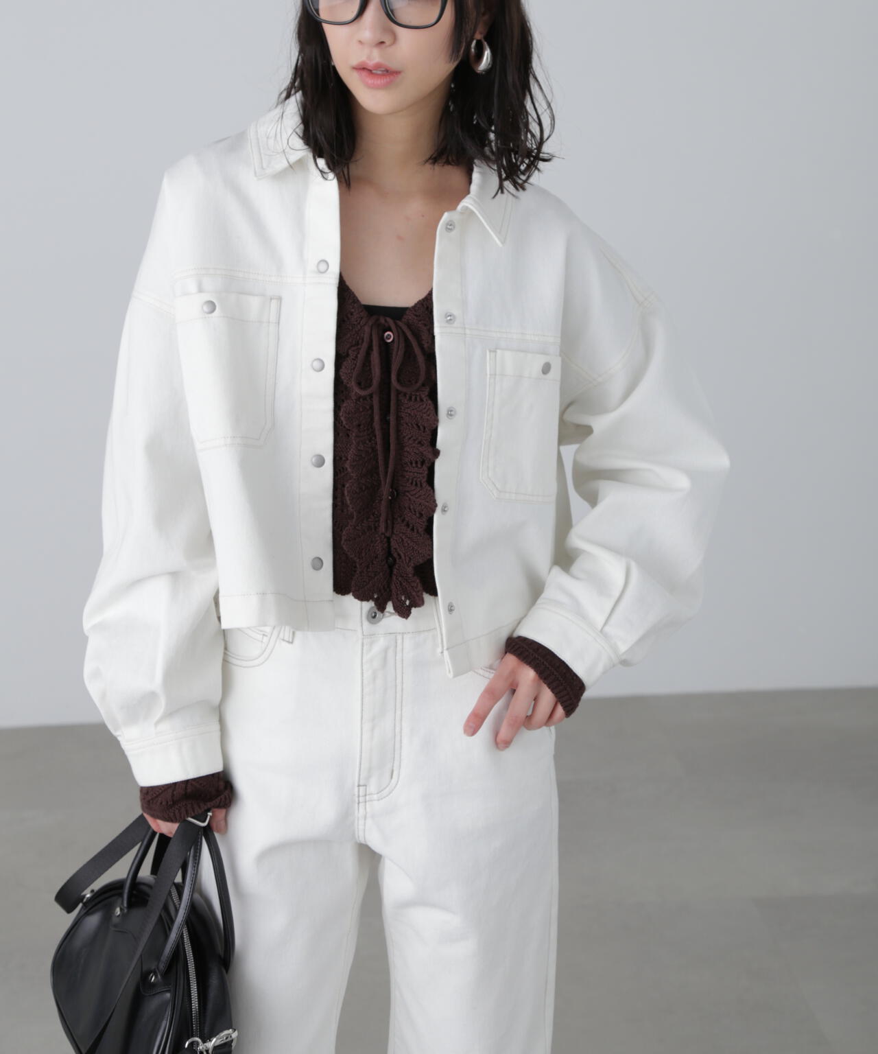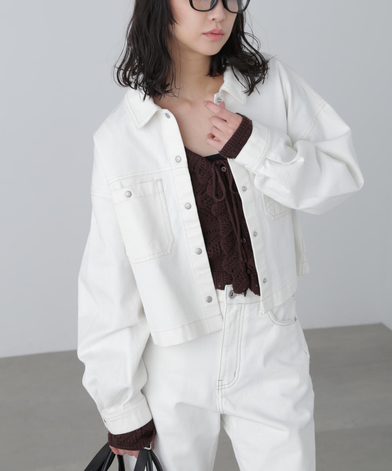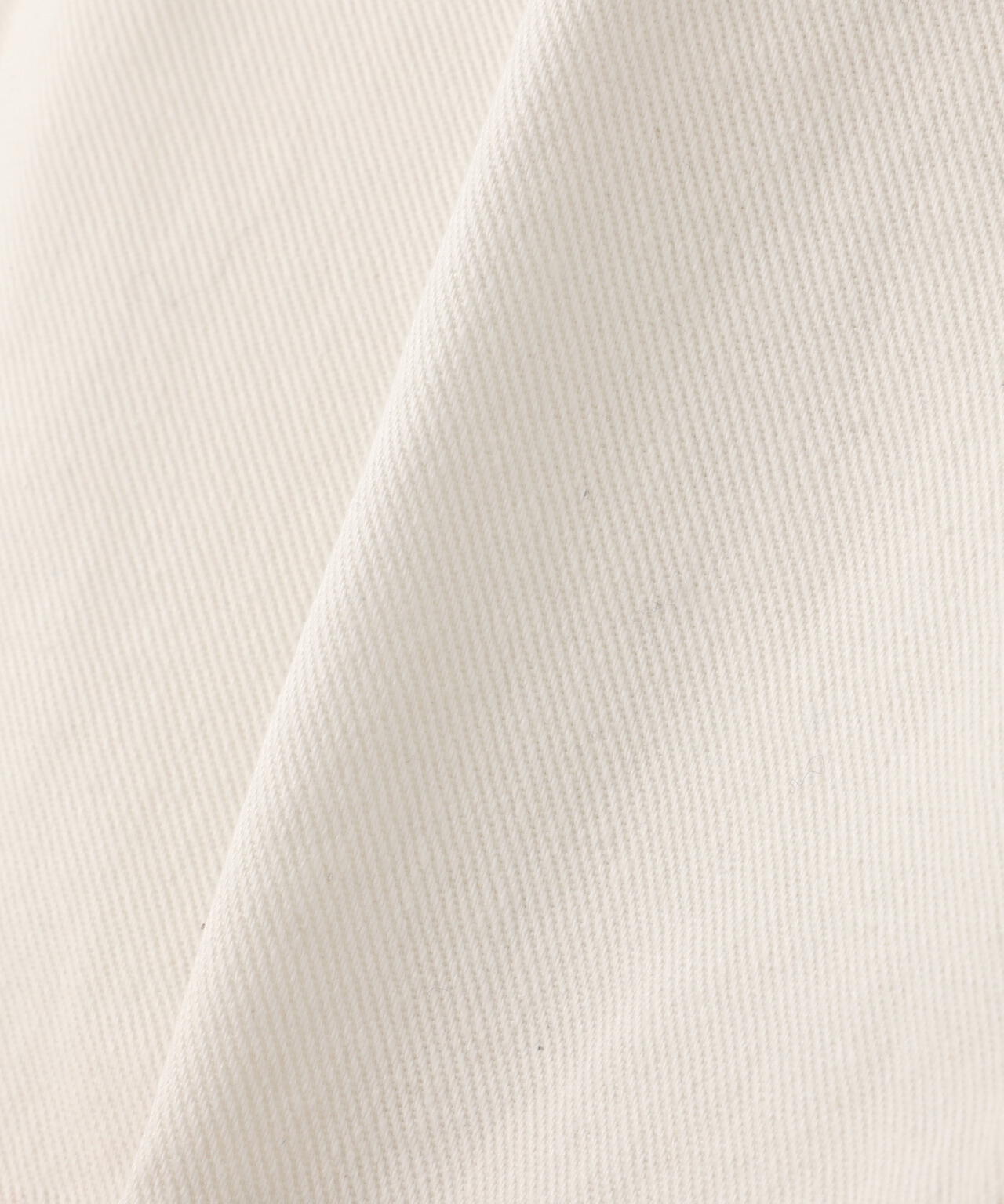 ワークテイストを盛り込んだスッキリとした印象のデニムブルゾン。リラックス感のあるワイドボディのショート丈で、合わせやすいバランスに仕上げています。キャミワンピースなどに羽織ったり、ボタンを全て留めてシャツのようにも着こなせます。スラックスと合わせたコーディネートもおすすめ。微配色ステッチがポイントのオフホワイト、FREE'S MART定番の「ストレートデニムパンツ オフホワイトカラー・店舗商品番131-4930005」とは同色糸なのでセットアップコーデもおススメです。