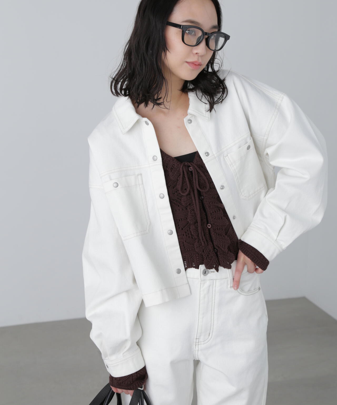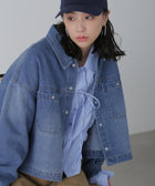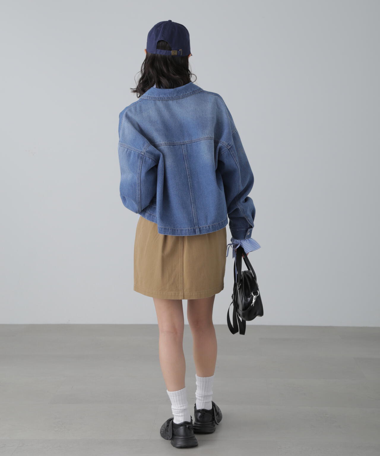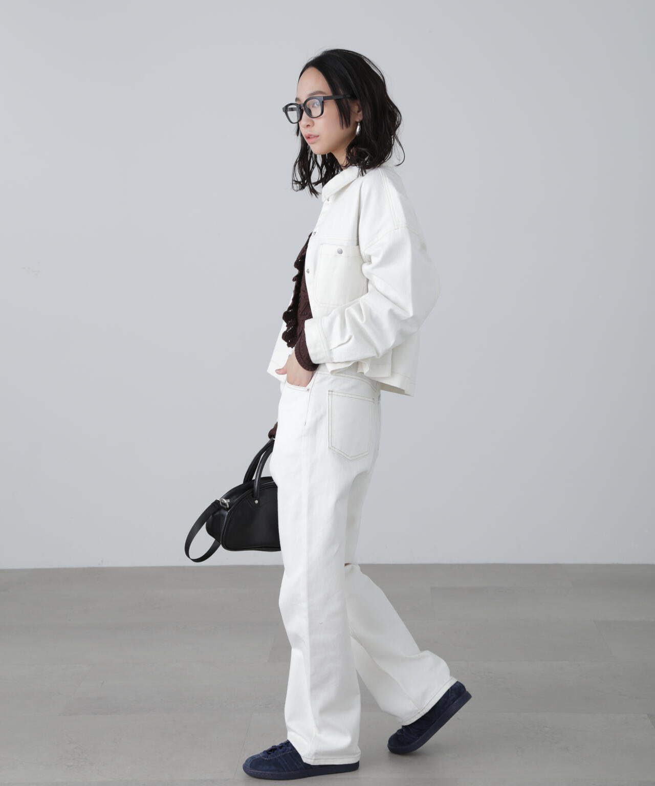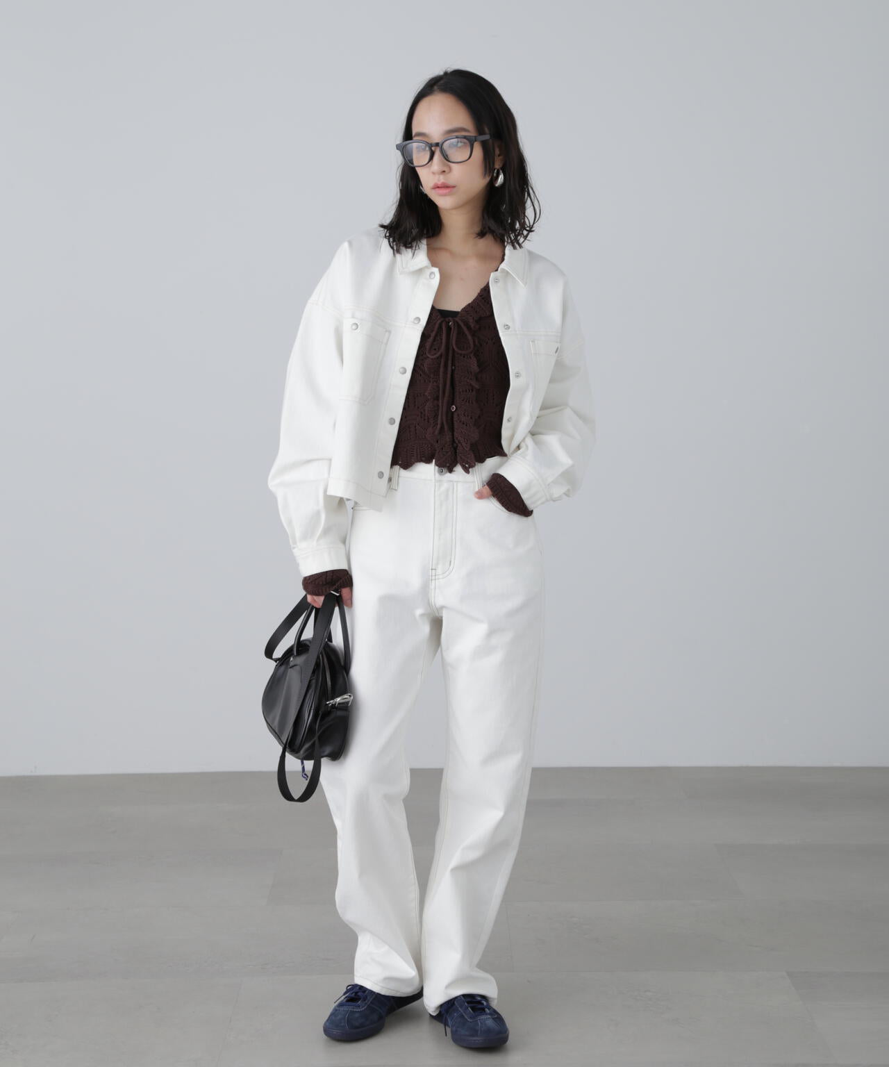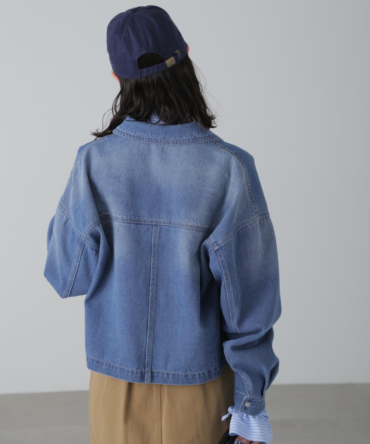 ワークテイストを盛り込んだスッキリとした印象のデニムブルゾン。リラックス感のあるワイドボディのショート丈で、合わせやすいバランスに仕上げています。キャミワンピースなどに羽織ったり、ボタンを全て留めてシャツのようにも着こなせます。スラックスと合わせたコーディネートもおすすめ。微配色ステッチがポイントのオフホワイト、FREE'S MART定番の「ストレートデニムパンツ オフホワイトカラー・店舗商品番131-4930005」とは同色糸なのでセットアップコーデもおススメです。
