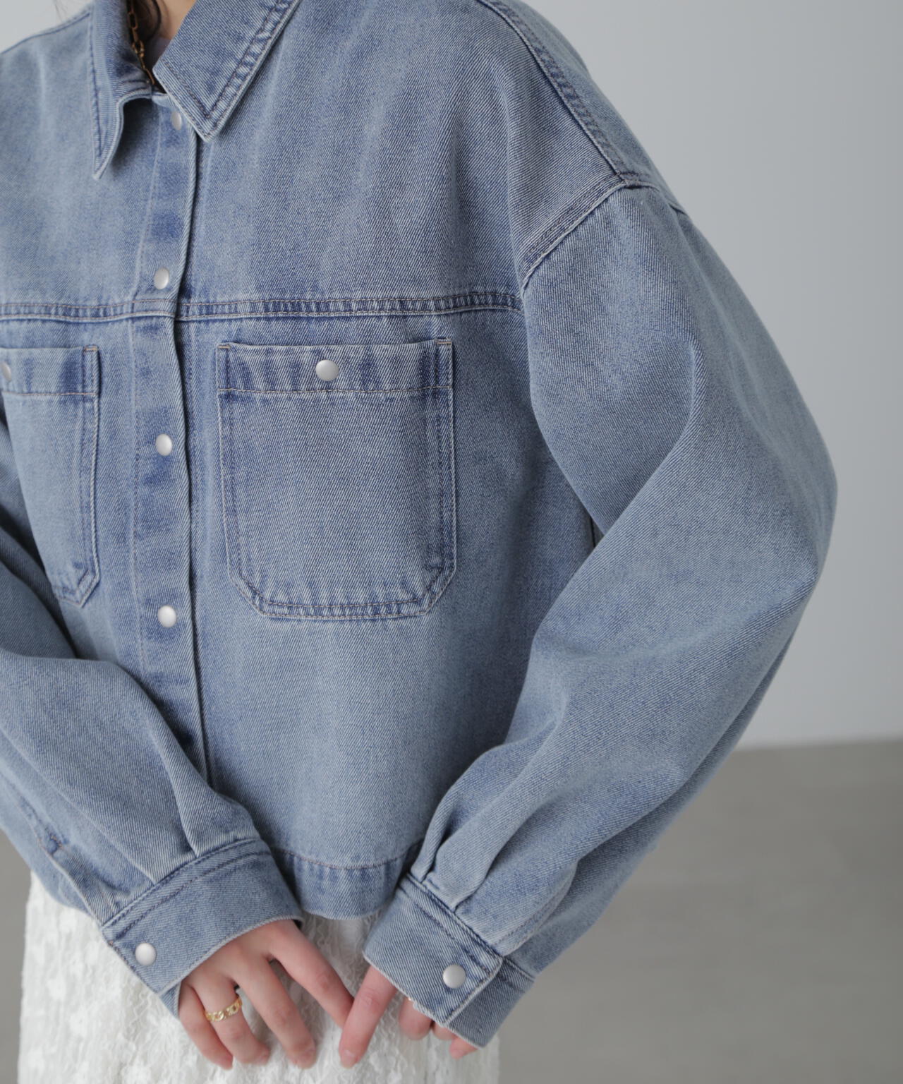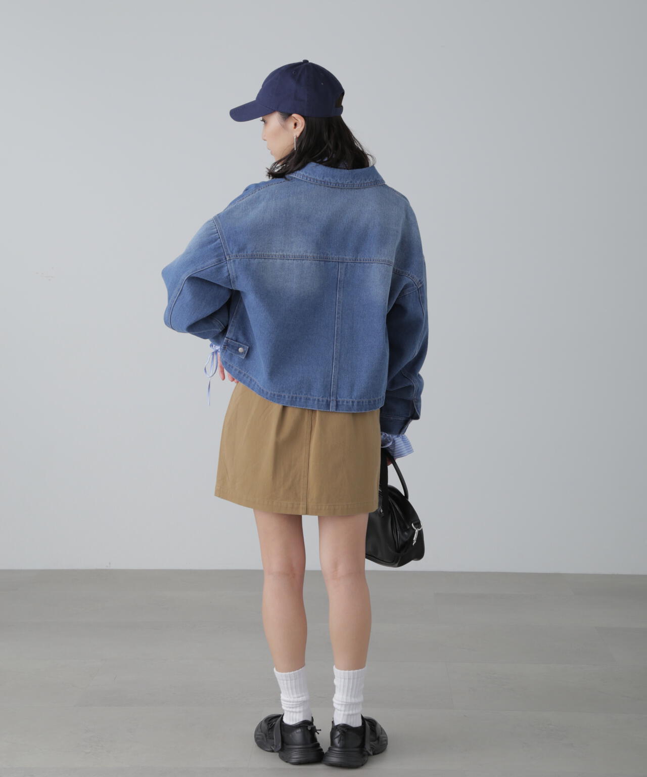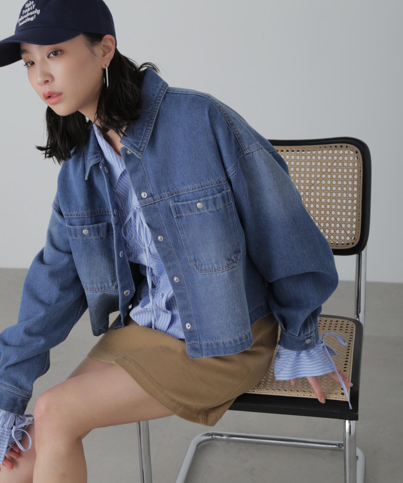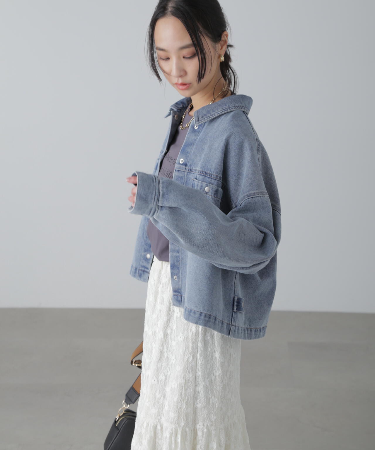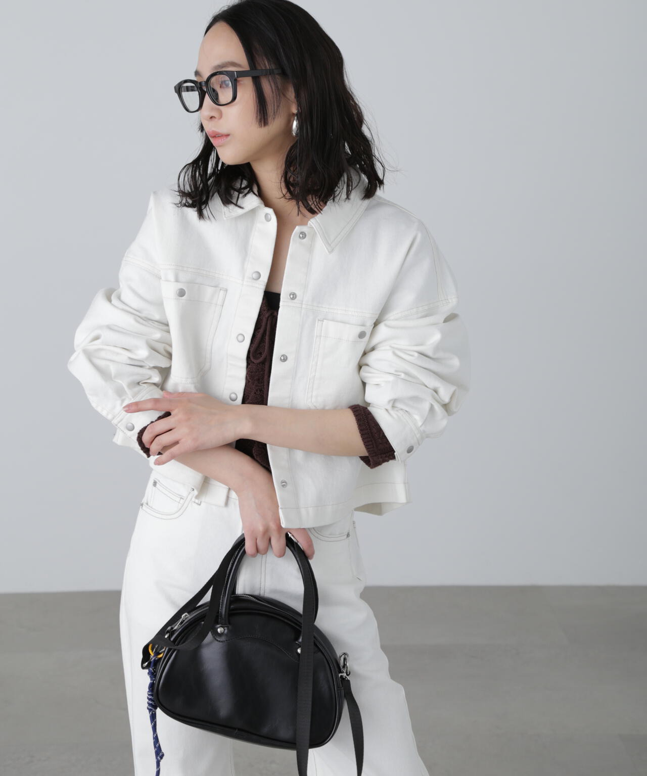 ワークテイストを盛り込んだスッキリとした印象のデニムブルゾン。リラックス感のあるワイドボディのショート丈で、合わせやすいバランスに仕上げています。キャミワンピースなどに羽織ったり、ボタンを全て留めてシャツのようにも着こなせます。スラックスと合わせたコーディネートもおすすめ。微配色ステッチがポイントのオフホワイト、FREE'S MART定番の「ストレートデニムパンツ オフホワイトカラー・店舗商品番131-4930005」とは同色糸なのでセットアップコーデもおススメです。