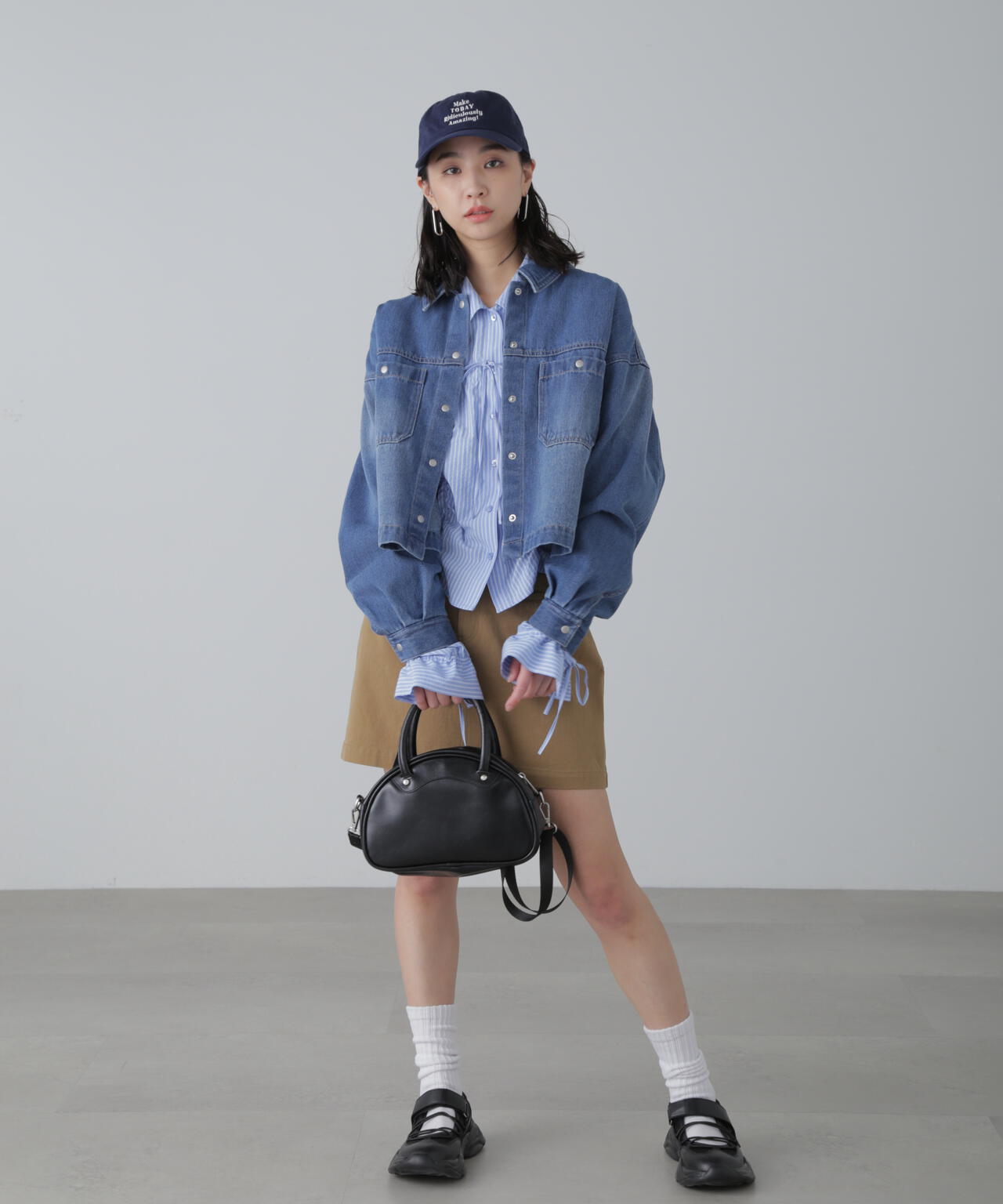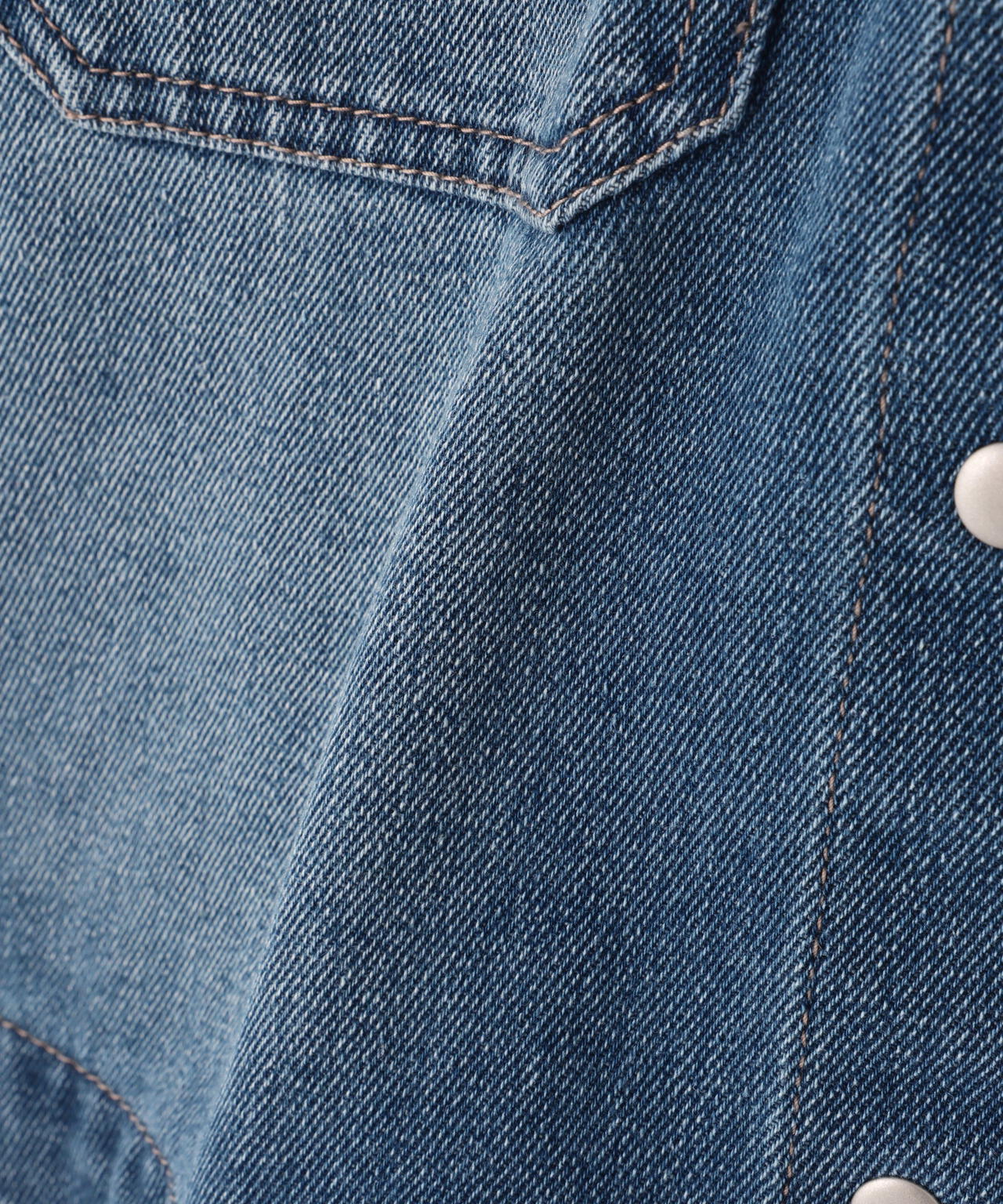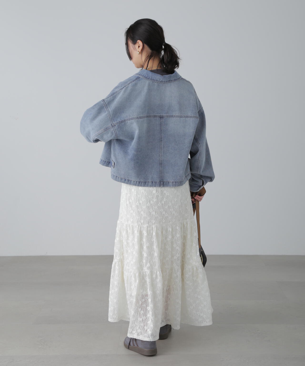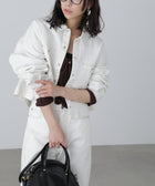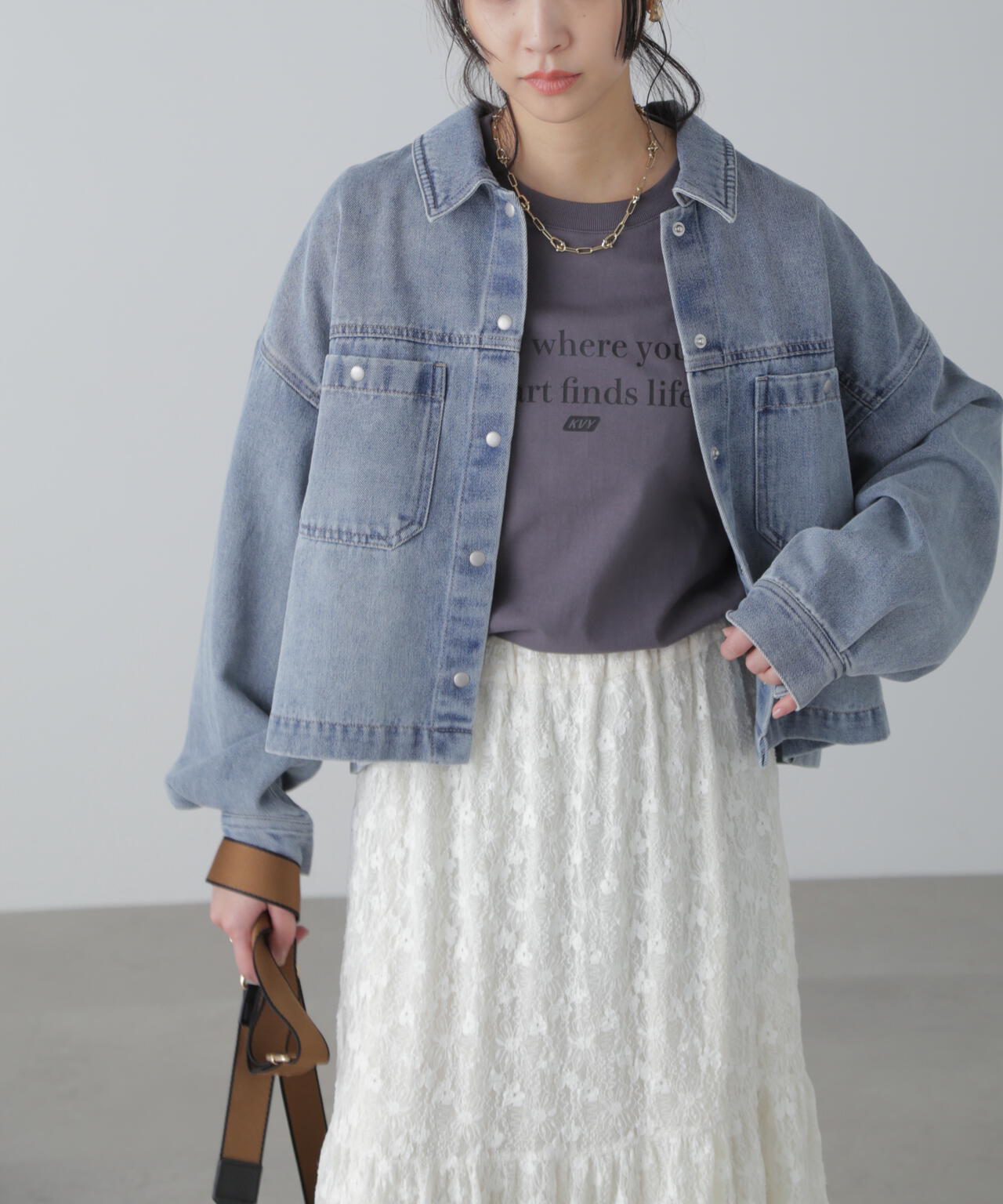ワークテイストを盛り込んだスッキリとした印象のデニムブルゾン。リラックス感のあるワイドボディのショート丈で、合わせやすいバランスに仕上げています。キャミワンピースなどに羽織ったり、ボタンを全て留めてシャツのようにも着こなせます。スラックスと合わせたコーディネートもおすすめ。微配色ステッチがポイントのオフホワイト、FREE'S MART定番の「ストレートデニムパンツ オフホワイトカラー・店舗商品番131-4930005」とは同色糸なのでセットアップコーデもおススメです。