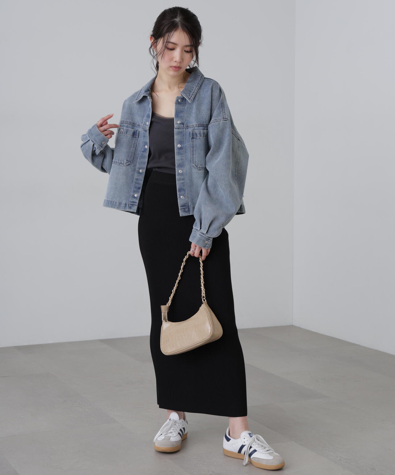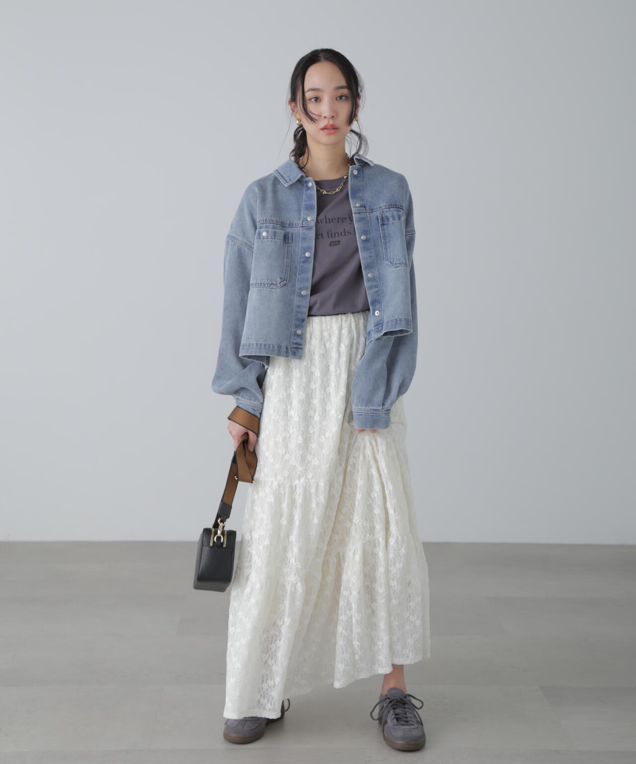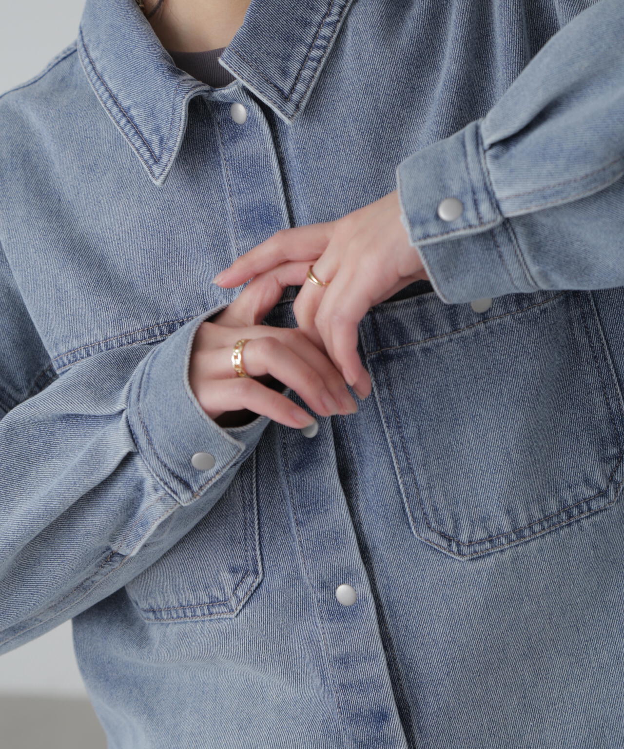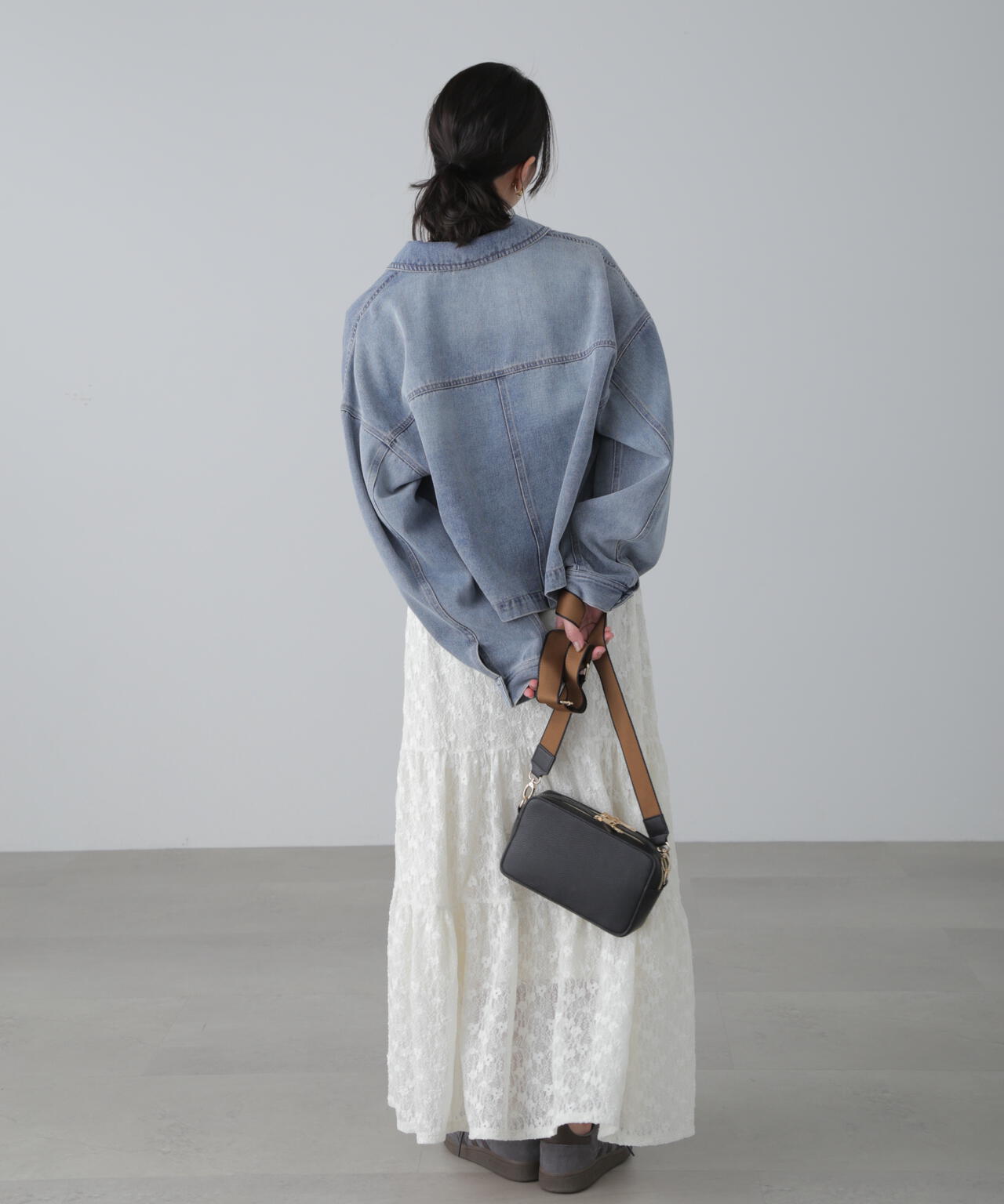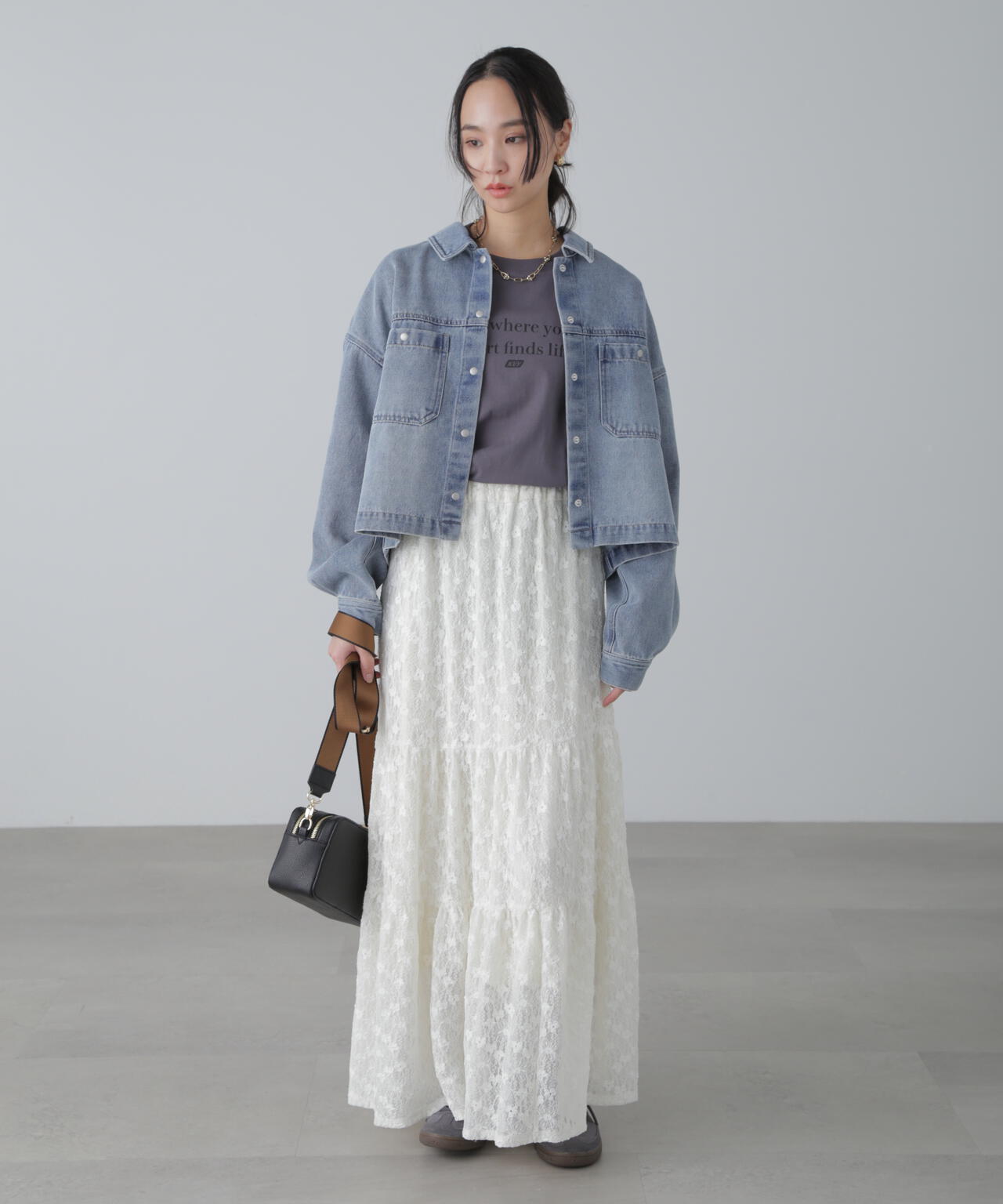 ワークテイストを盛り込んだスッキリとした印象のデニムブルゾン。リラックス感のあるワイドボディのショート丈で、合わせやすいバランスに仕上げています。キャミワンピースなどに羽織ったり、ボタンを全て留めてシャツのようにも着こなせます。スラックスと合わせたコーディネートもおすすめ。微配色ステッチがポイントのオフホワイト、FREE'S MART定番の「ストレートデニムパンツ オフホワイトカラー・店舗商品番131-4930005」とは同色糸なのでセットアップコーデもおススメです。