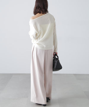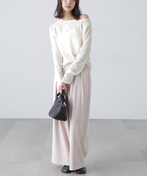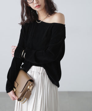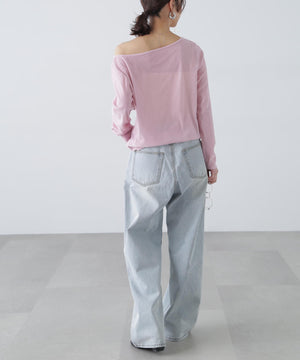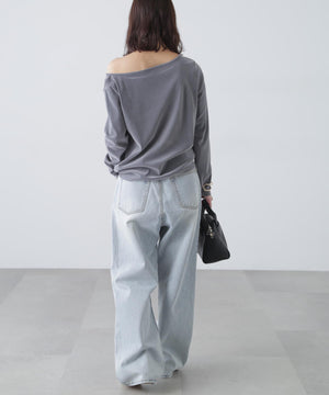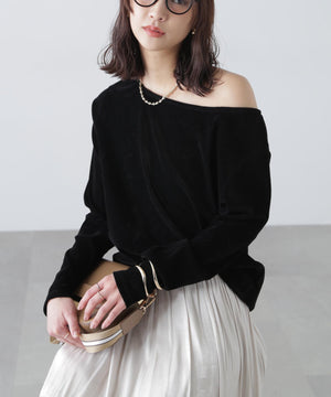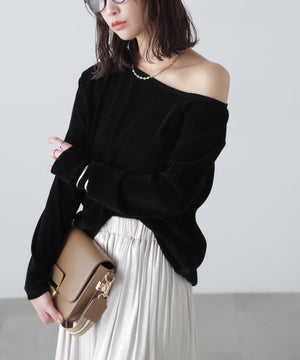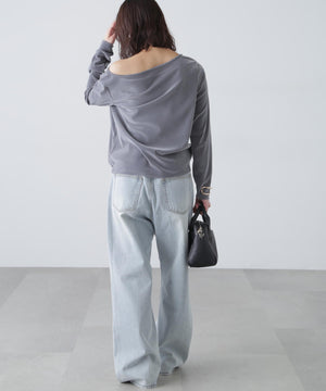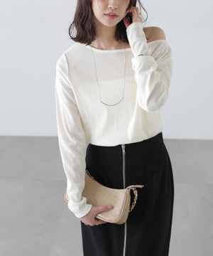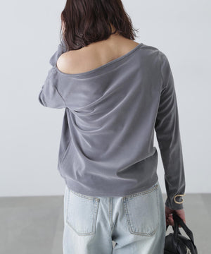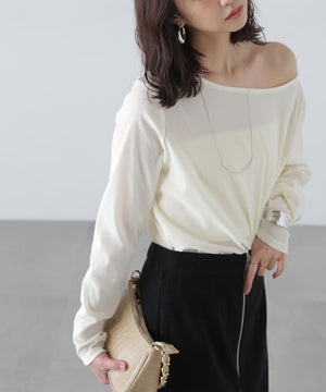 【トレンド肌見せトップス】今シーズン大注目のフロッキー加工カットソー。程よく開いたオープンネックは肩を少しずらして着てトレンドシルエットに。デニムカジュアル、ナロースカート合わせがおすすめ。ジャケットイン・パーカーインでインナーとして合わせれば、トレンドの着こなしが楽しめます。
