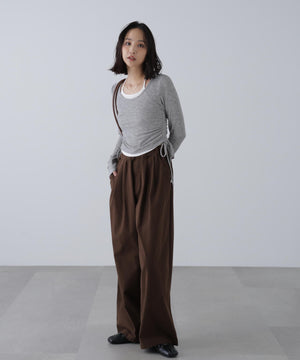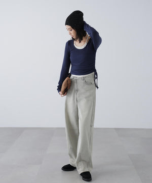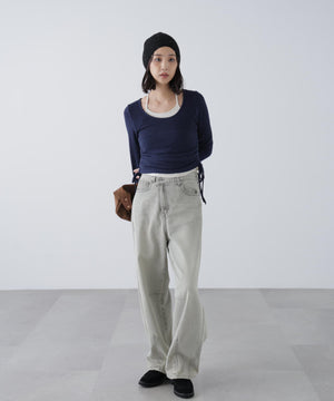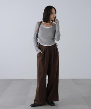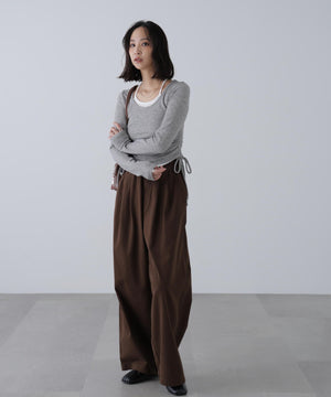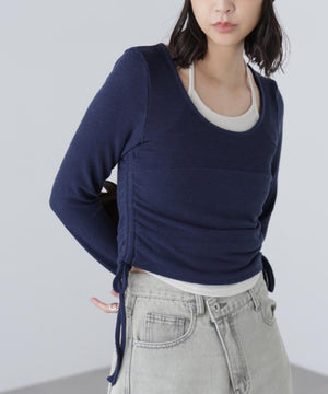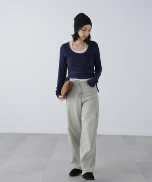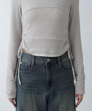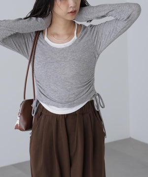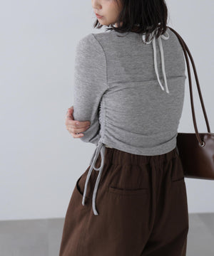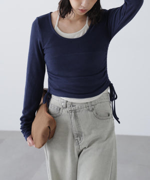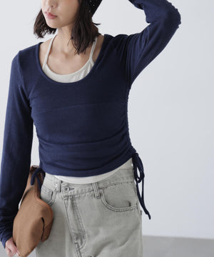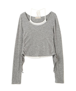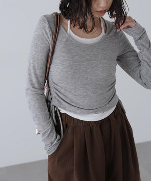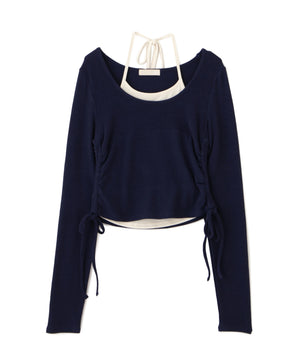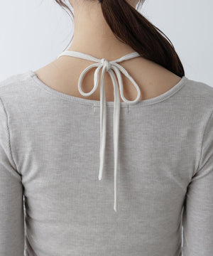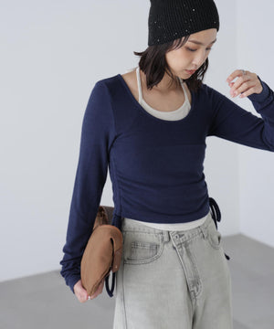ホルターネックインナーとドッキングしたようなデザインカットソー。ホルター部分は柔らかい肌触りのフライス素材でアウター側、柔らかいタッチのリブカットソー素材です。胸部分でドッキングされており、1枚でスタイリングが完成するデザイン。両脇のドロストで着丈を調整できます。身頃も袖もフィットするコンパクトなサイジングです。フィットするサイジングなのでデニム合わせでラフな着こなしがバランスが取りやすいです。ミニスカート合わせで韓国っぽい着こなしもおすすめです。