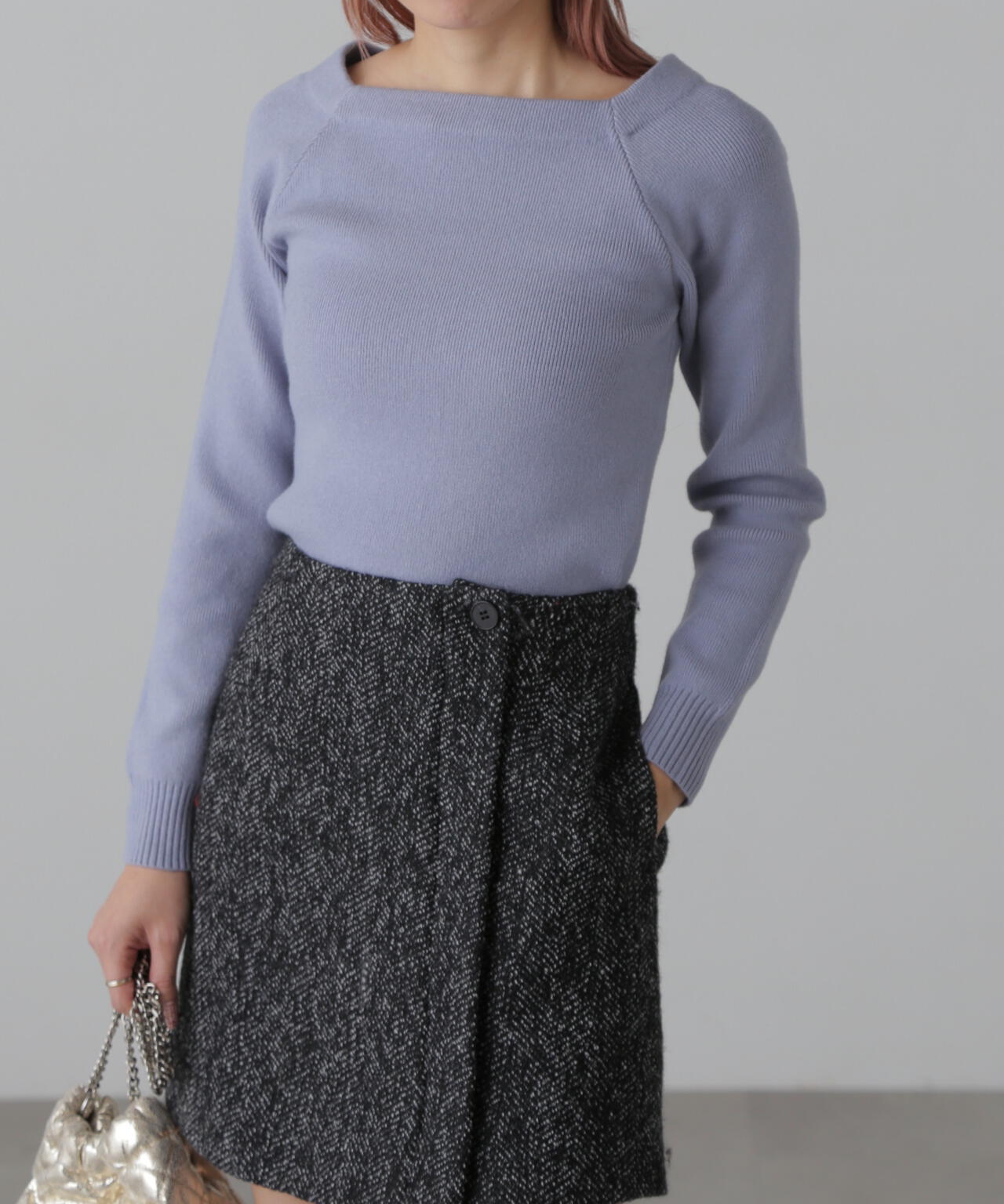 ウールライクな糸を使用したスクエアネックニット。総針編みにプレーティングを施しボディラインを拾いにくい厚みにしています。襟ぐりは見返し仕様ですっきりと仕上げています。裾はインもアウトも決まりやすい着丈なので、どんなボトムにも合わせやすい一枚。ベーシックなオフ×黒ボーダー・杢グレー・ブルーの3色展開です。