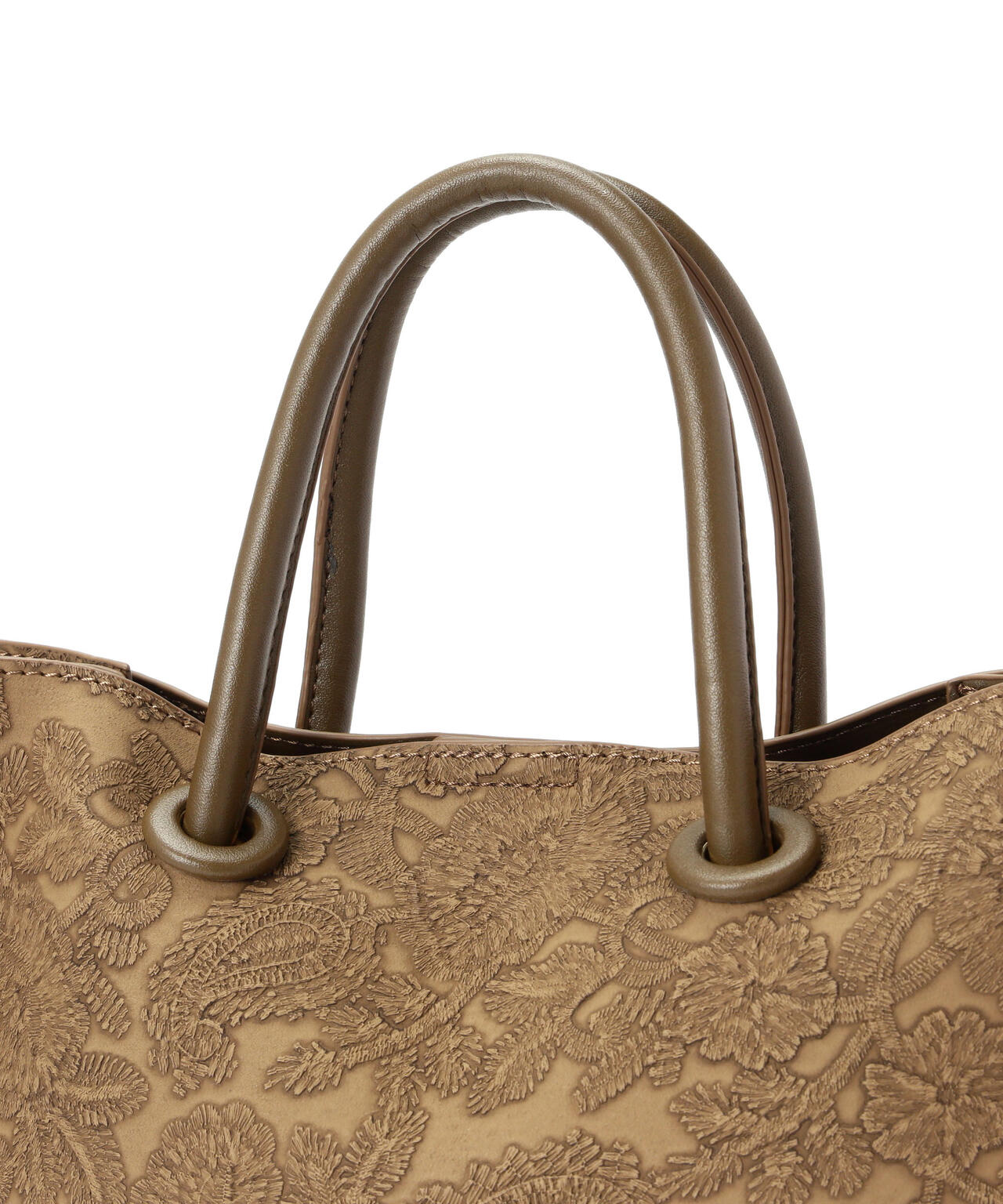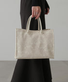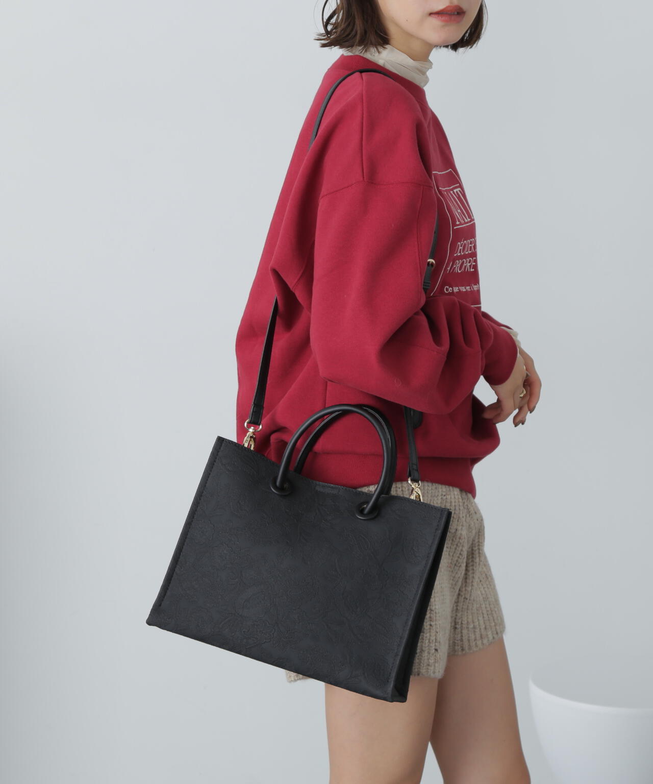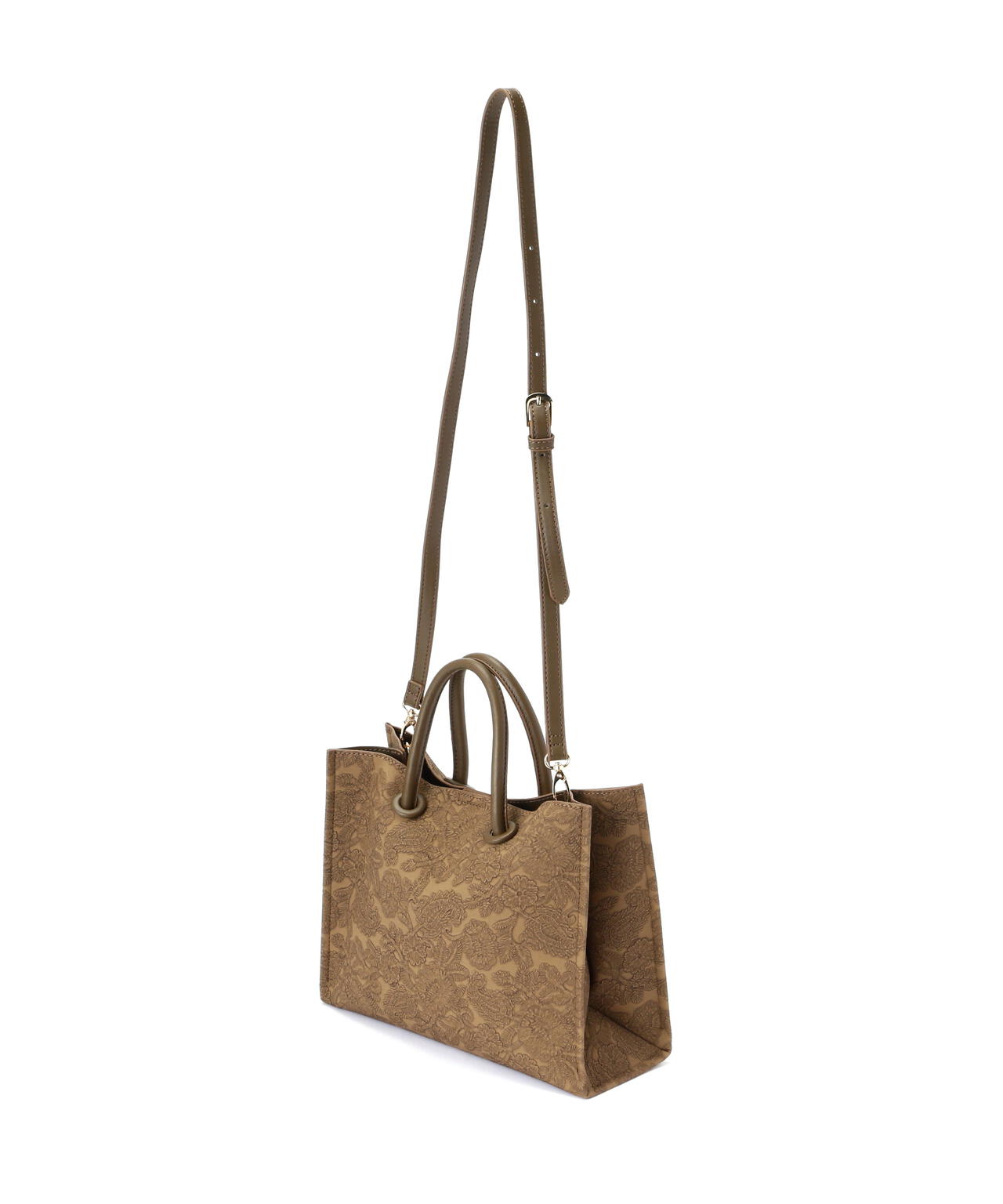 立体的なエンボス加工が施されたペイズリー柄バッグ。丸手のハンドルとくるみカシメがデザインのポイントです。ソフトな質感のフェイクレザーを使って重みを軽減しつつ、荷物の出し入れもしやすい設計。ショルダー紐は取り外しができる2Way仕様です。デイリースタイルに馴染みのいい大人なカラーを揃えています。