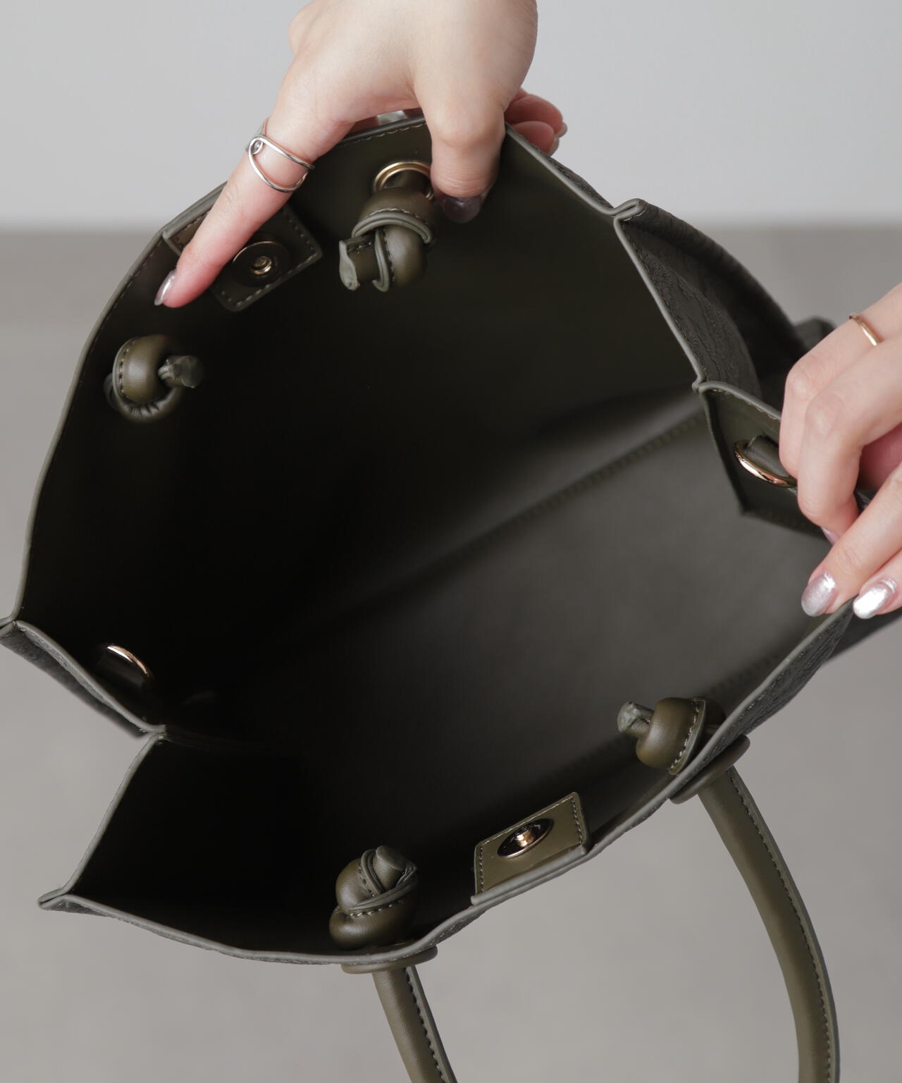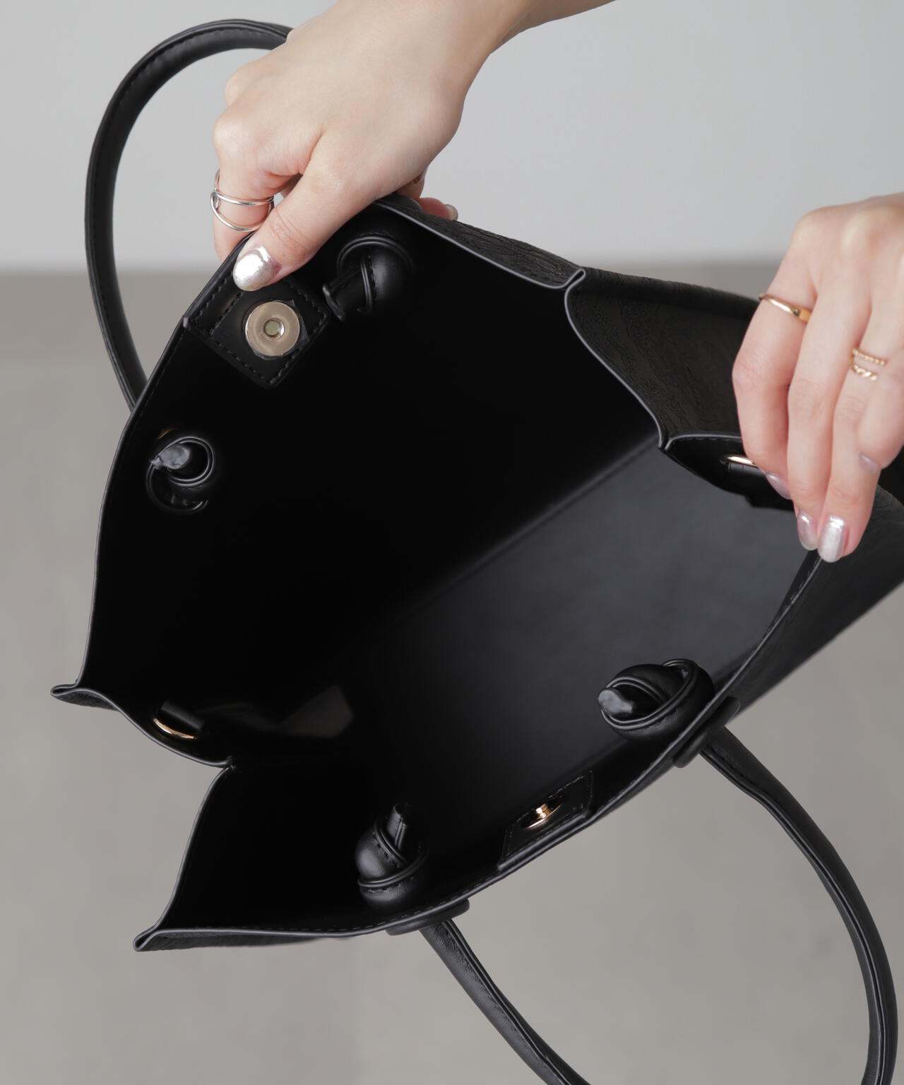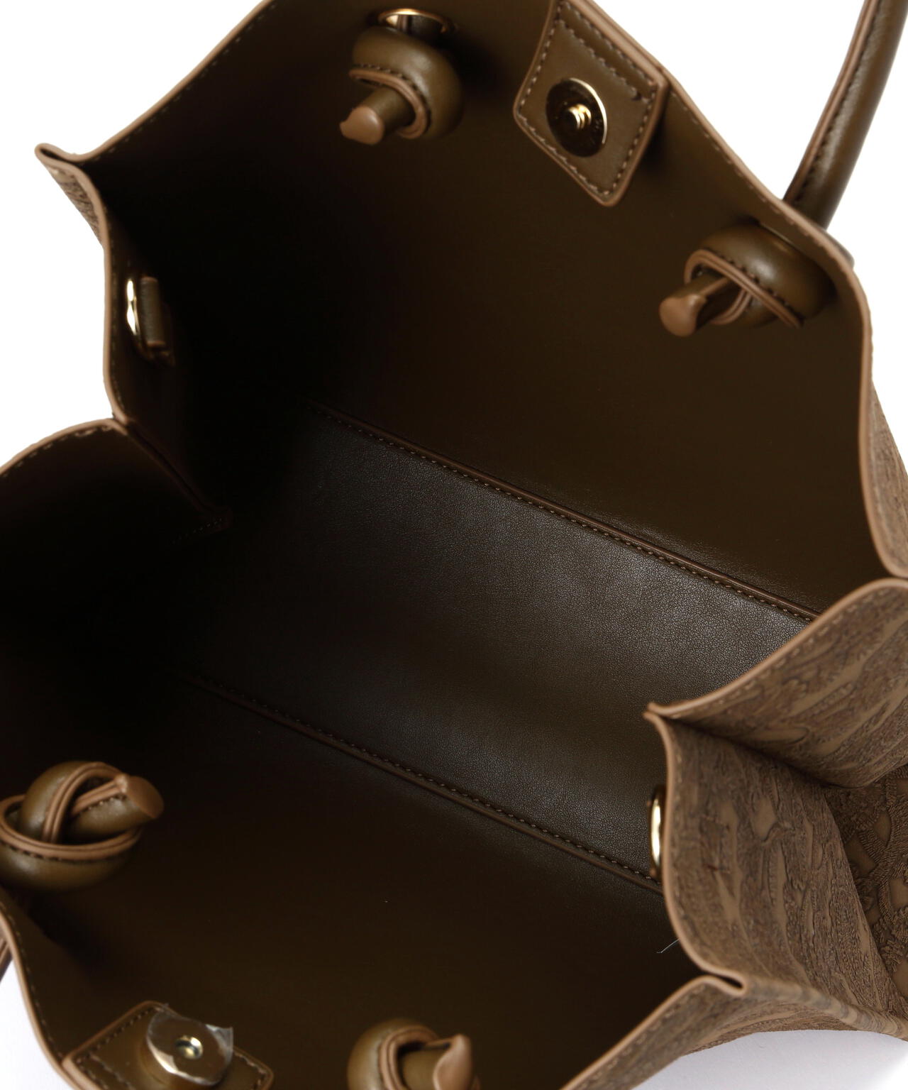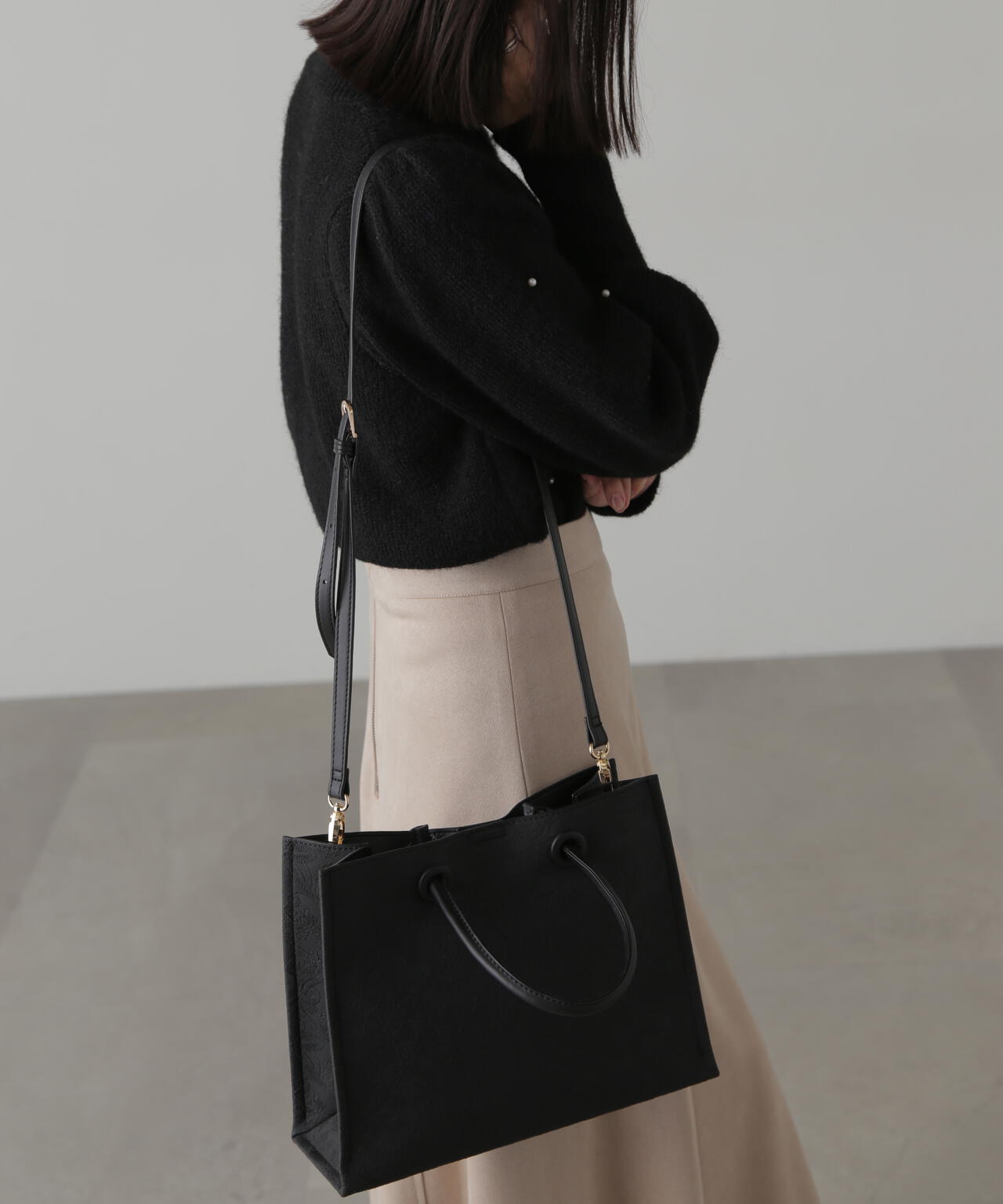 立体的なエンボス加工が施されたペイズリー柄バッグ。丸手のハンドルとくるみカシメがデザインのポイントです。ソフトな質感のフェイクレザーを使って重みを軽減しつつ、荷物の出し入れもしやすい設計。ショルダー紐は取り外しができる2Way仕様です。デイリースタイルに馴染みのいい大人なカラーを揃えています。