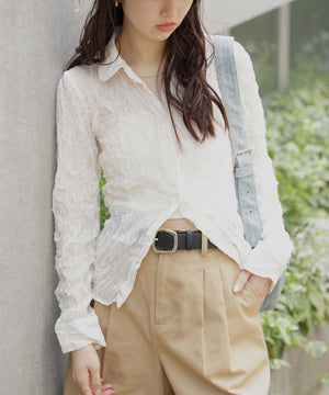 シアーなシフォン素材に楊柳加工を施した無地と、シアー感のあるチェック生地を使ったアソート展開のシャツ。体にフィットするスリムシルエットで、ウエストをシェイプしたトレンド感のあるデザインです。ワイドパンツ、ミニスカート合わせがおすすめ。1番下のボタンを外して、ボトムスのウエストをのぞかせるとスタイルアップします。