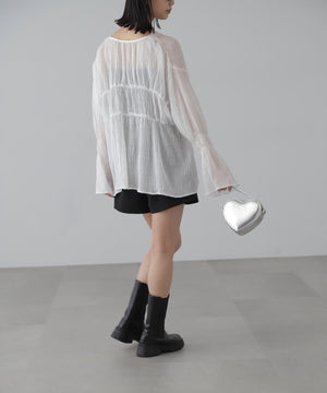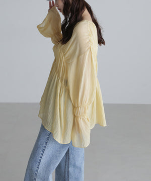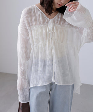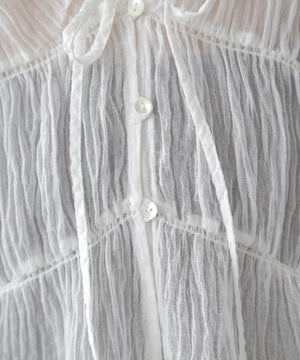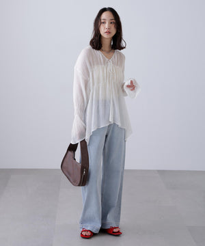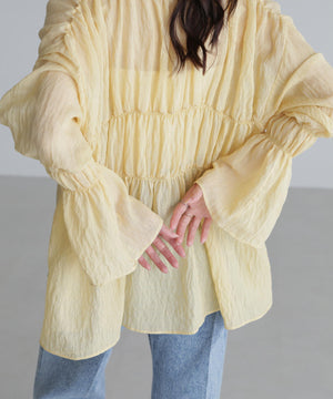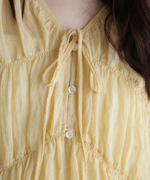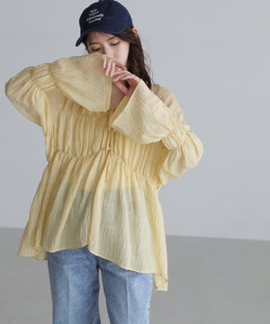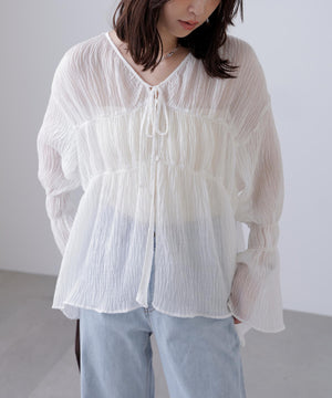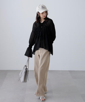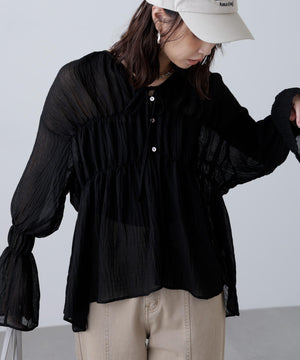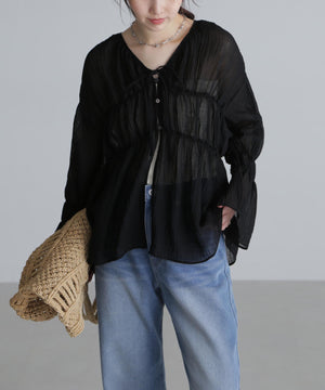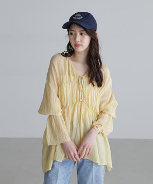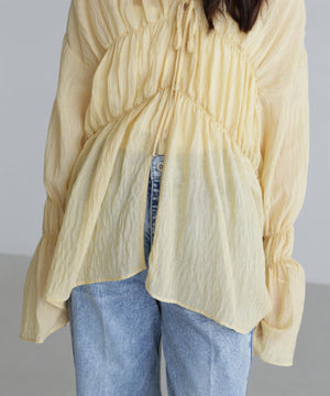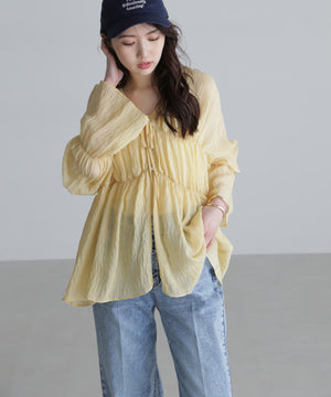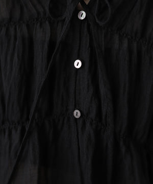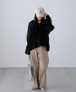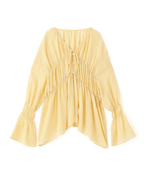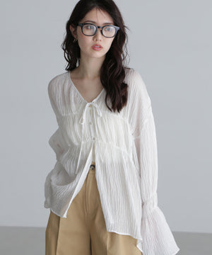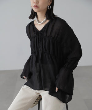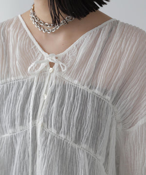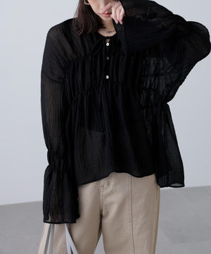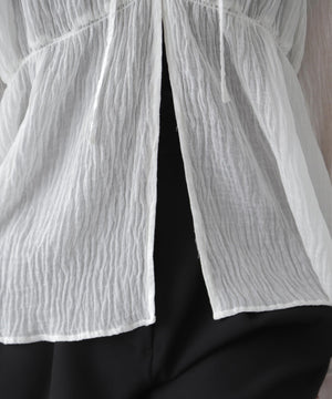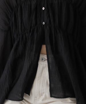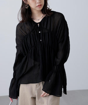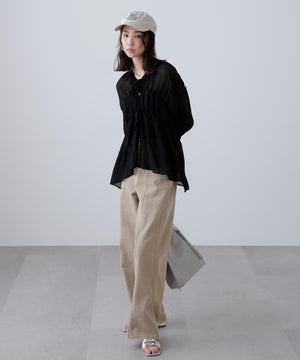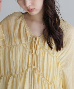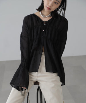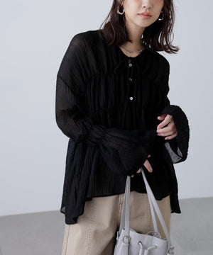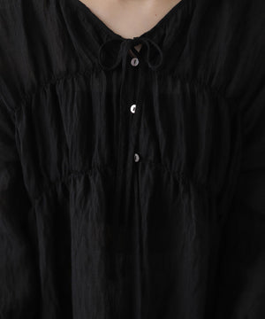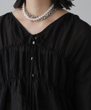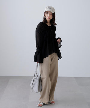ネック周りのギャザーと胸元にシャーリングを施し、ふんわりとしたシルエットのブラウスです。ギャザー部分は柔らかく伸縮性があり、キャンディスリーブの袖口はたくし上げやすくて着心地が良い仕上がりです。フロントのリボンとシェル釦をポイントにでき、開閉したままでも着用可能。ワッシャー感のあるラフな表情の合繊素材を使用しています。