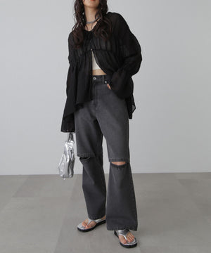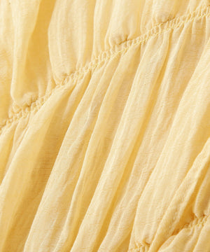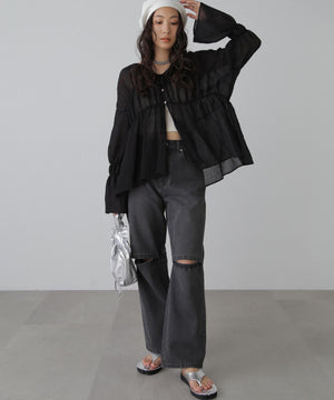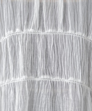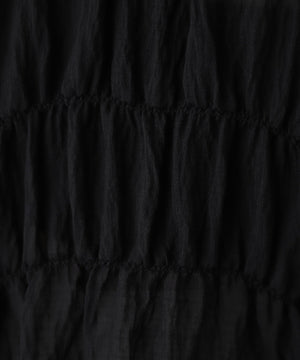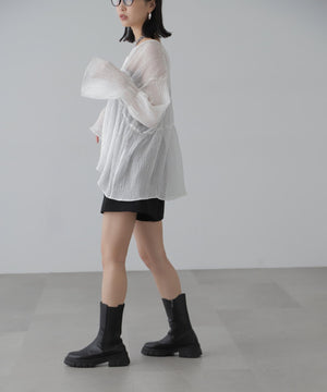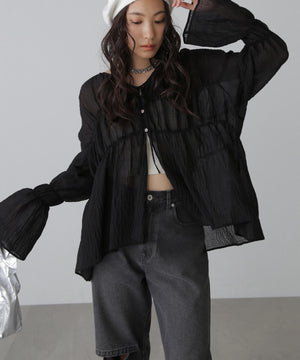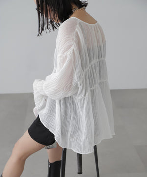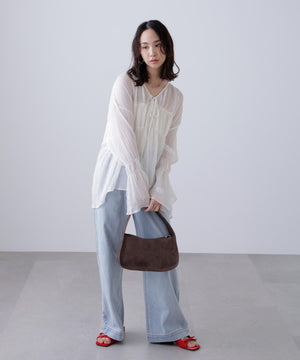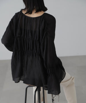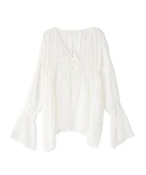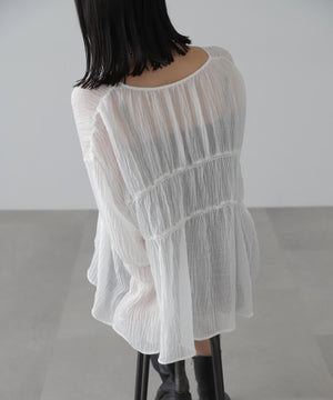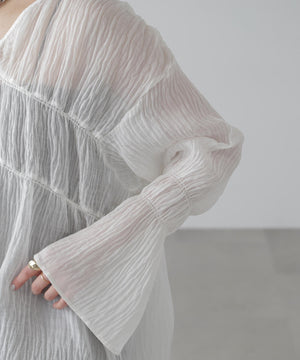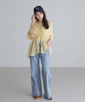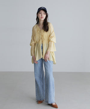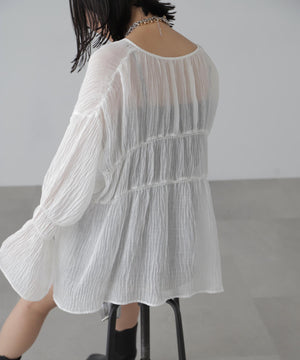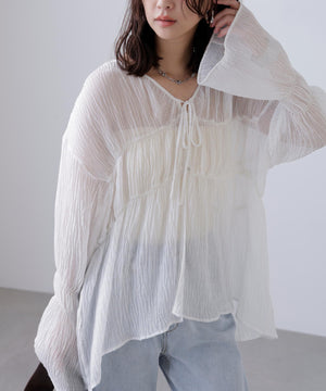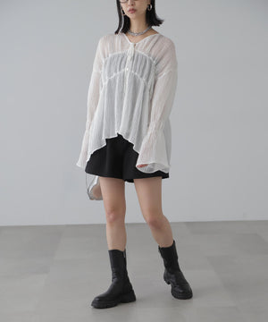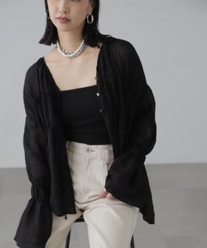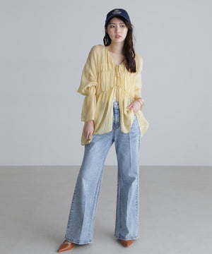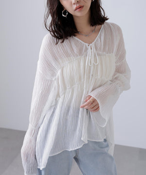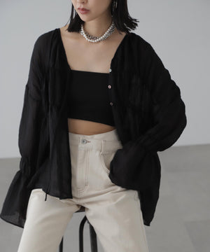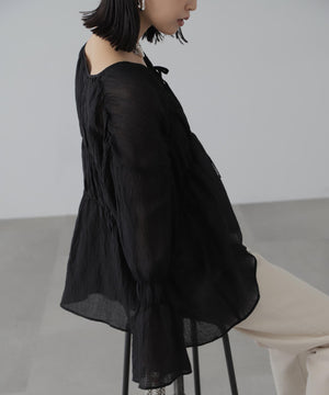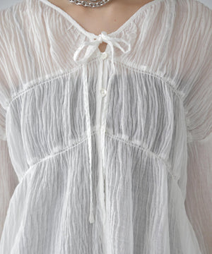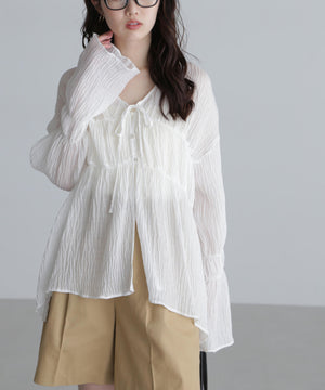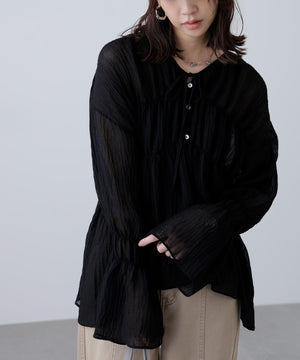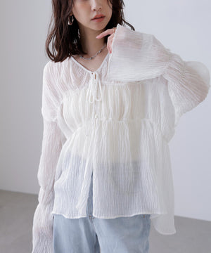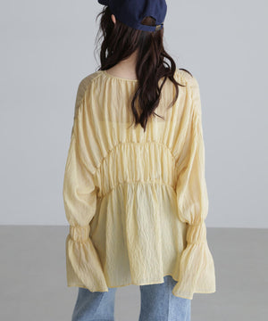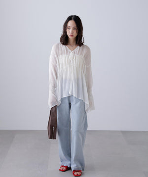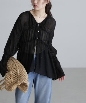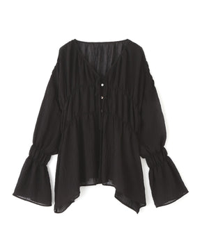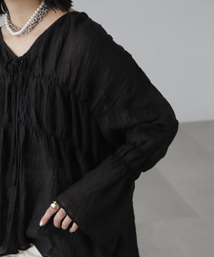 ネック周りのギャザーと胸元にシャーリングを施し、ふんわりとしたシルエットのブラウスです。ギャザー部分は柔らかく伸縮性があり、キャンディスリーブの袖口はたくし上げやすくて着心地が良い仕上がりです。フロントのリボンとシェル釦をポイントにでき、開閉したままでも着用可能。ワッシャー感のあるラフな表情の合繊素材を使用しています。