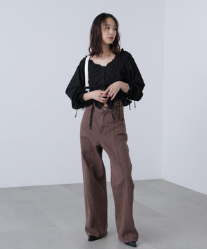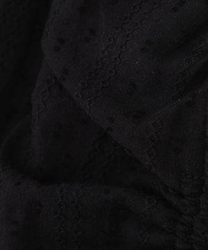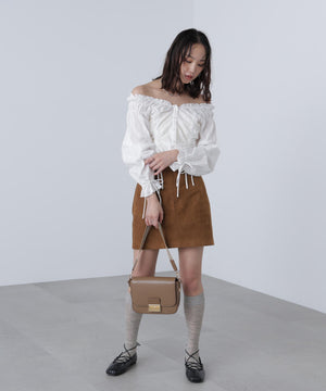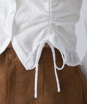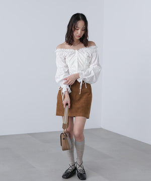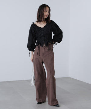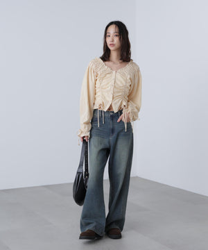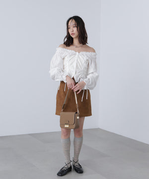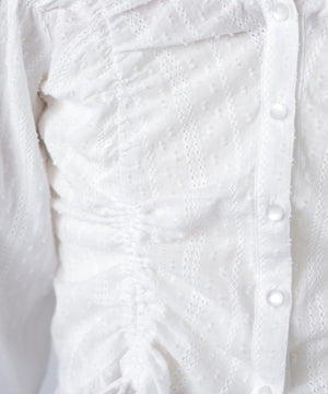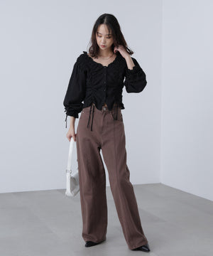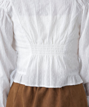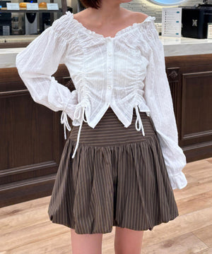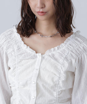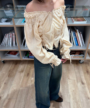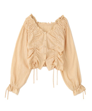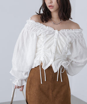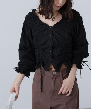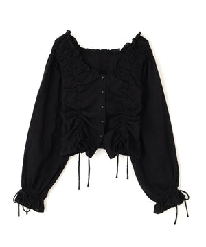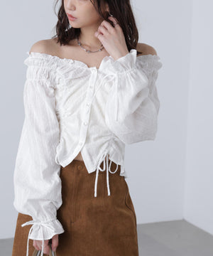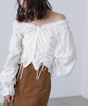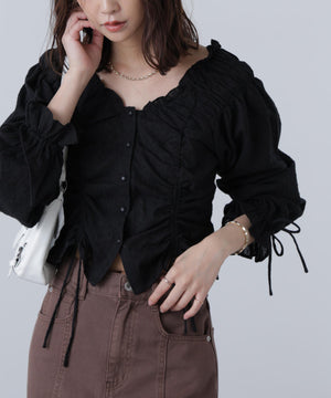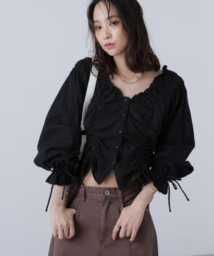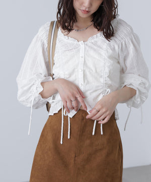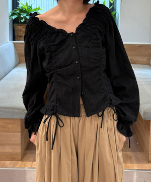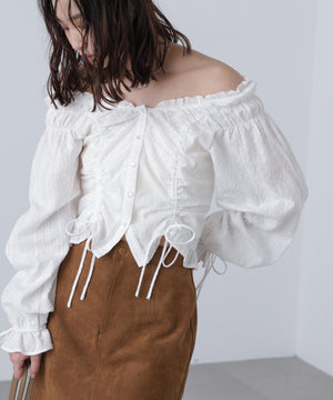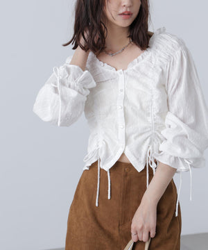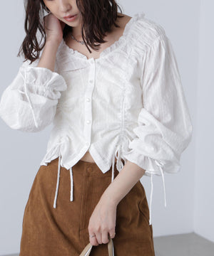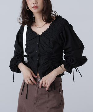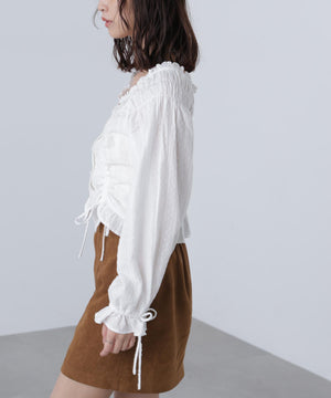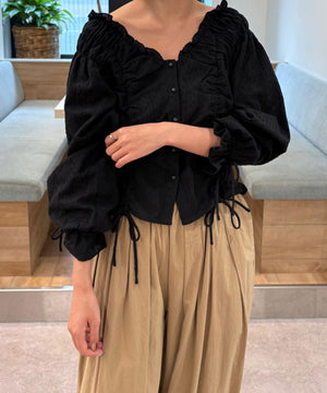 ご好評いただいているブラウスをベースにした、長袖ブラウスが登場!デコルテがすっきり見えるネックラインに、襟周りのフリルやシャーリング、ドロストディテールがポイント。袖はラグラン仕立てのギャザースリーブなので、オフショルライクに着こなしていただくのがおススメです。キャンディスリーブの袖口は、平ゴムとリボンを通しているので、袖をたくし上げやすく、暑い時期から着ていただけます。レディライクなスカートと合わせ、オフィスカジュアルは勿論、ワイドデニムパンツなどのカジュアルなボトムス合わせも楽しめます。