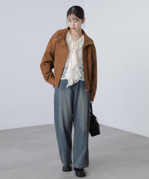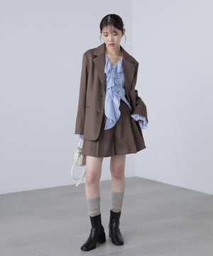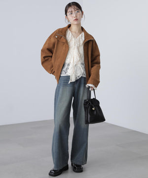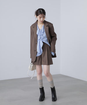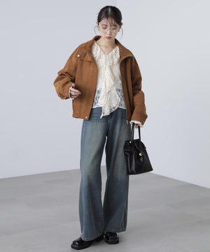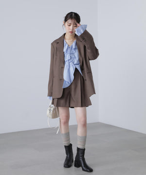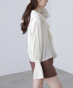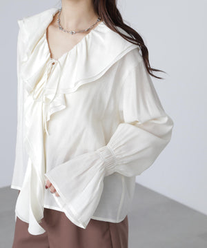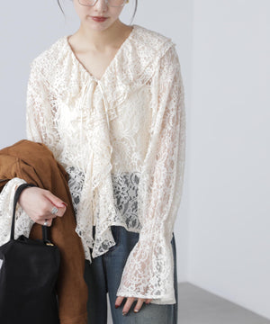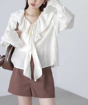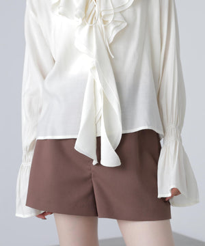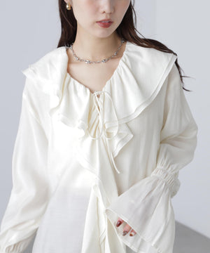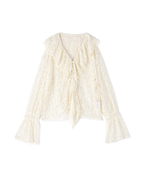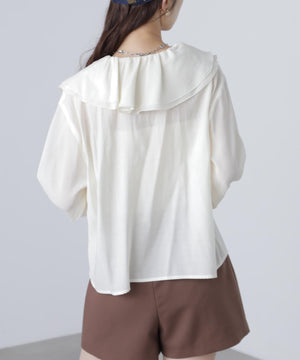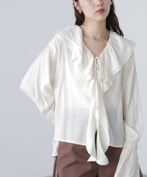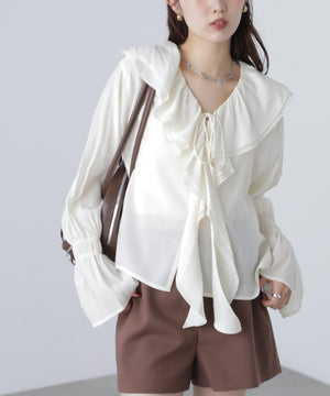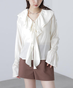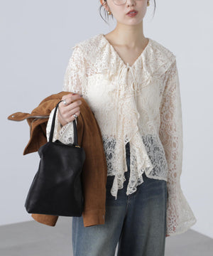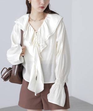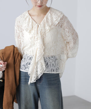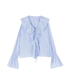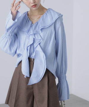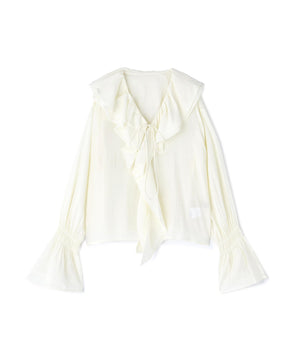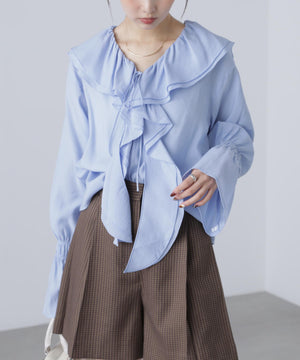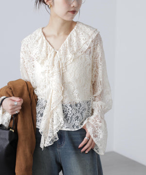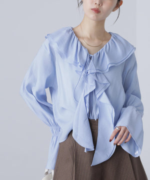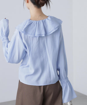 顔まわりを華やかに見せてくれるダブルラッフルフリルがポイントのブラウス。程よくボリューム感のあるキャンディスリーブで、軽やかな印象をプラス。袖口はテンションのあるシャーリングギャザーで、袖をたくし上げやすくなっています。前開きのボタン仕様で、軽い羽織としても使えます。ジャケットやVネックのシャギーカーディガンなどに、ラッフルフリルを見せて着こなすのもおすすめ。デニムやスウェットなど、カジュアルなボトムスとのスタイリングがイチオシです。ナチュラルな表面感でサラッとした肌触りの無地(オフホワイト・サックス)と、ヴィンテージライクなレース生地の3展開です。