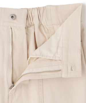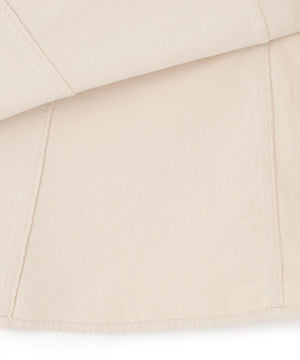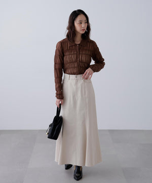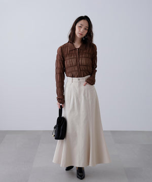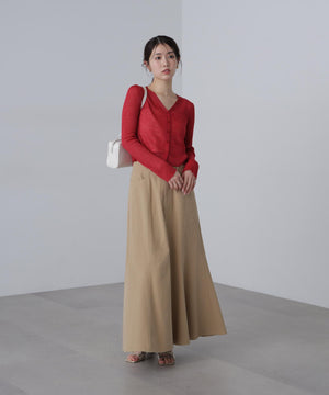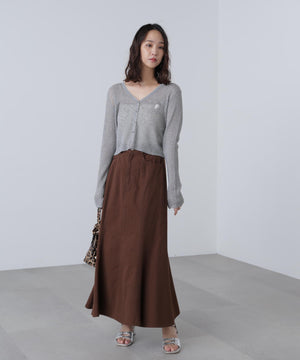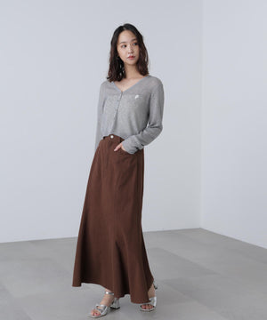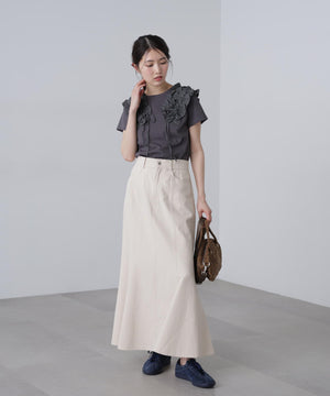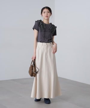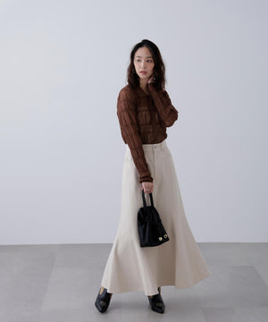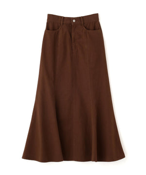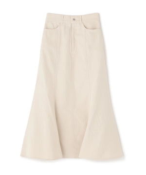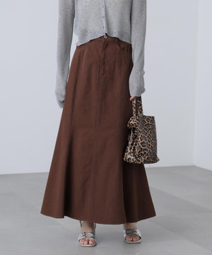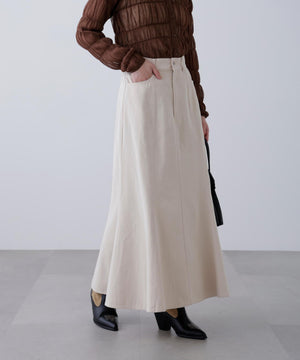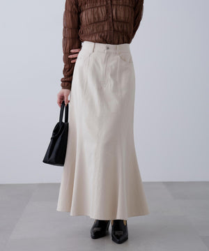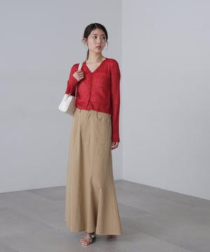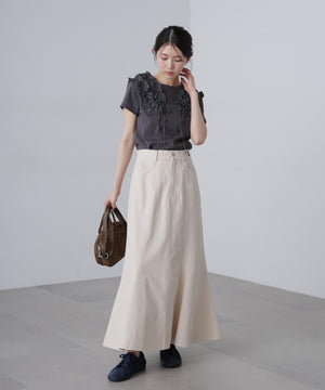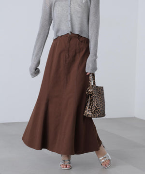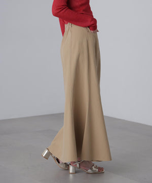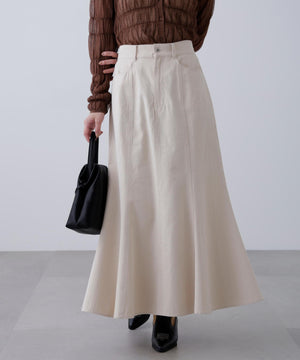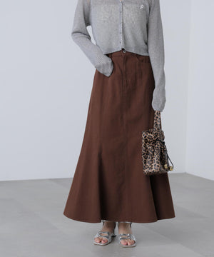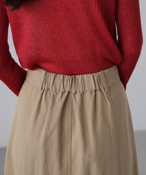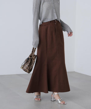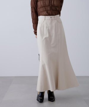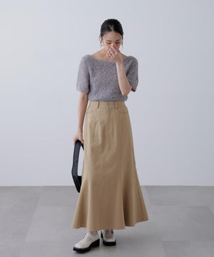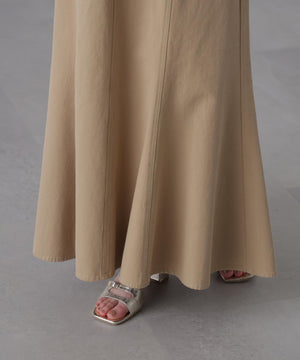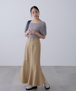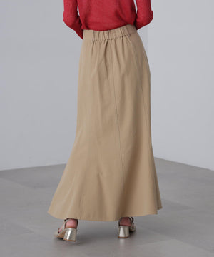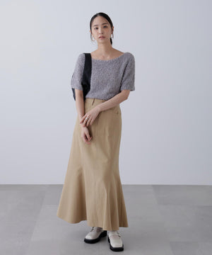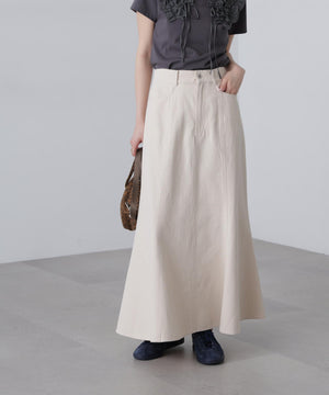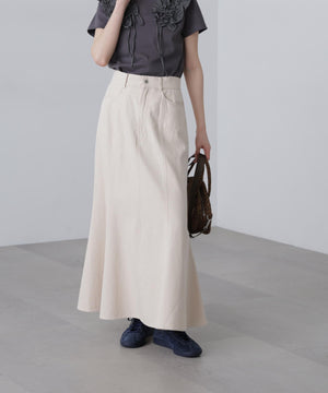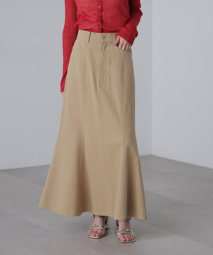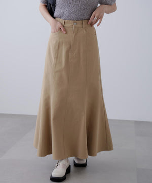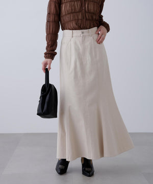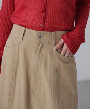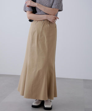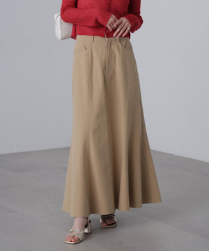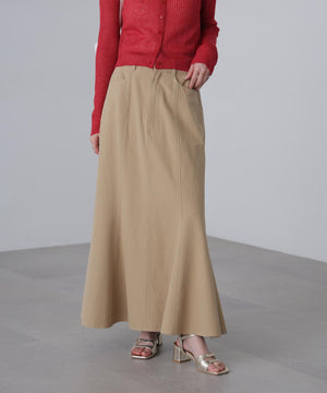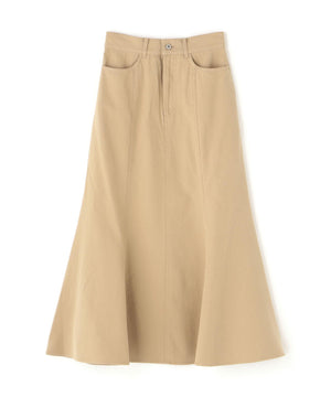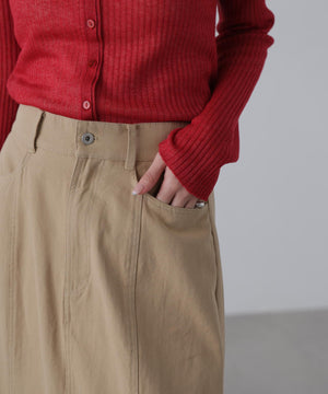〔fabric&design〕カジュアルなチノ素材で、あえてレディースなマーメイドスカートに落とし込んだ1枚。硬めのチノを水洗いし柔らかい風合いに仕上げることで、シワなどの軽減と着心地の良さが出ています。ヒップまわりはスッキリと、裾でフレア展開を増やしたメリハリのあるボディ感です。ウエスト周りはデニムパンツに用いられるリベットボタンとポケットで、見頃の切り替え箇所はダブルステッチでカジュアルをプラスしています。〔styling〕コンパクトめのデザインニットやタンクトップとのスタイリングがおススメです。