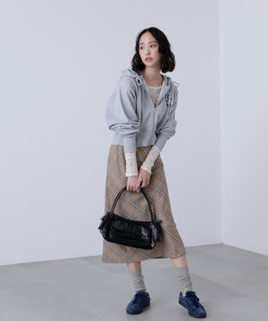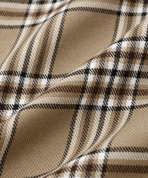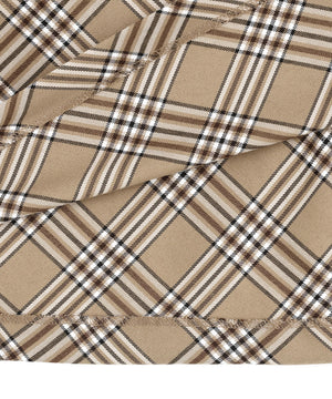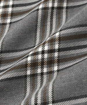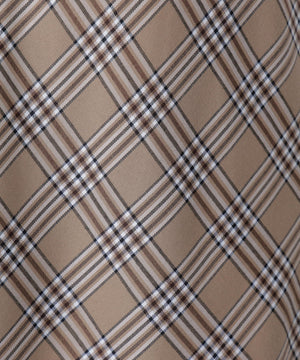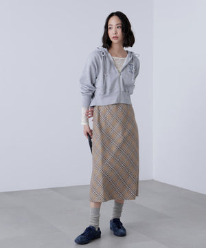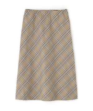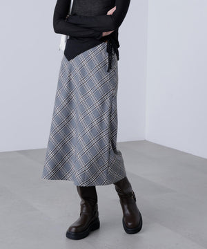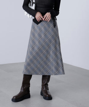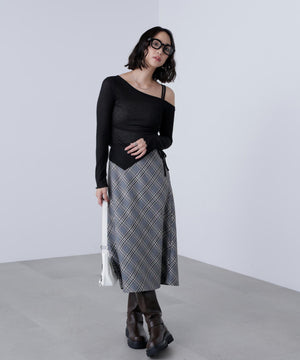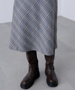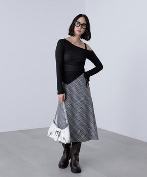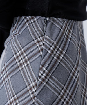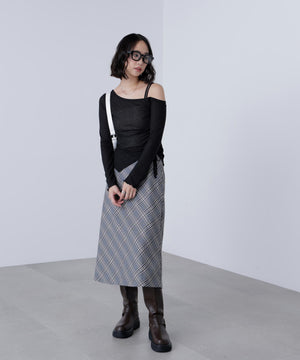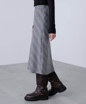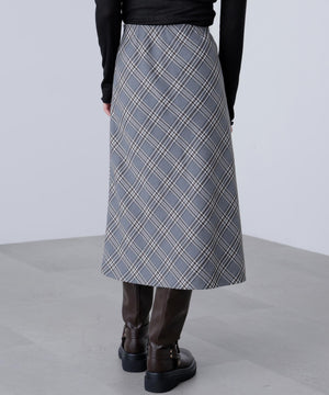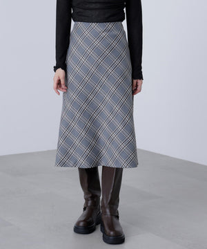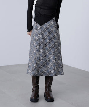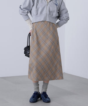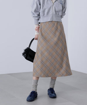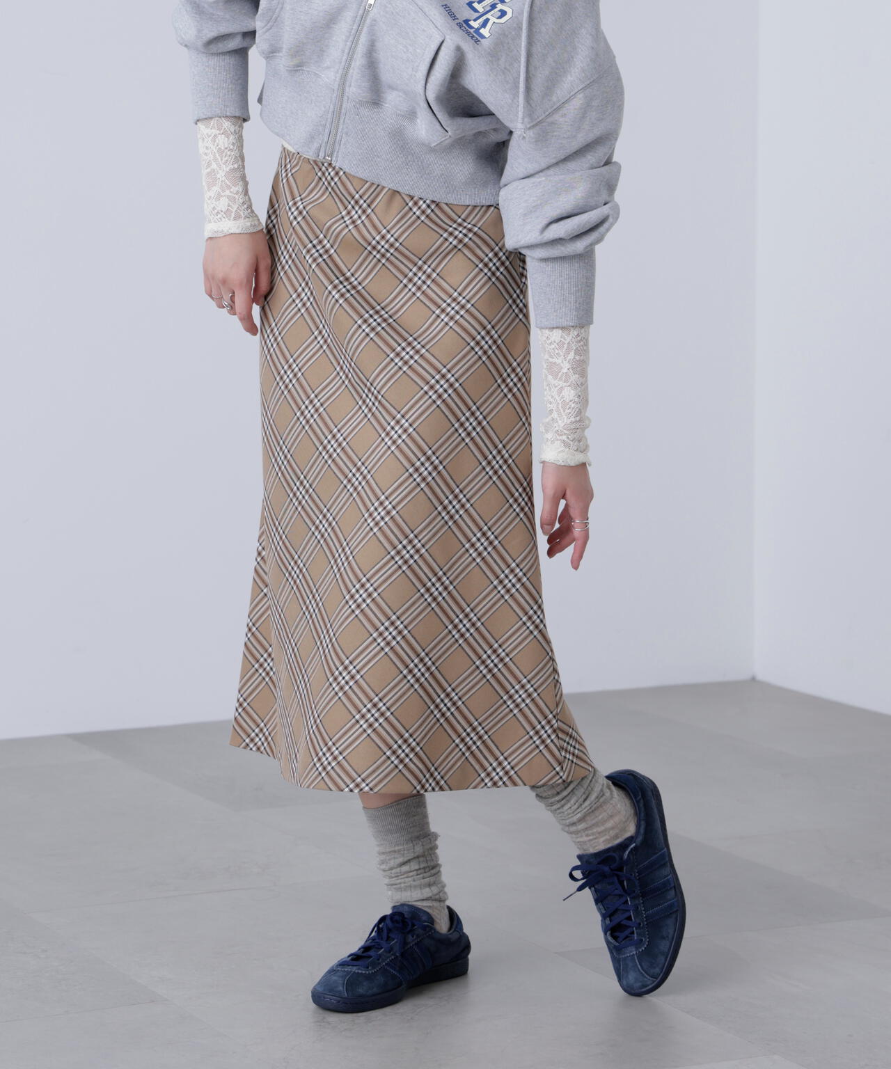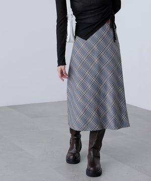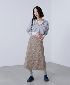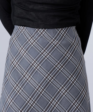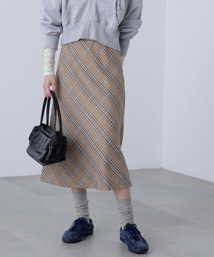 90年代を彷彿とさせるチェック柄の膝下丈のミニマルなスカート。斜めのバイアスにし自然なナローフレアラインを演出します。ウエスト端裏に平ゴムを入れ、わずかな伸縮性とフィット感をプラス。コンパクトトップスと合わせてY2Kスタイルがおすすめ。足元はソックス×ローファーでトレンド感を出せます。フレアパンツやデニムパンツとのレイヤードスタイルも楽しめます。