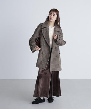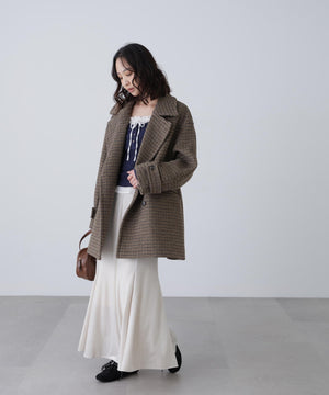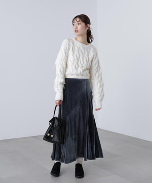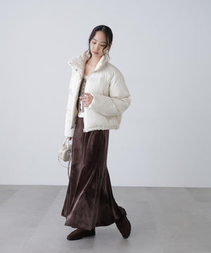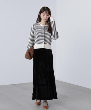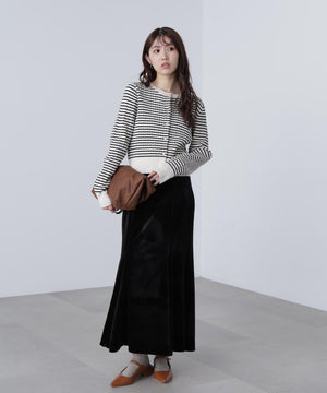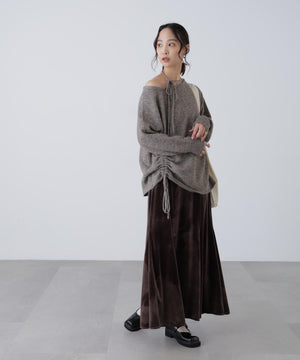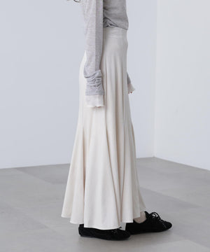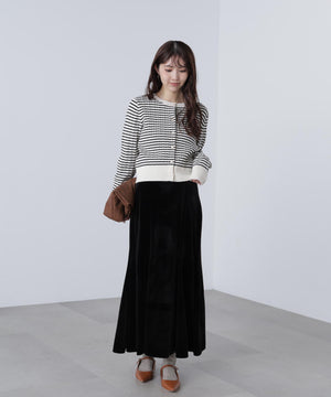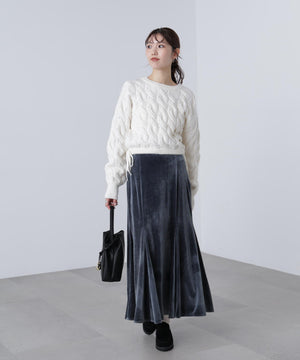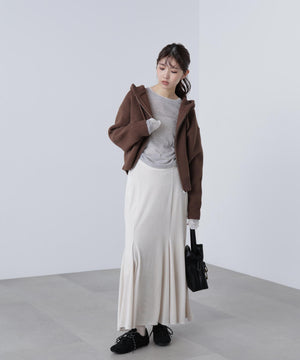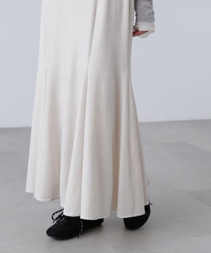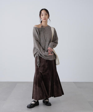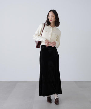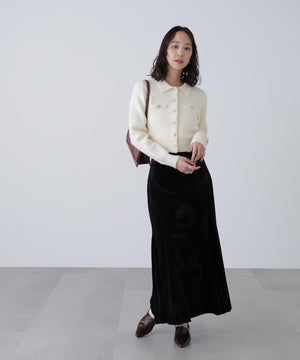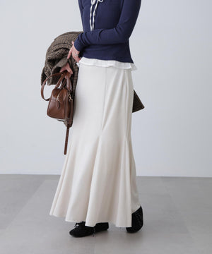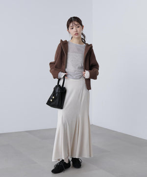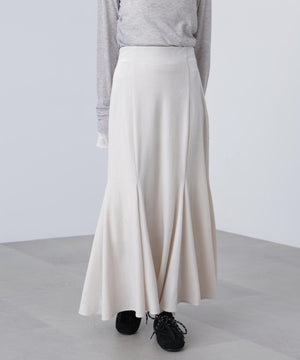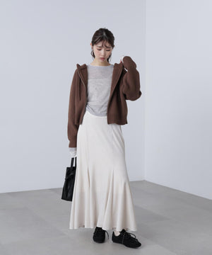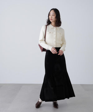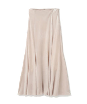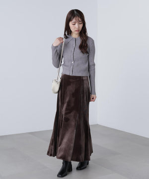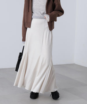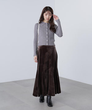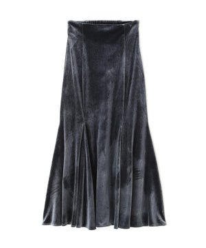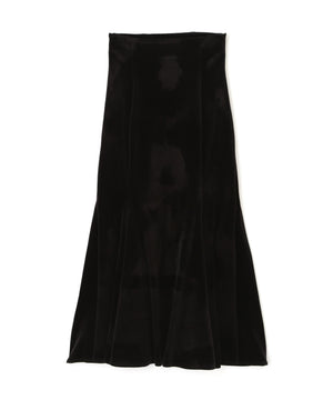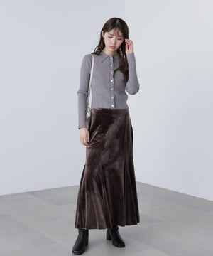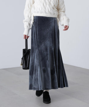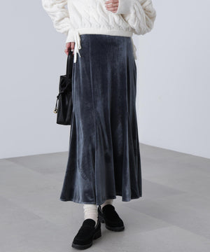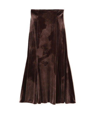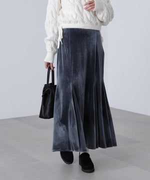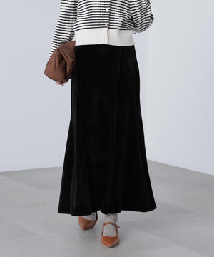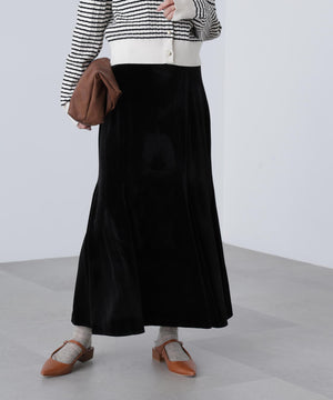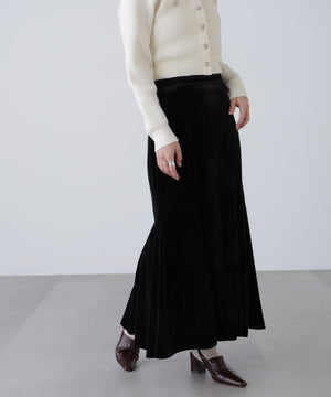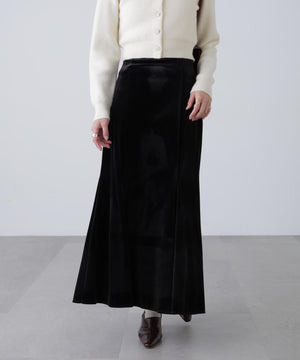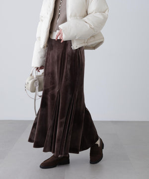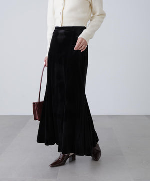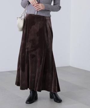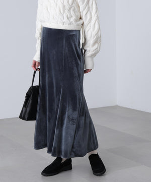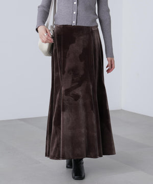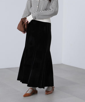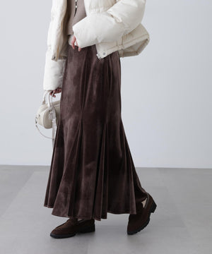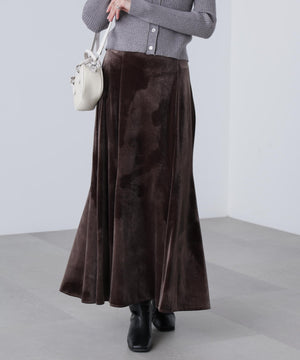 ご好評いただいたベロアマーメイドスカートが再登場!落ち着きのある光沢感で、着回しの効くマーメイドスカートです。インベルなしのすっきりとしたウエストデザイン、膝から裾にかけてフレア分量を出し、動くたびに落ち感と揺れ感が上品できれいなシルエットです。レディライクなコンパクトニットやフワモコニットは勿論、スウェット合わせもおススメです。今季トレンドのブラウンは新色です。