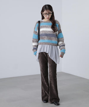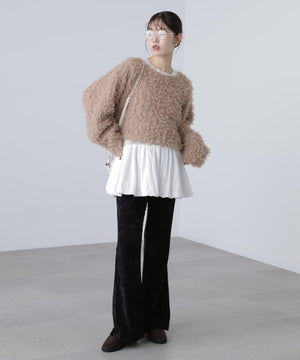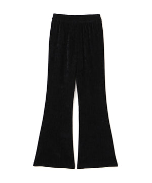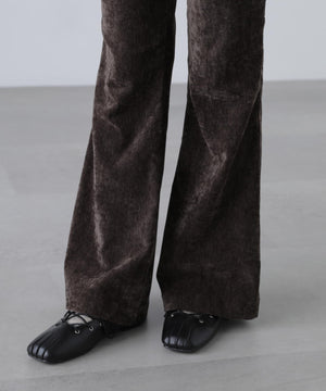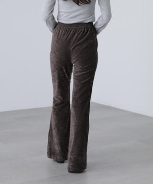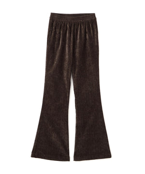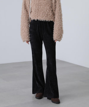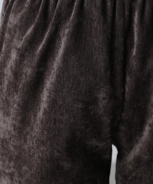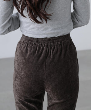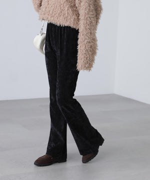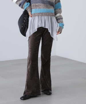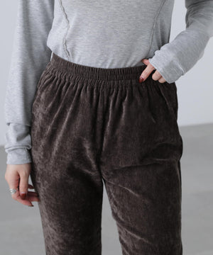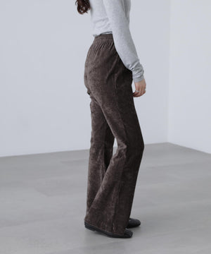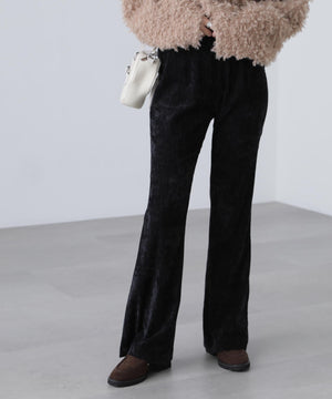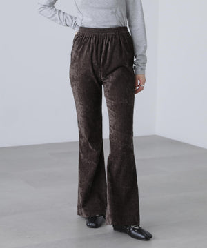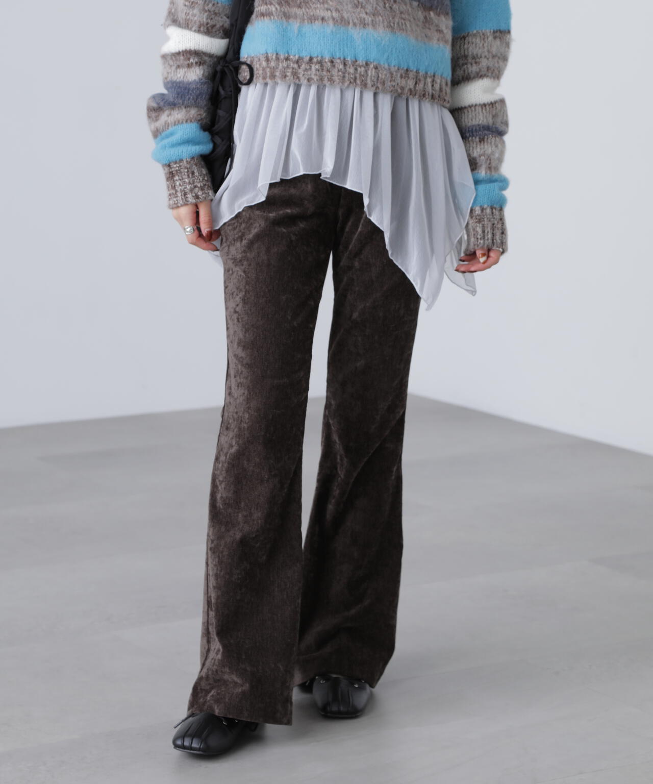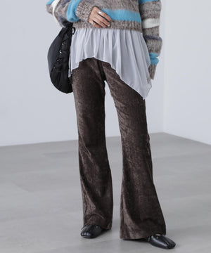 楊柳加工が入ったストレッチ性のあるカットソーベロアのレギンスパンツ。ももから膝まではタイトめシルエット、膝下からフレアにしており、レイヤードスタイルのアクセントになります。ウエストはゴム仕様ですがアタリが出ないようすっきりとした仕上がり。一枚着ではなく、トレンドのミニ丈キャミワンピースやミニスカートとのレイヤード用として着用いただけます。ラップスカートやバンダナを腰巻にしてアクセントを付けても可愛いです。