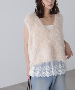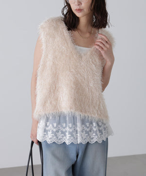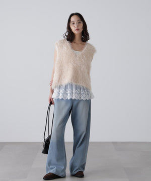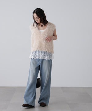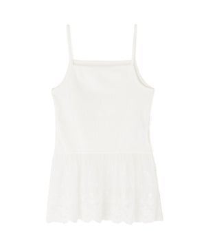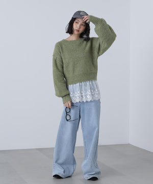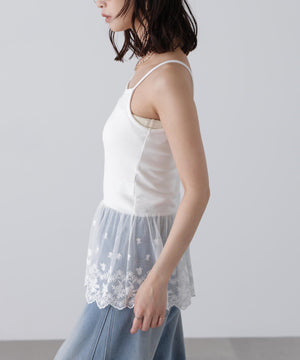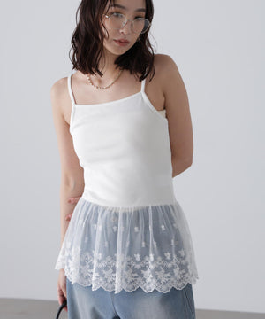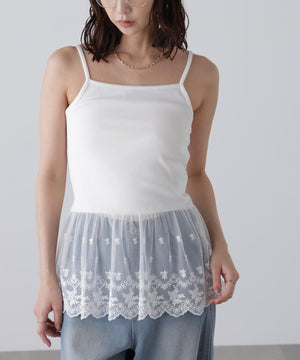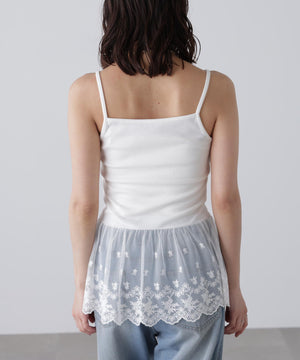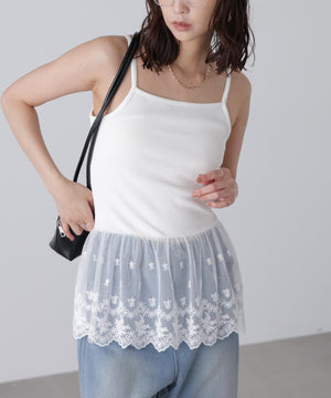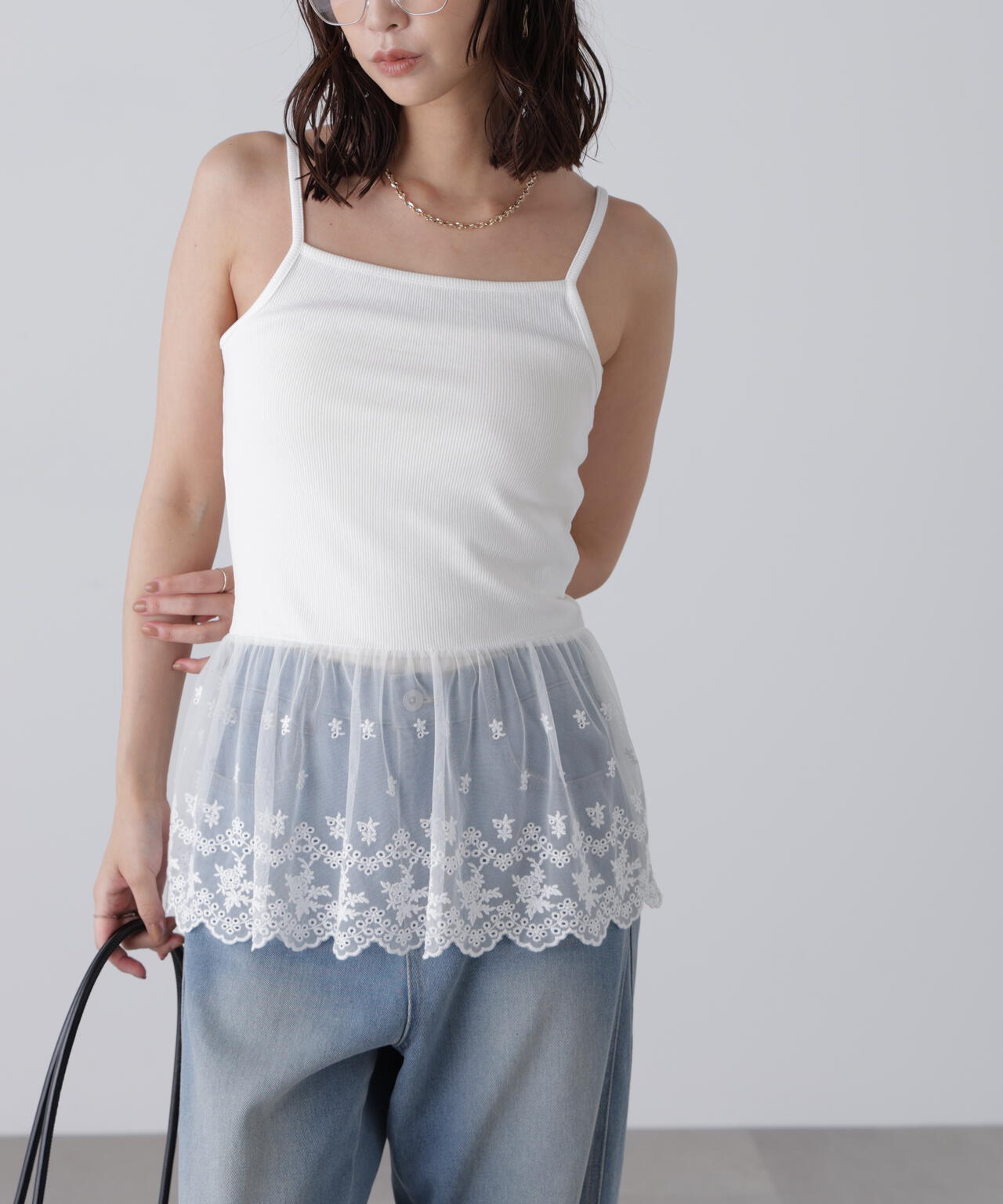 裾にレースをドッキングしたキャミ型トップス。しっかりとした肉感のリブカットソーにレースをドッキングしたデザインです。レース切り替え部分はギャザーを寄せているため、レイヤードするとスカートを合わせているような雰囲気になります。どんなトップスとも重ね着しやすいよう、レースの切り替え位置にも拘ったデザイン。ニットやスウェットのインナーとして、裾からレースを見せるコーディネートが一気に今年らしく決まります。ロングシーズン使えるので1枚もっていると便利です。