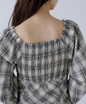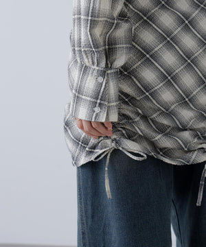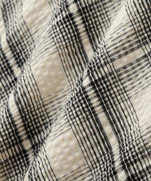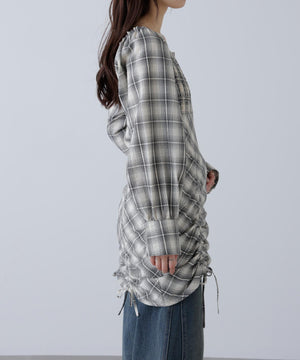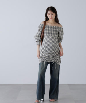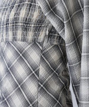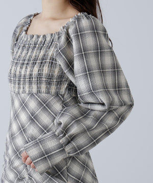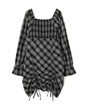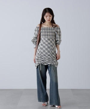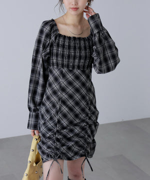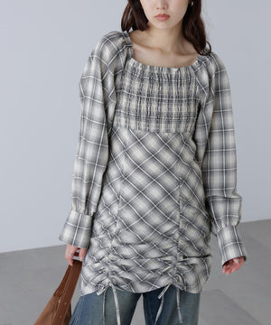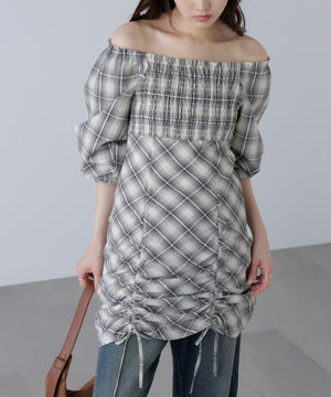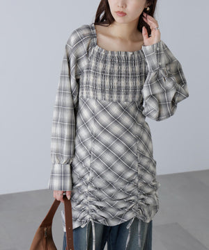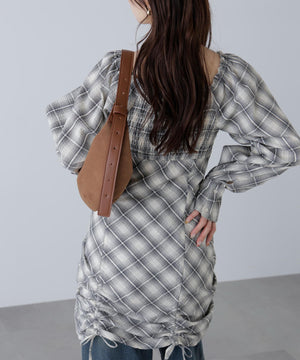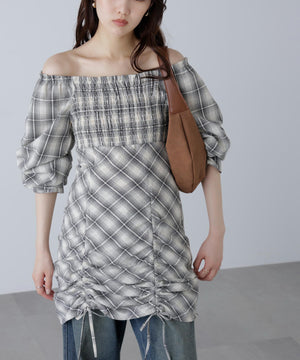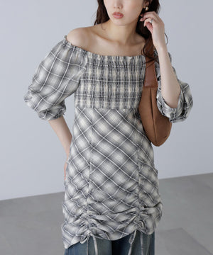 ぽこぽことした表面感のサッカーチェック素材のミニワンピース。襟ぐりはゴム入りなので、スクエアネックとオフショルダーの2wayで着回せます。バスト部分はシャーリングゴムでフィットしながら着心地もよく、スカート部分のチェック柄を斜めのバイヤス取りにする事で、スタイルアップして見えます。バスト下から裾まで共地ドロスト(紐)で着丈の調整可能。裏地付きのため透けも気になりません。ウエストはシェイプしていますが、左脇にコンシールファスナーが付いているので着脱しやすいです。少しだけ紐を絞ってミニワンピースとして着る場合、トレンドのウエスタンブーツ合わせが今年らしくておすすめ!紐を思いっきり絞ってギャザーを寄せるとチュニックになり、フレアデニムとのレイヤードも楽しめます。