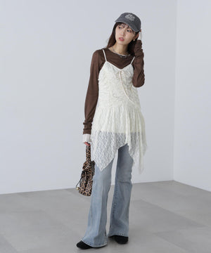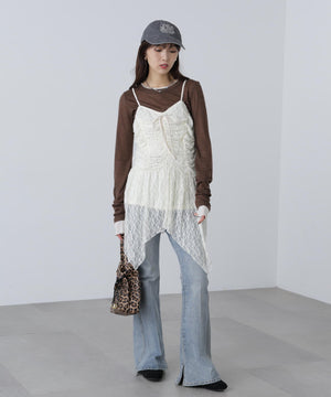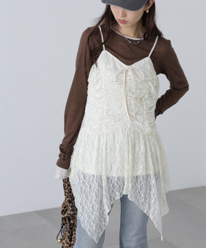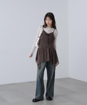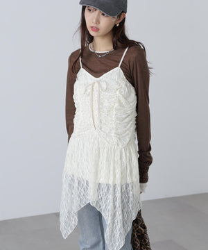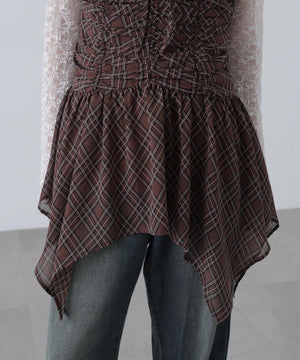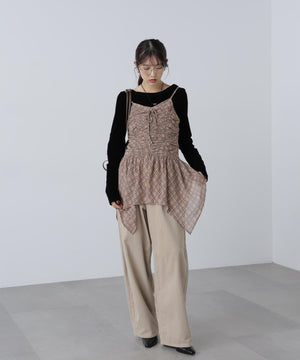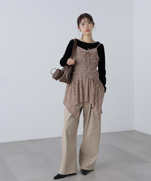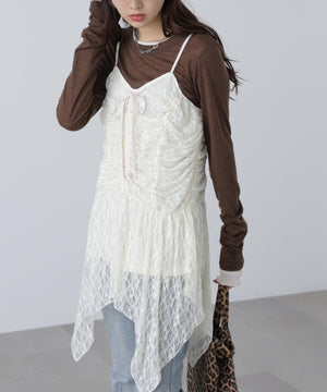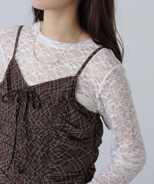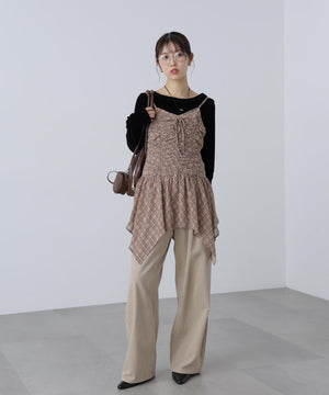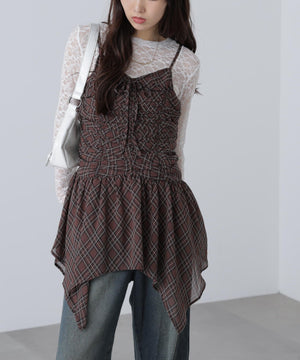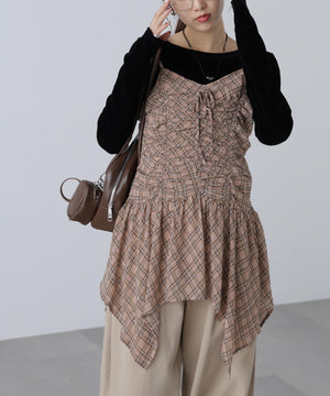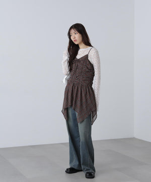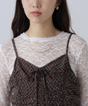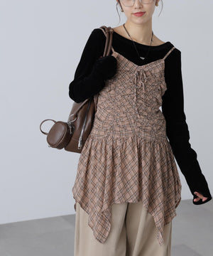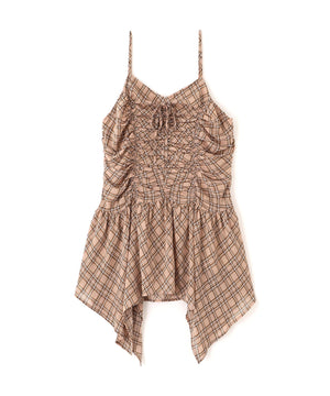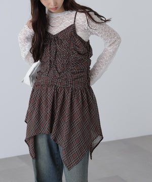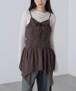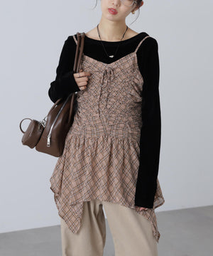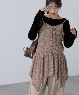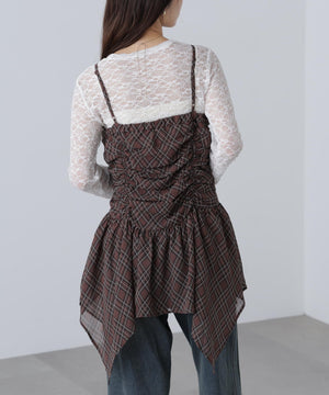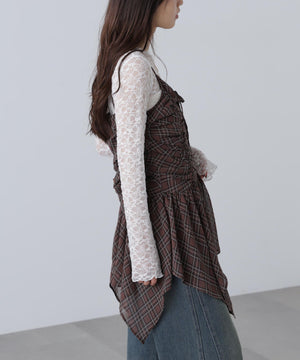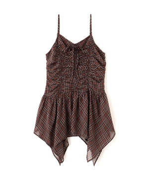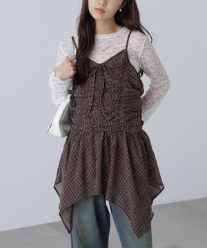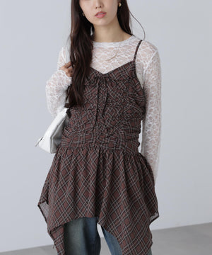 ドローストリングでボディの表情を出したイレヘムデザインのキャミワンピース。トレンドのチェック柄(ベージュ・ブラウン)とレース生地の3展開です。身頃バストに平ゴムを内装しているのでボディにフィットし、ニットやカットソーとレイヤードしやすいです。肩紐は長さ調節可能。ワンピースとして着用される場合はショートパンツ合わせがお勧めです。デニムパンツやスラックスと合わせると、旬なレイヤードスタイルを楽しめます。
