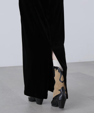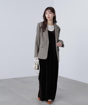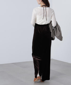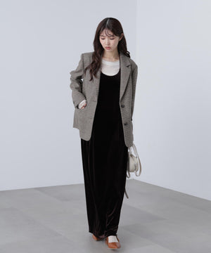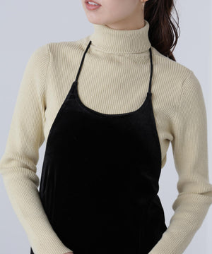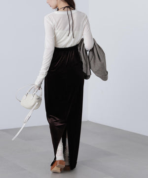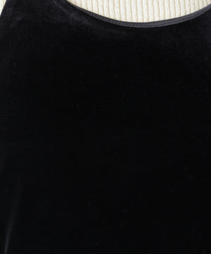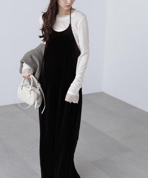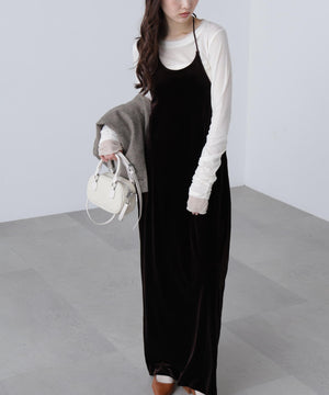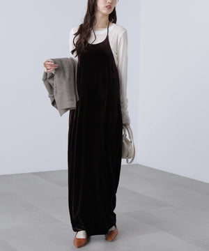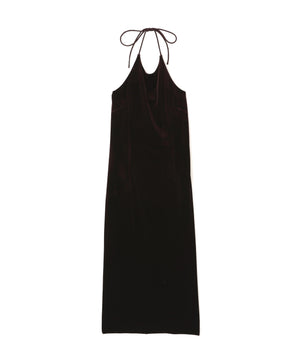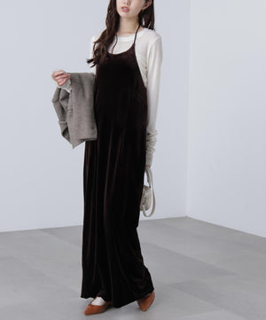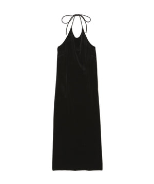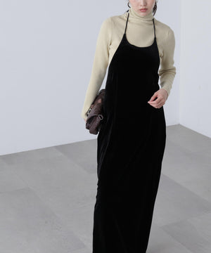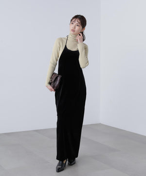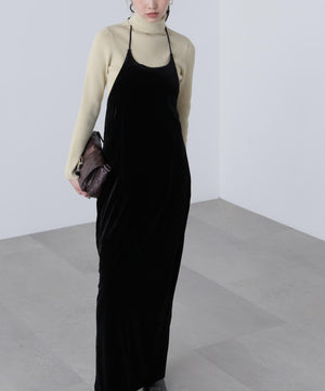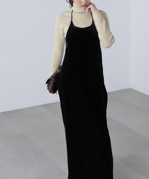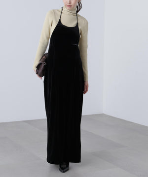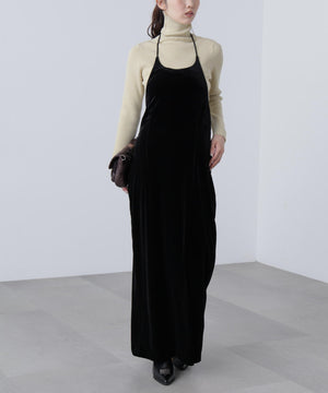 上品な微光沢のジャージベロア素材を使い、注目ディテールのホルターネックを取り入れたキャミワンピース。体に沿うようウエストシェイプしたナローマキシシルエットに、バックスリットを入れてエレガントな印象を演出。表地と裏地もやや伸縮性があるため、タイトなシルエットながらも着やすくなっています。後ろはゴムを内蔵しており、滑り落ちない仕様に。中にクルーネックやボートネックニットとのレイヤードがおすすめ。1枚で着るとオケージョンシーンにも活躍してくれます。