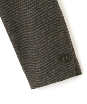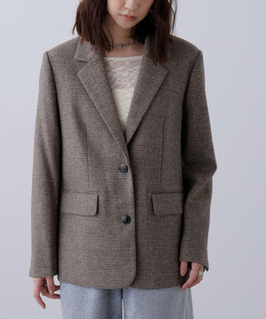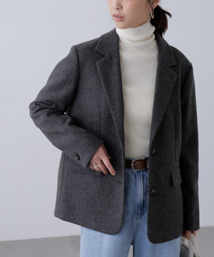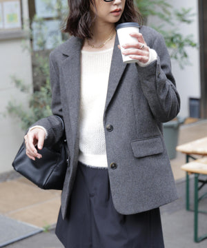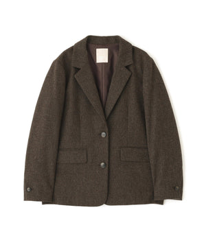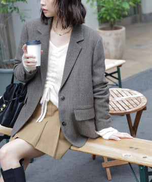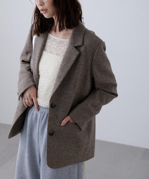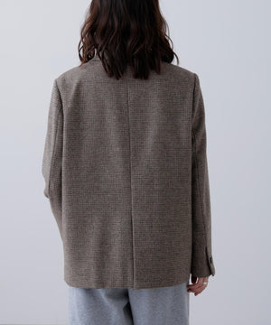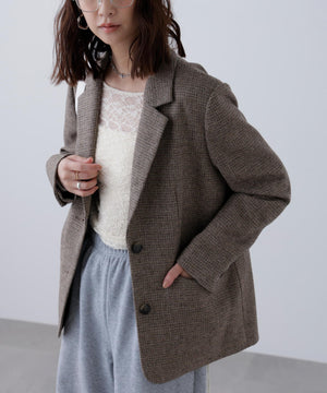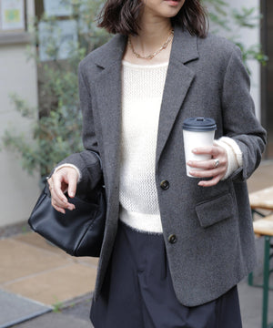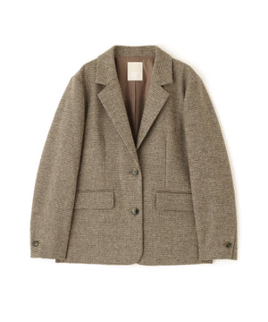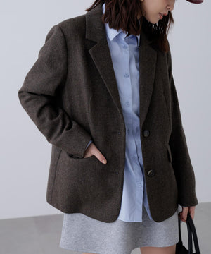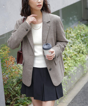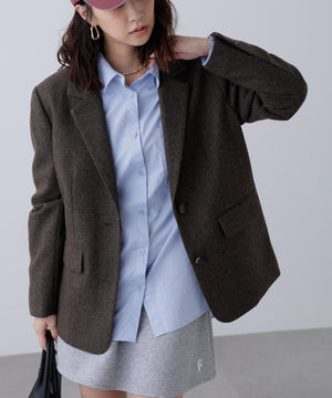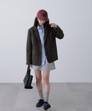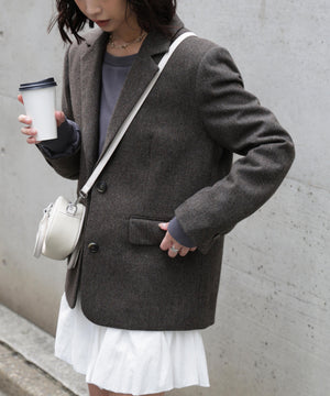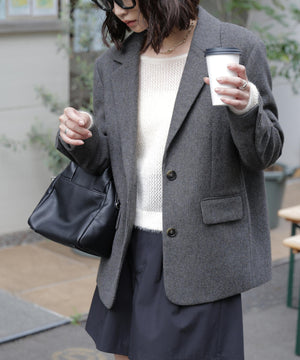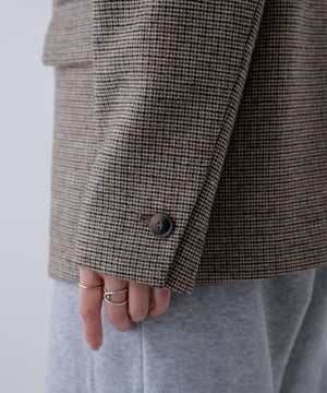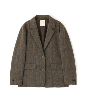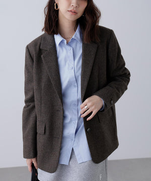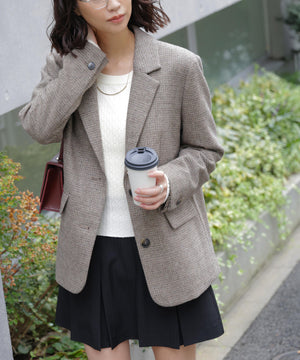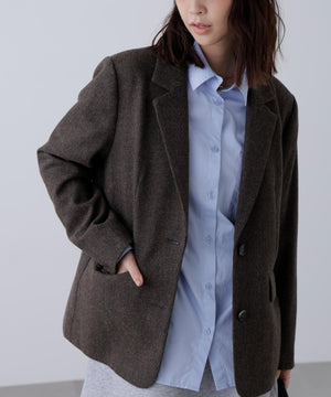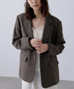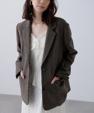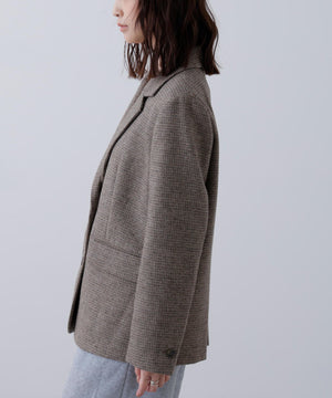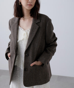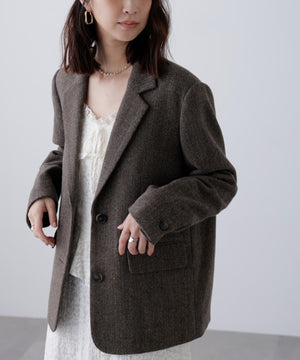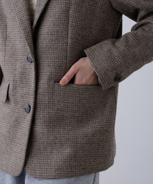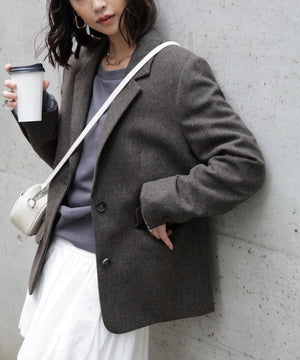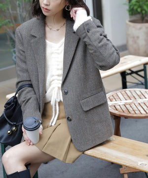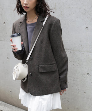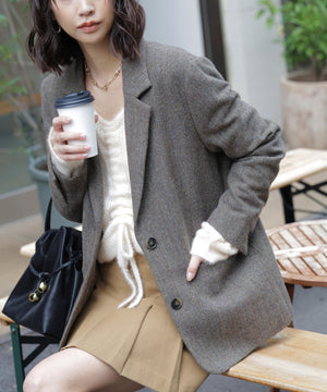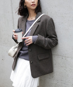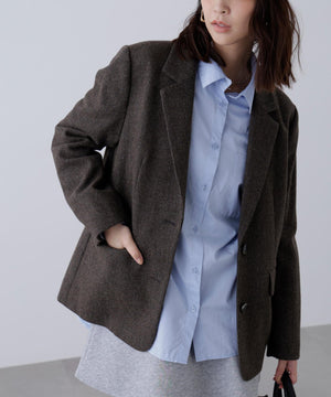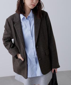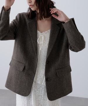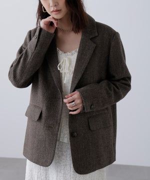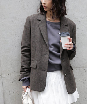 程よいオーバーサイズがこなれた雰囲気で着られるシングルジャケット。袖口は本開きで、一つボタンでアクセントをつけています。オーバーサイズなので中に着込めるのも◎。軽いアウター感覚でもお使いいただけます。ジャケットのインにフリルやボウタイのブラウス、またニットやスウェットなども。ボトムスにフリルスカートを合わせてレディライクに、スウェットパンツやデニムと合わせてカジュアルにもおすすめです。クラシックな印象のウール混先染めシリーズです。小柄で奥行きのある先染めガンクラブチェック3色と、ブラウンベースに多色使いがあたたかみのあるヘリンボーン生地1色を揃えています。