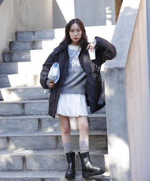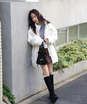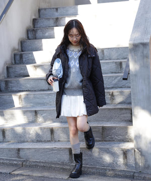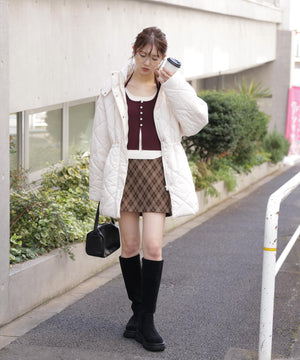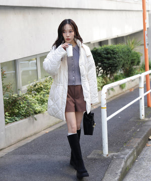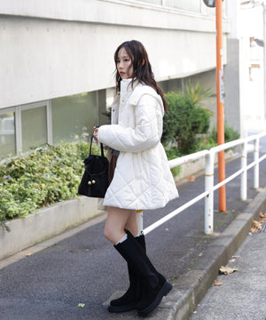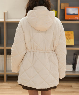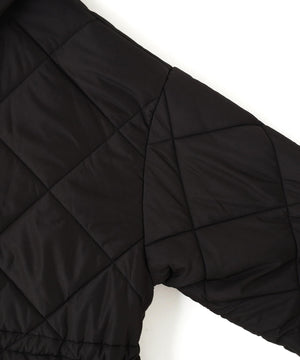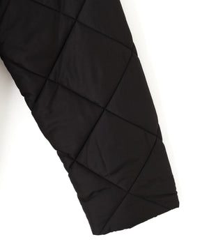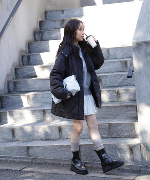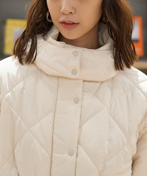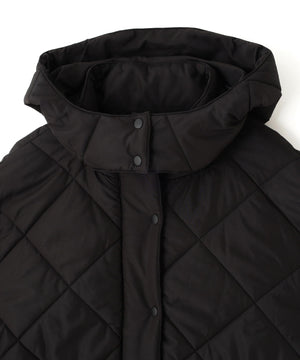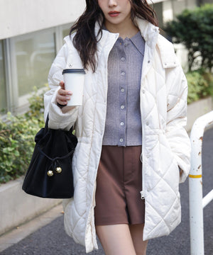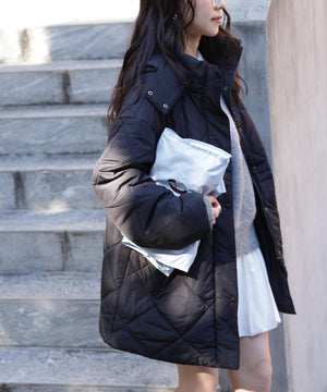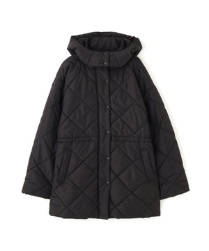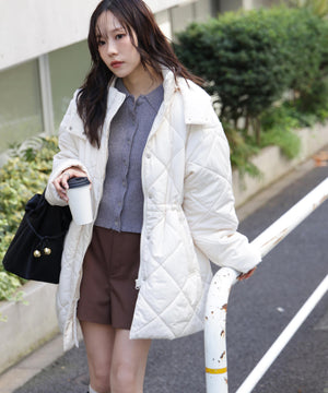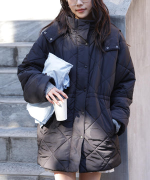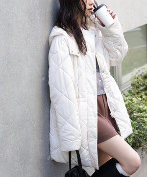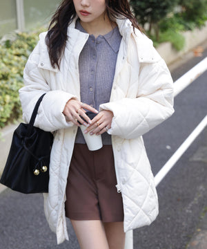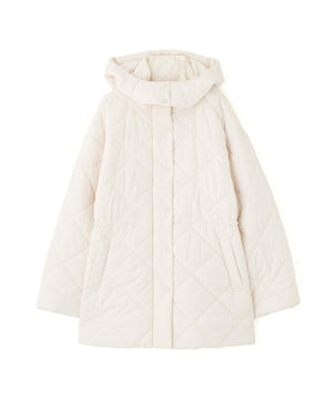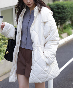 ダイヤ柄のキルティング加工を施した中綿コート。ソフトな風合いのタフタ素材を使用しています。フロントはジップとドット釦を使っているので防寒対策もばっちり。大きめのポケットもポイントです。ウエスト内側にあるドローコードを絞るとシルエットにメリハリを作れるデザイン。フードは取り外し可能なので、シンプルなスタンドネックとしても楽しめます。デニムやミニ丈ボトムス、大人なナロースカートまで相性抜群です。