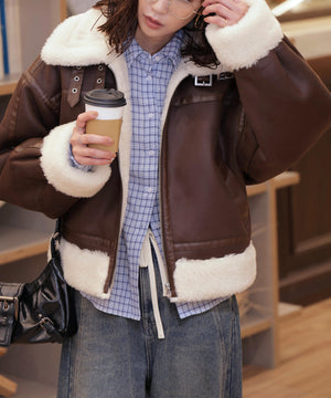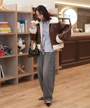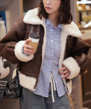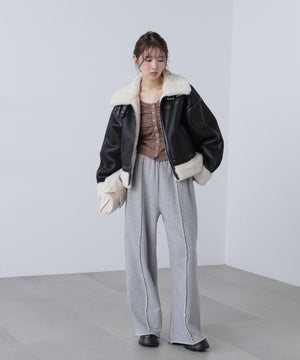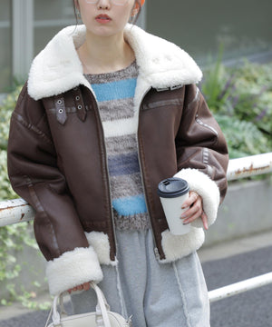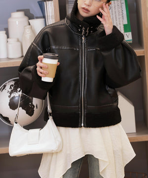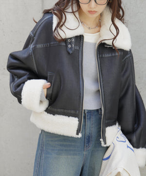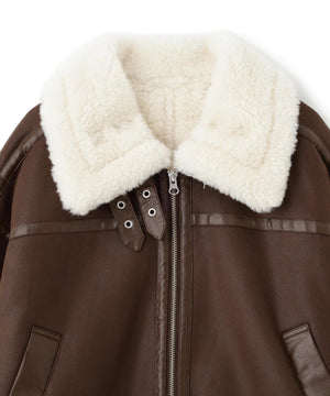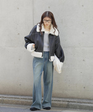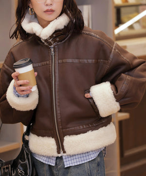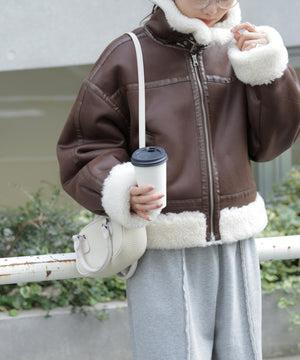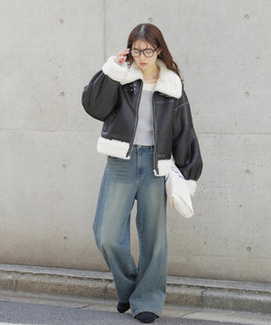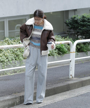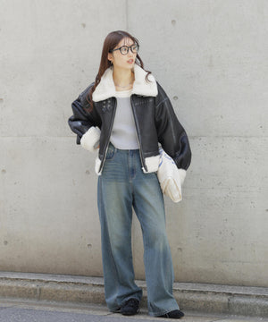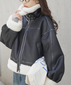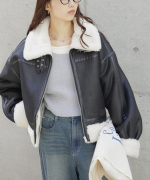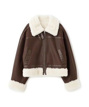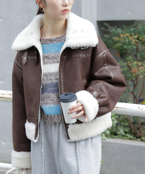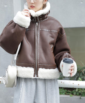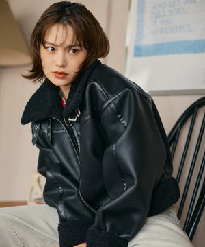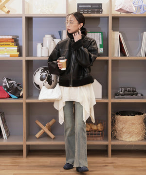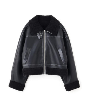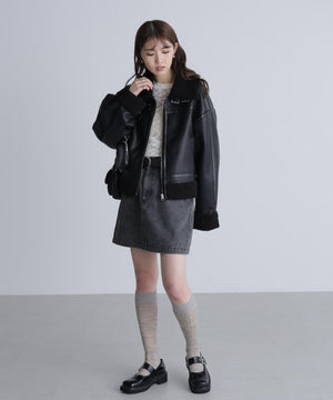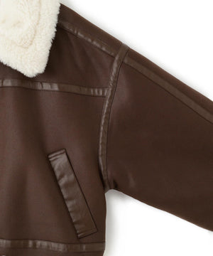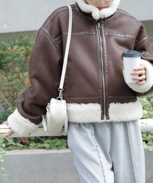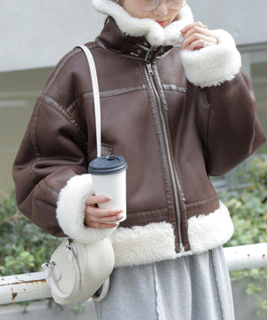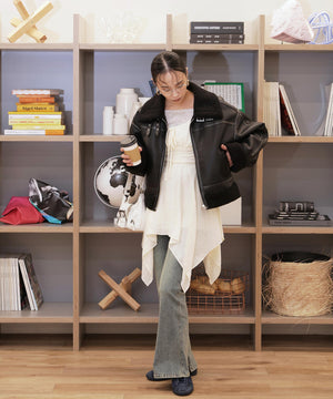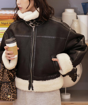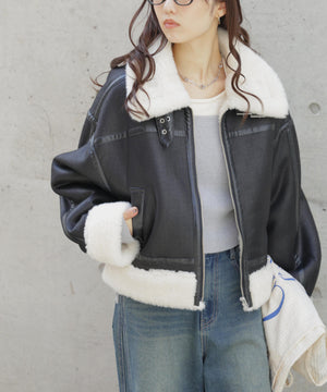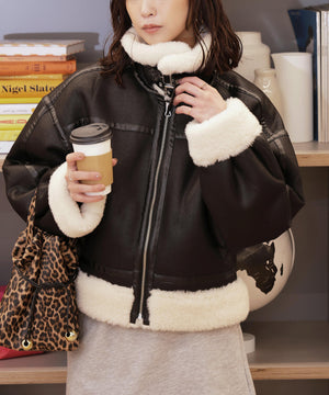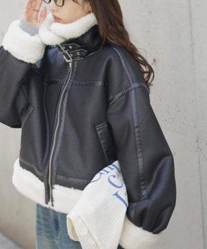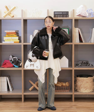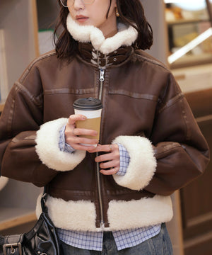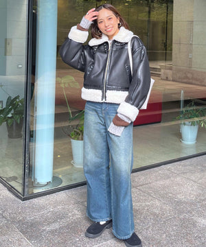毎年好評のボンバージャケットが今年も登場!スウェードは昨年と同カラーです。フェイクレザー見えの新色はスウェードより少しはハリ感があるため、タック分量を調整してすっきり見えるサイジングにしています。やわらかい肌ざわりのジャスト丈のボンバージャケット。配色のボアもボリューム感があり暖かい万能アウターです。少しゆったりとしたサイズ感はメンズライクですが、袖にパフを入れているのでフェミニンなディテールに。衿はスタンドになる2wayデザインです。身頃の切り替え部分にレザーを叩きつけているのもさりげないポイント。メンズライクなサイズ感なので、スカートなどと合わせて甘辛IXなコーデがおすすめです。カジュアルにスラックスやデニムなどとも合わせやすいので一枚持っていると着回し抜群です。