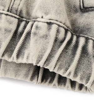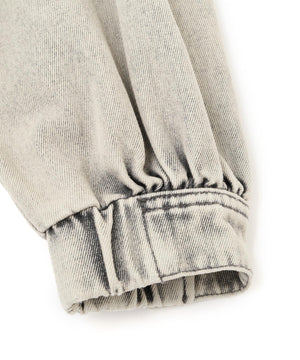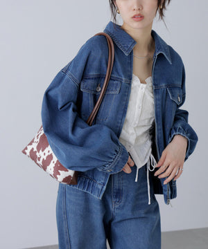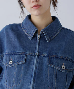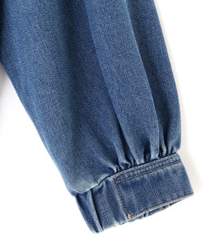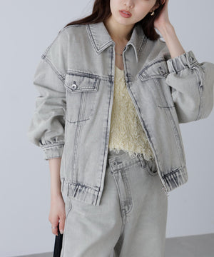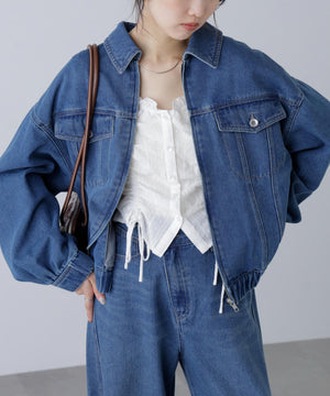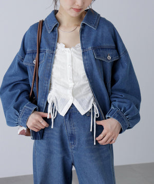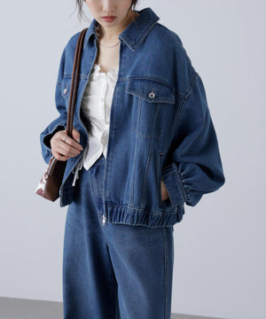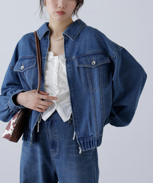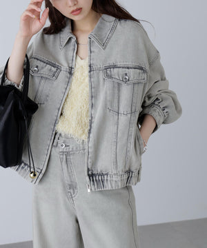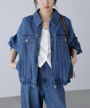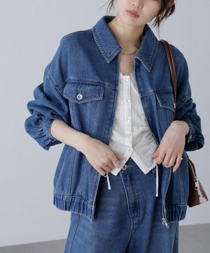 程よいゆとりのあるサイズ感で、ブルゾンライクに仕上げたデニムジャケット。裾にタックを入れて丸みを出したラフなシルエットです。袖口と裾は平ゴムを通したギャザーディテールを加えて、ハードになりすぎない仕上がりに。袖口はカフスのような本開き仕様です。合わせるアイテムを選ばず、1枚もっていると様々な着こなしを楽しめるアウターです。カジュアルなボトムスとも相性が良く、同シリーズのビスチェ(店舗商品番号131-5210071)、デニムパンツ(131-5230056)を揃えたコーディネートもおすすめ。「ライトグレー」ブラックデニムをケミカル加工でブリーチした、淡色の表情が雰囲気あるイチオシカラーと、「ライトインディゴオーバーダイ」程よい中濃色にオーバーダイで仕上げた、ヴィンテージライクな雰囲気のカラーです。