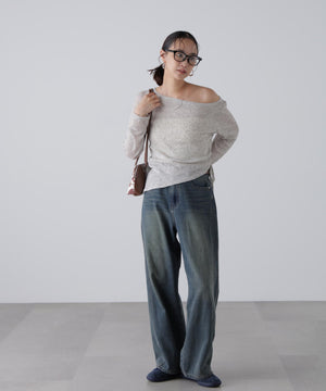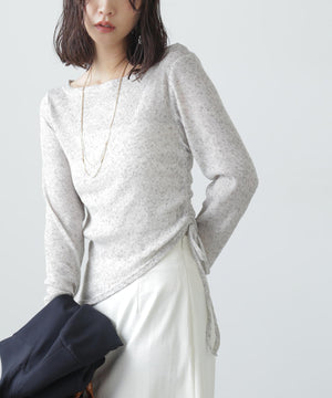 メランジ調のニットソー素材のデザイントップス。メランジカラーでカジュアルな雰囲気を演出し、シンプルながらもアクセントになるカットソーです。裾はアシンメトリーヘムデザインで、左脇は共地リボンで絞れるドロスト仕様。首は広めで抜け感があるのでカットソー同士のレイヤードや、ジャケットやカーディガンのインナーとしてもバランスよく着られます。ポイントはアシメヘムなので、シンプルにデニムパンツを合わせるだけでもスタイリングが決まります。