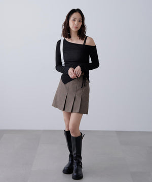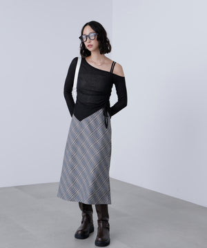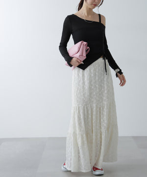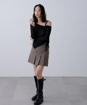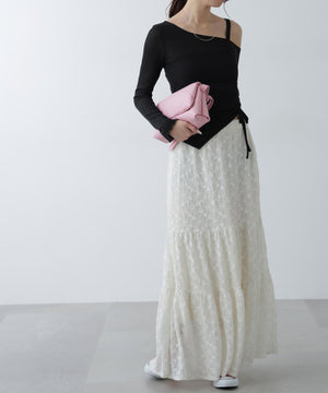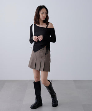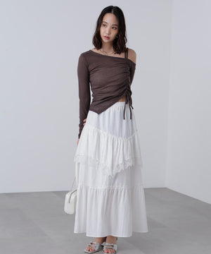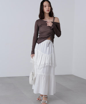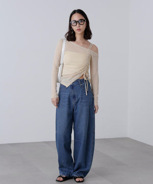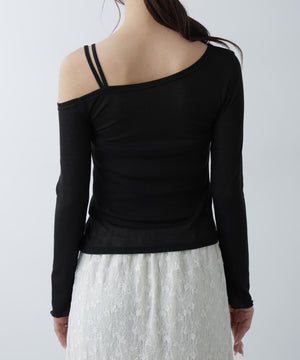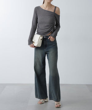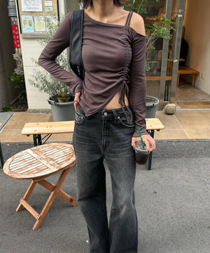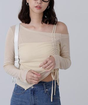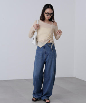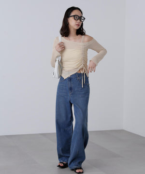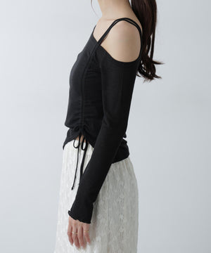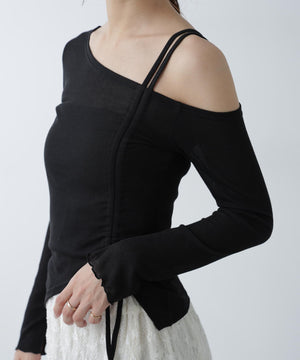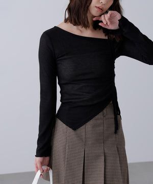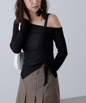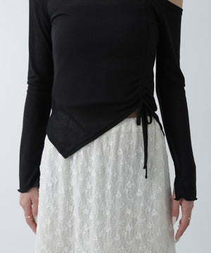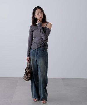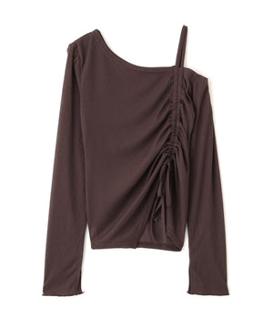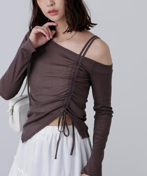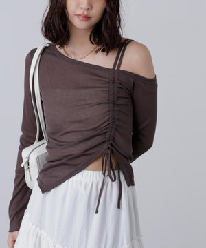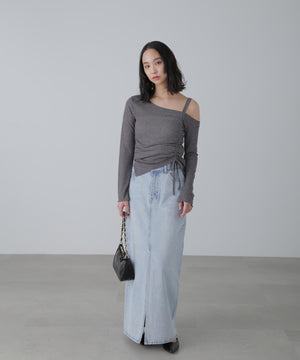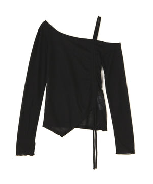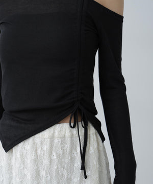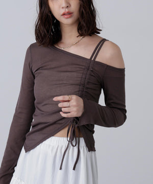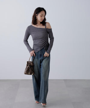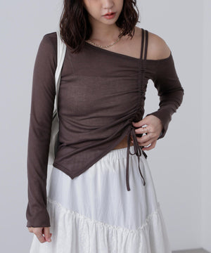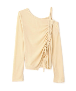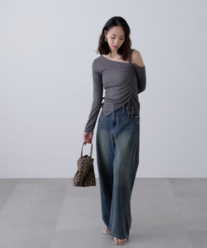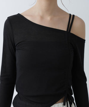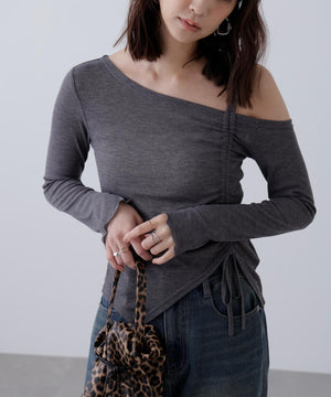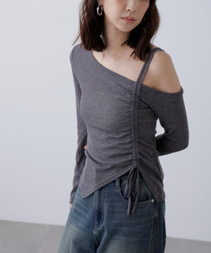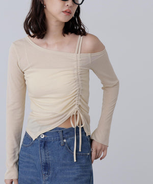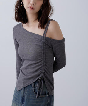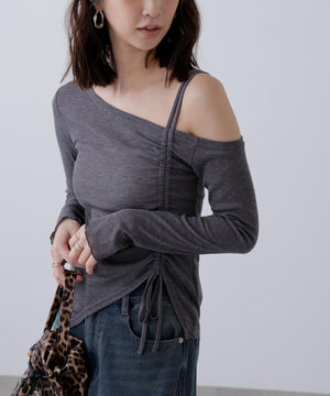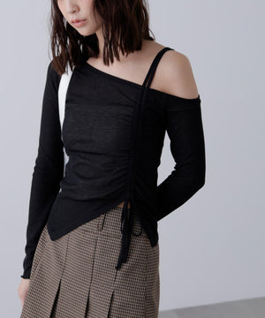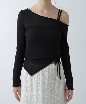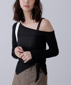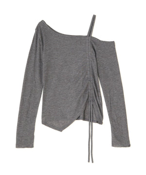 柔らかいタッチのシアーカットソー素材のカットソー。ワンショルデザインで肩紐から前身頃までドロストをあしらい、ギャザーを寄せて立体的なデザインに。裾もアシメトリーなヘムにしてポイントを付けています。袖口はスリットを入れて抜け感をプラス。コンパクトなシルエットなので、ワイドデニムでカジュアルな着こなしがおすすめ。フェイクレザースカパン合わせで辛目スタイリングもイチオシです。