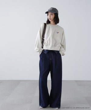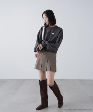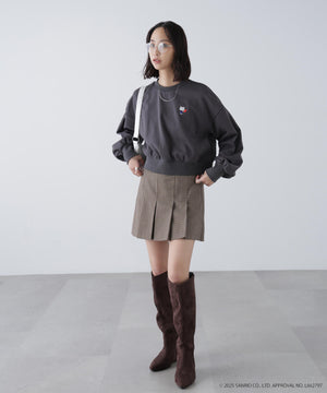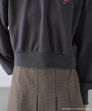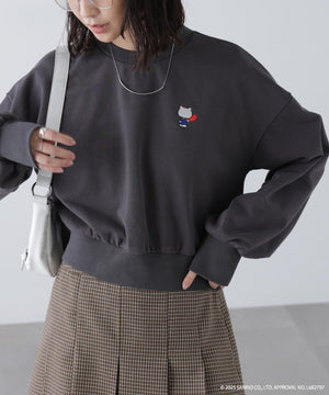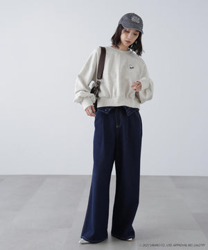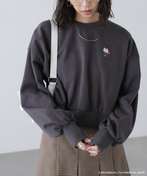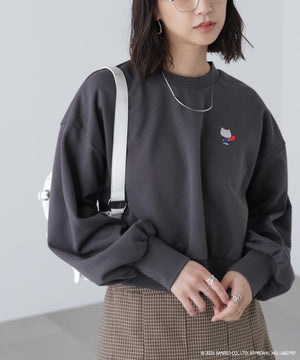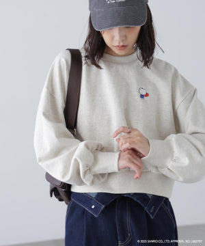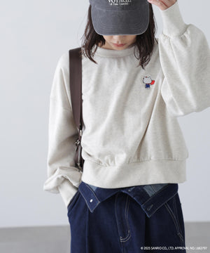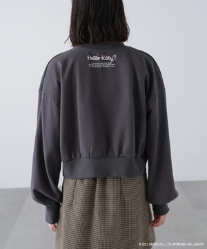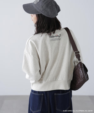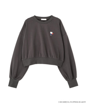 厚手の裏毛素材を使用したショート丈スウェット。左胸はハローキティの後ろ姿のワッペン刺しゅうを、後ろネックはロゴ刺しゅうを入れた、可愛らしさとさり気ないポイントで普段使いしやすいデザインです。裾リブはギャザー入り、袖は丸いフォルムが出るボリュームスリーブもポイント。ショート丈なのでトレンドのコクーンシルエットのデニムやナローロングスカートなどがおすすめ。ミニ丈とも合わせやすいため、ボトムスを選ばずに着用いただけます。