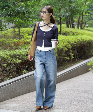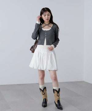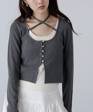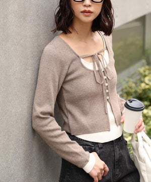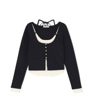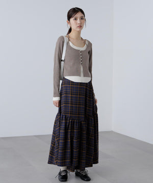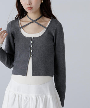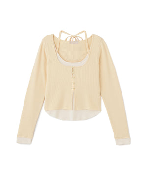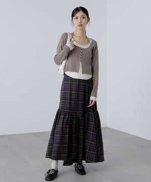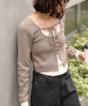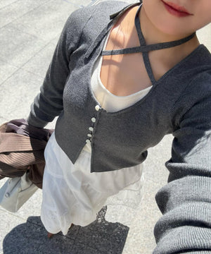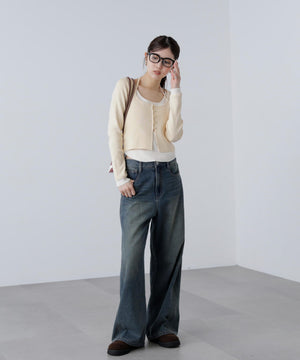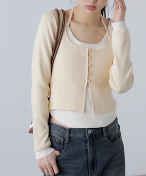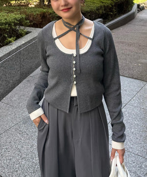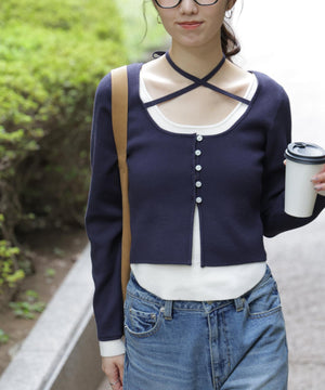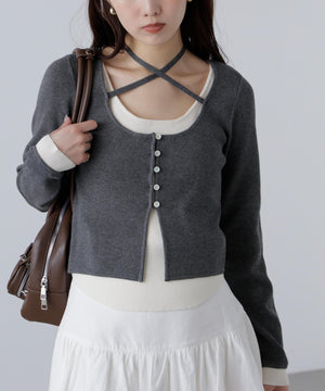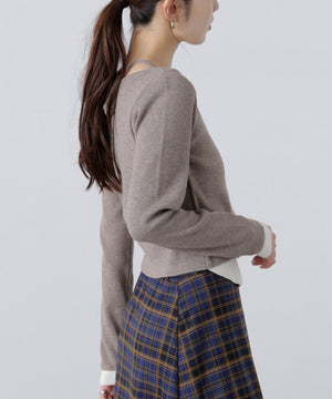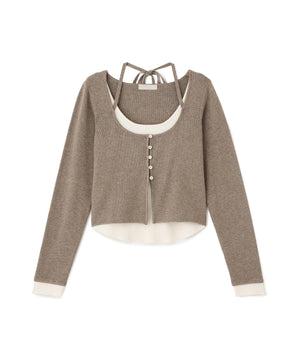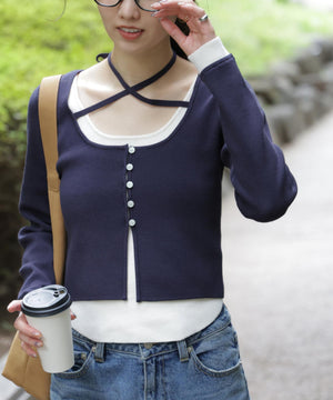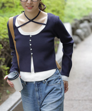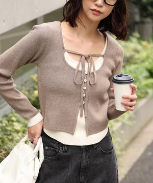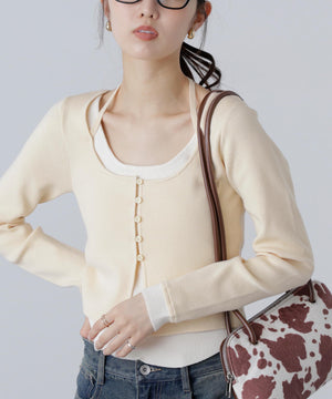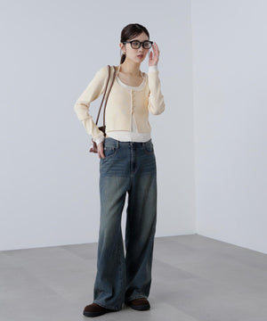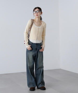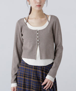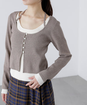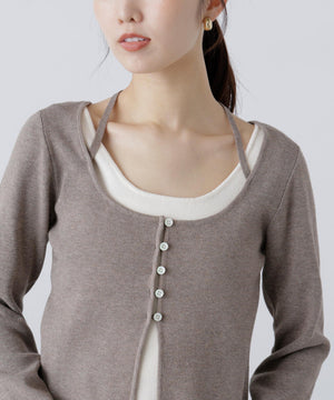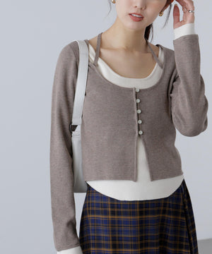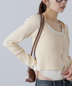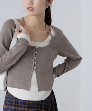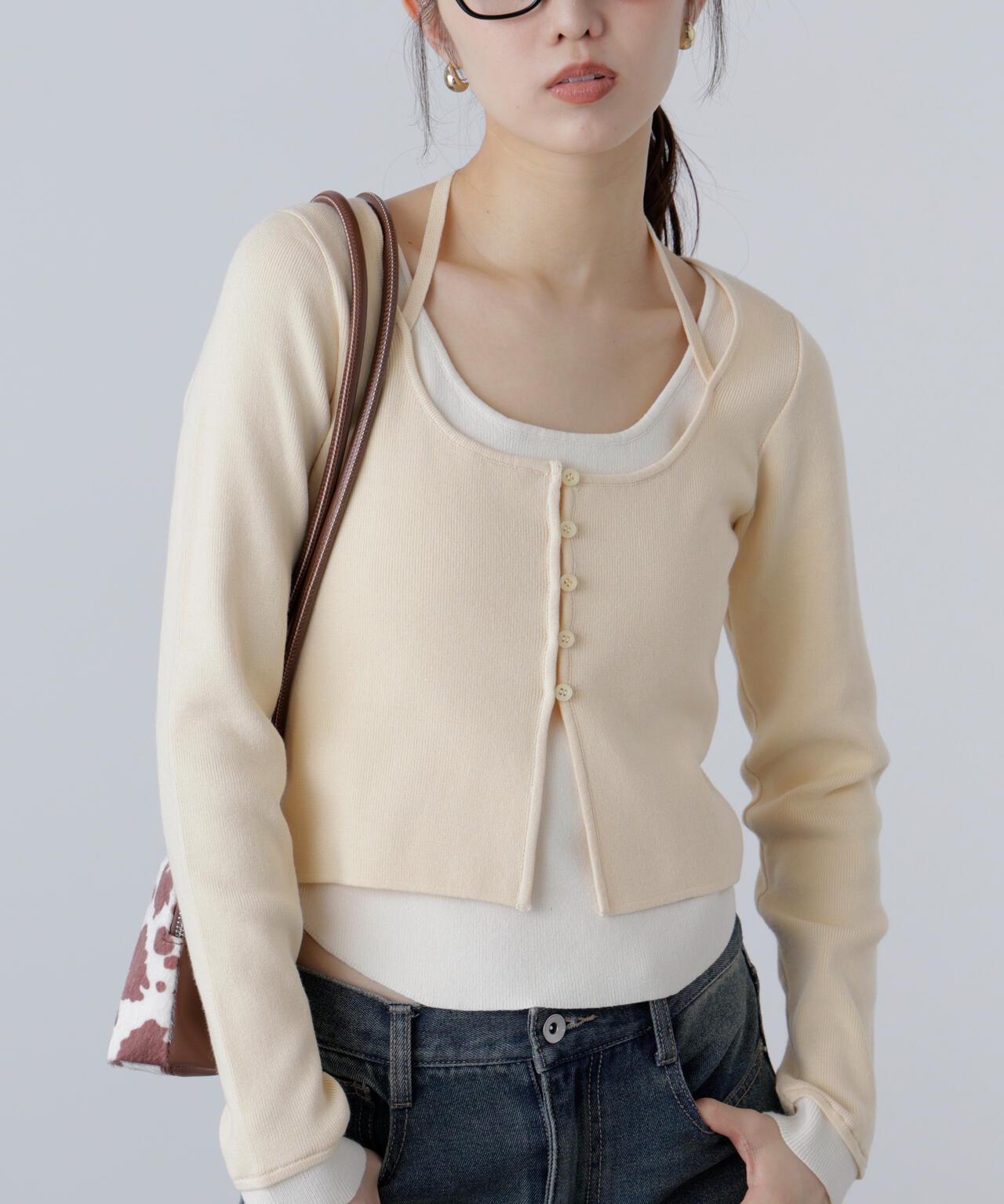 配色を楽しめるニットカーディガンの中にキャミソールをドッキングしたレイヤードアイテム。袖口と裾から配色インナーがチラ見えするデザインです。カーディガンは総針で、フラットな目面で型崩れしないよう目の詰まった編地です。インナーはリブ編みで、同じ糸でも表情の変化が出るようにしています。深めに広げた襟ぐりでも、インナーが入っているので着やすく、デコルテをキレイに演出。デニムパンツなど、カジュアルパンツとのコーディネートがおススメです。