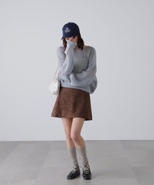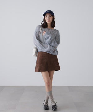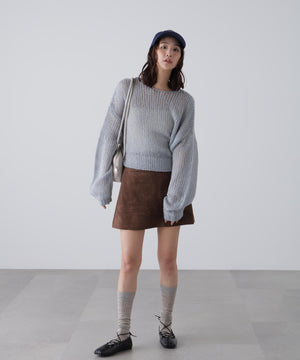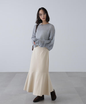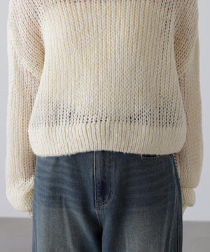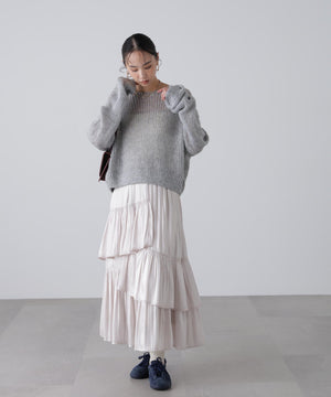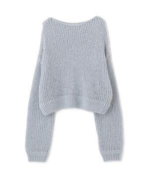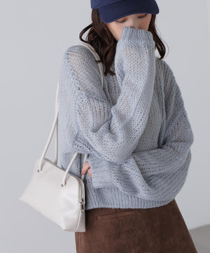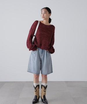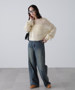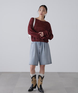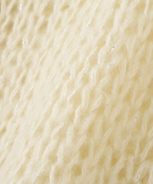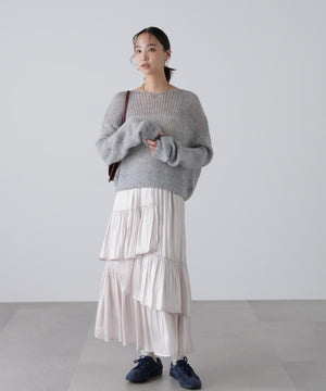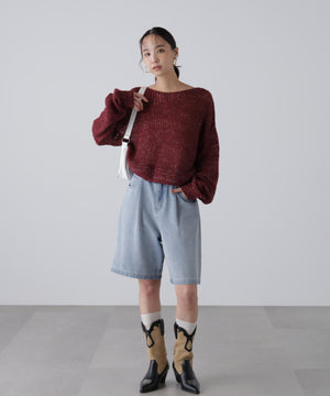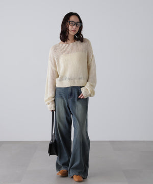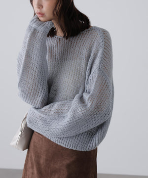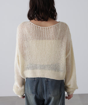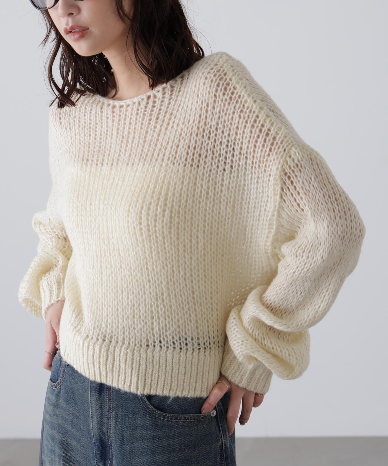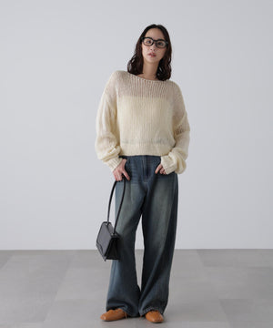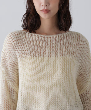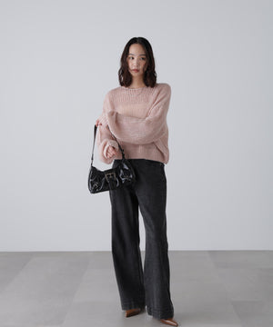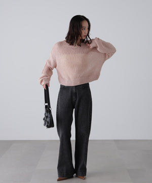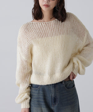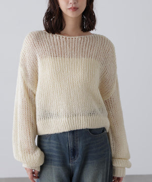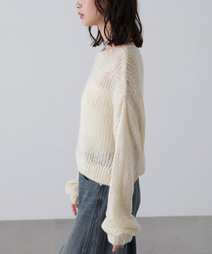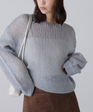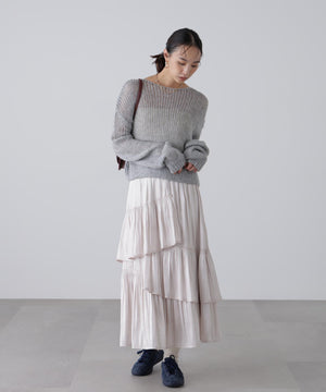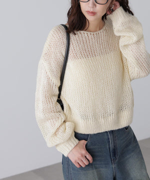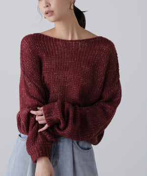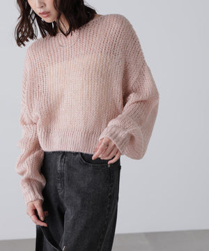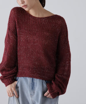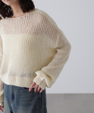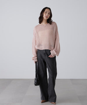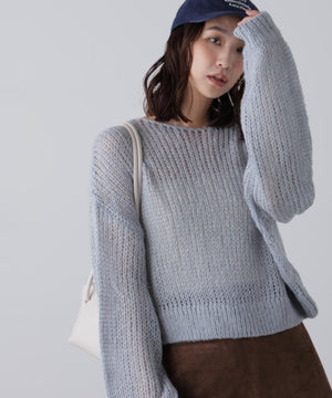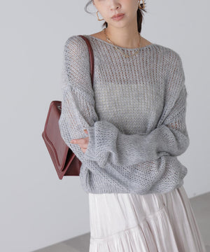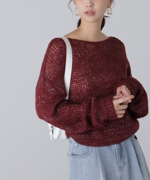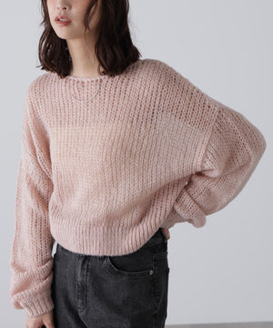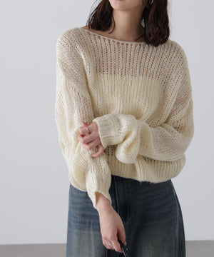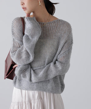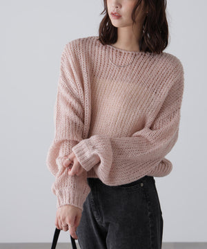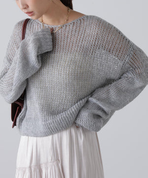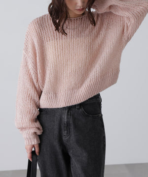 毎年ご好評いただているシアーモヘヤライクニットにラメ糸を入れアップデートしました!モヘヤライクな毛吹き感による程よいあたたかみがありつつ、ざっくりと編んだシアーな編地のニットプルオーバー。ボートネックで抜け感のあるシルエットと短めの着丈がかわいく、パンツもスカートも着回せます。秋の立ち上がりにぴったりなシアー感で暑い時期にはキャミやタンクを合わせ、肌寒くなってきたらシアーインナーやタートルニット、ロンTを合わせると、冬手前まで着ていただけます。